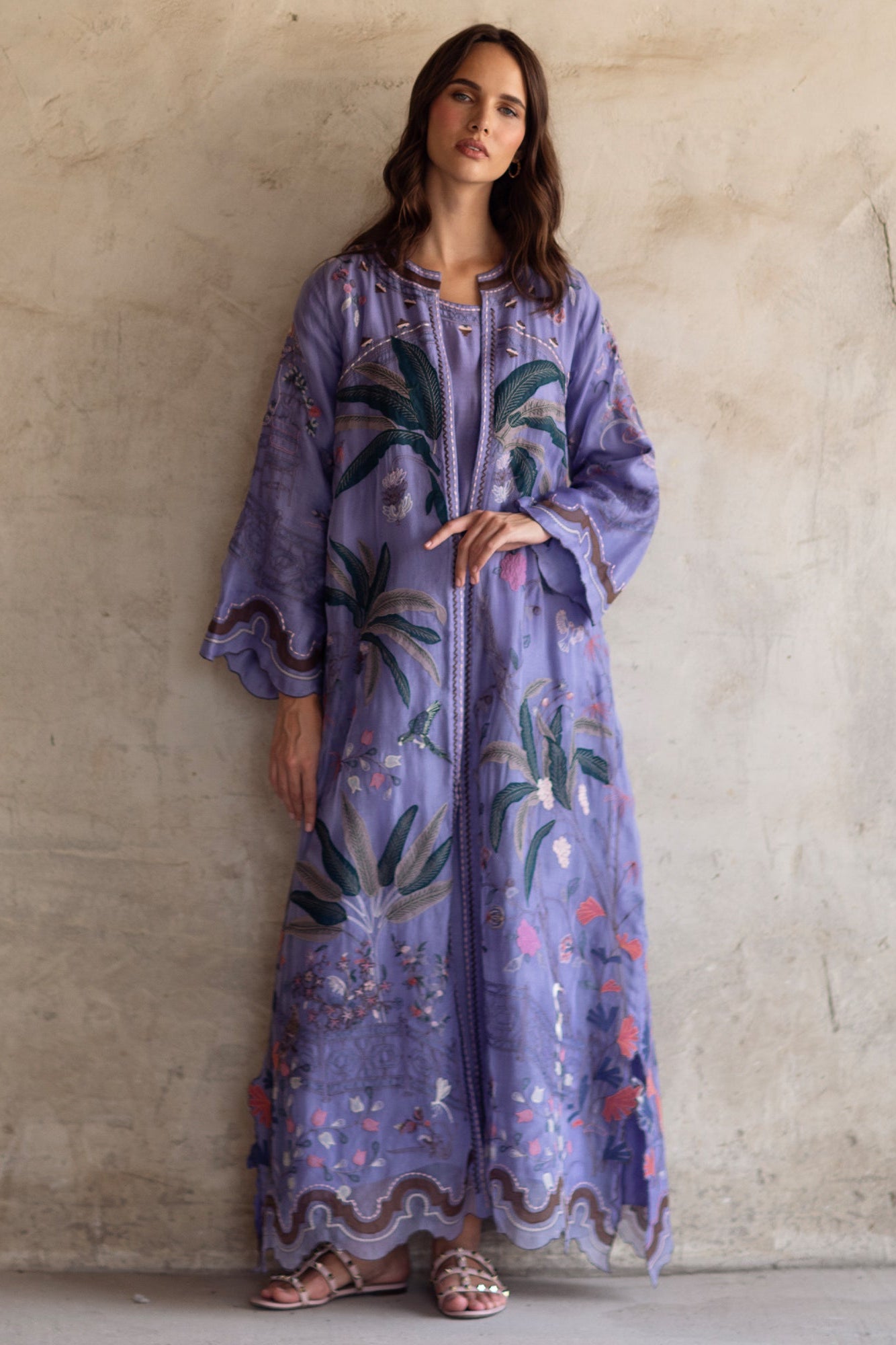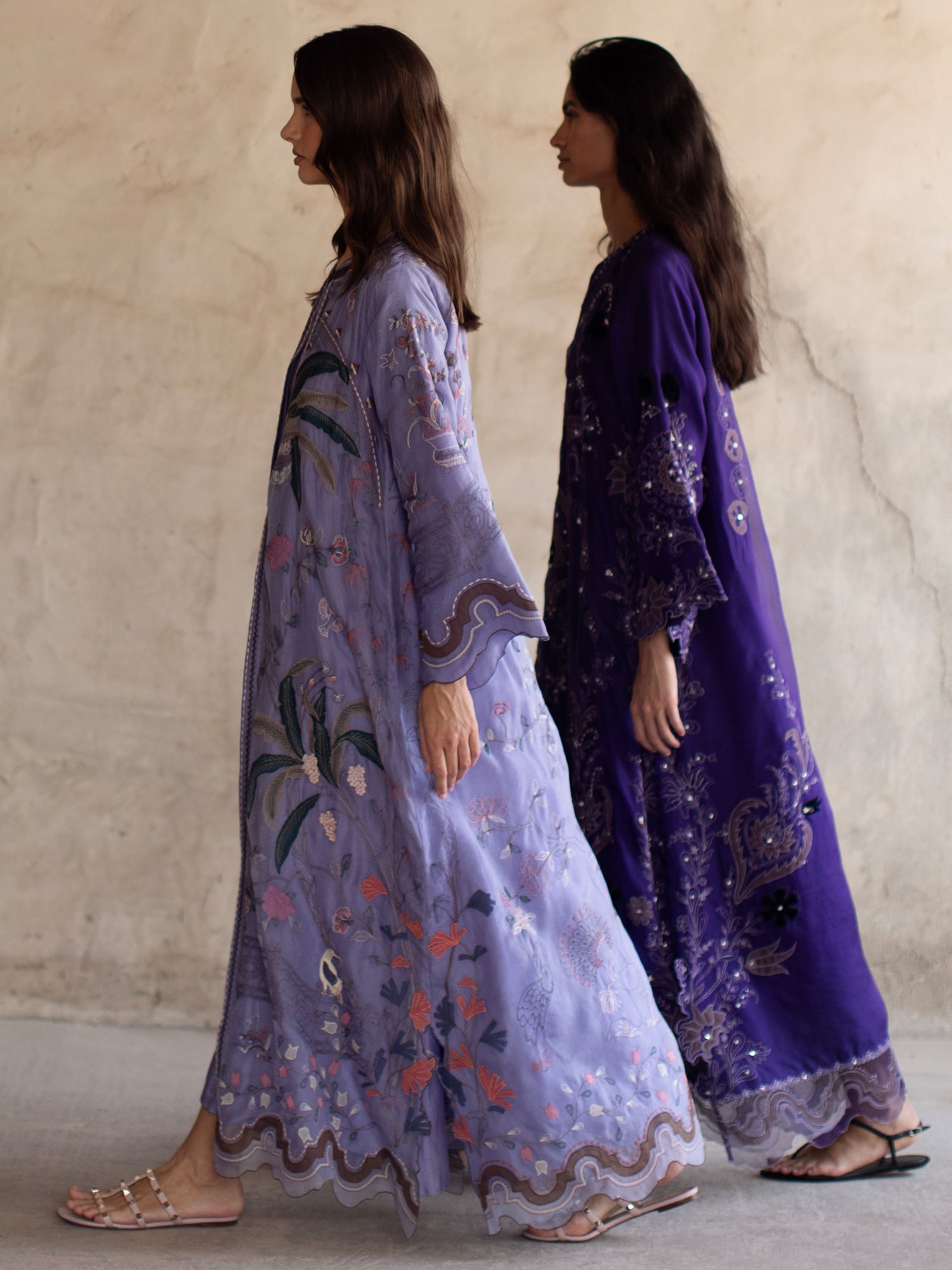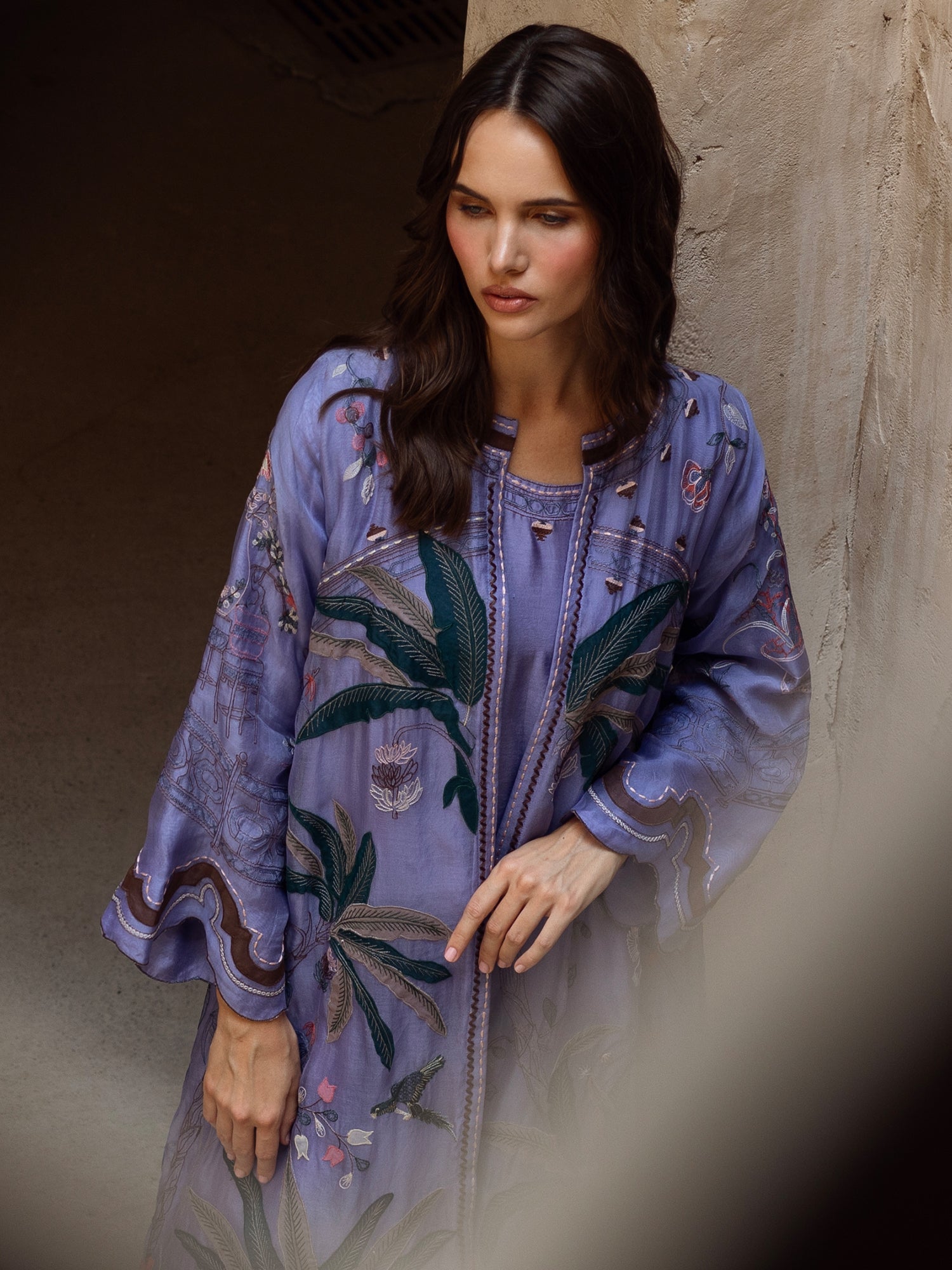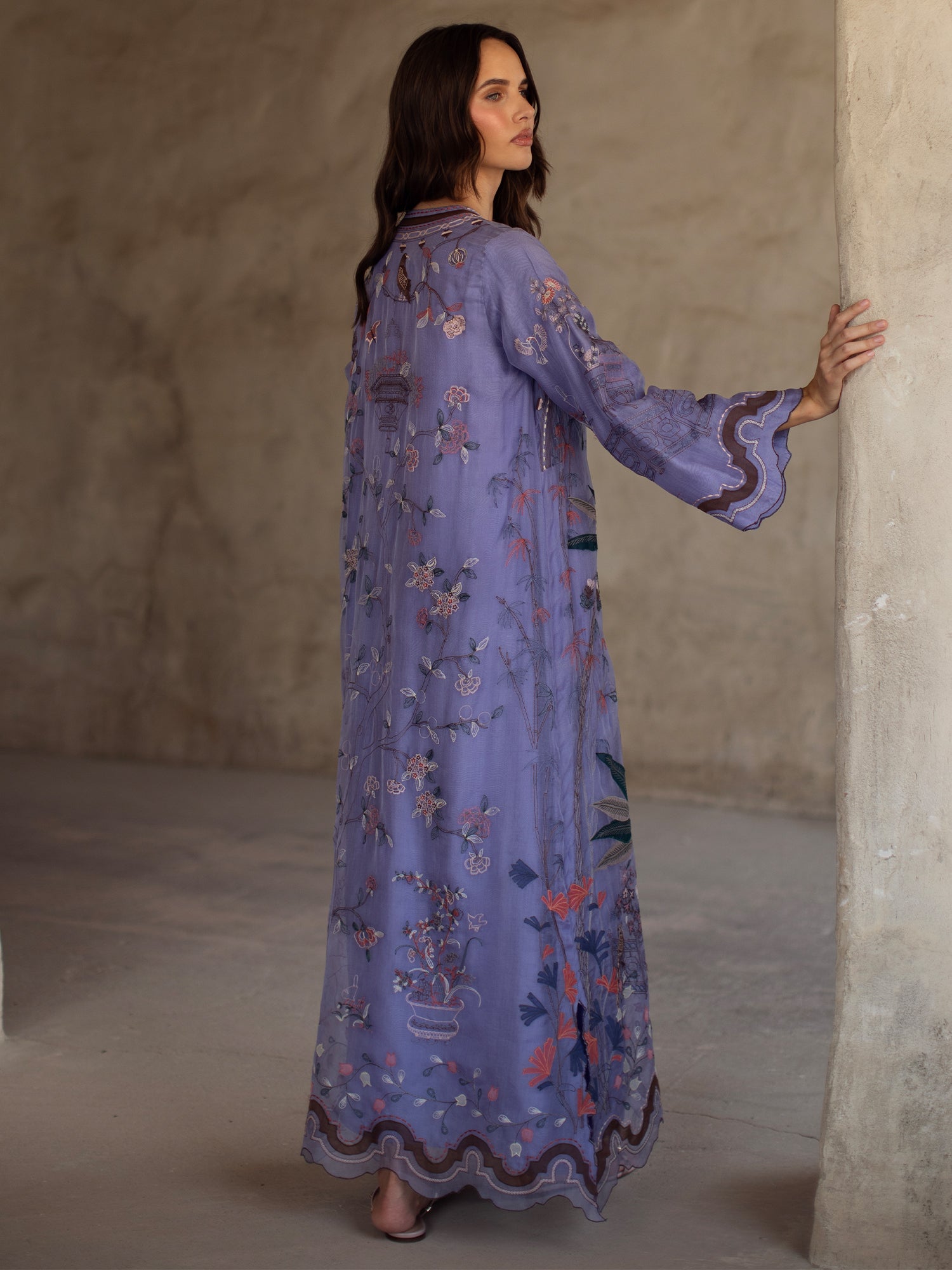 Make a statement this festive season in our front open Jalabiya. Cut from periwinkle blue organza, it showcases fine multi-resham embroidery with applique work inspired by chinoiserie motifs, creating a timeless ensemble for any festive occasion.