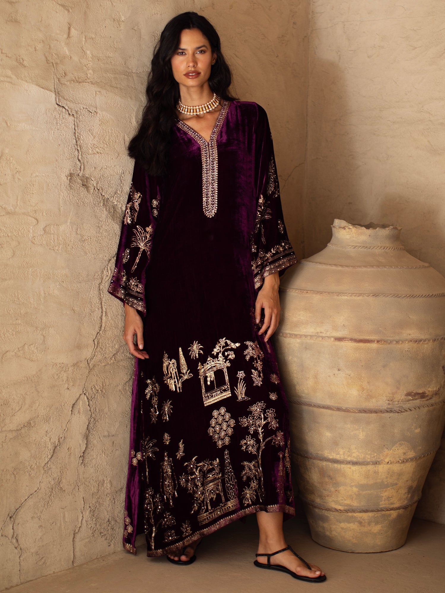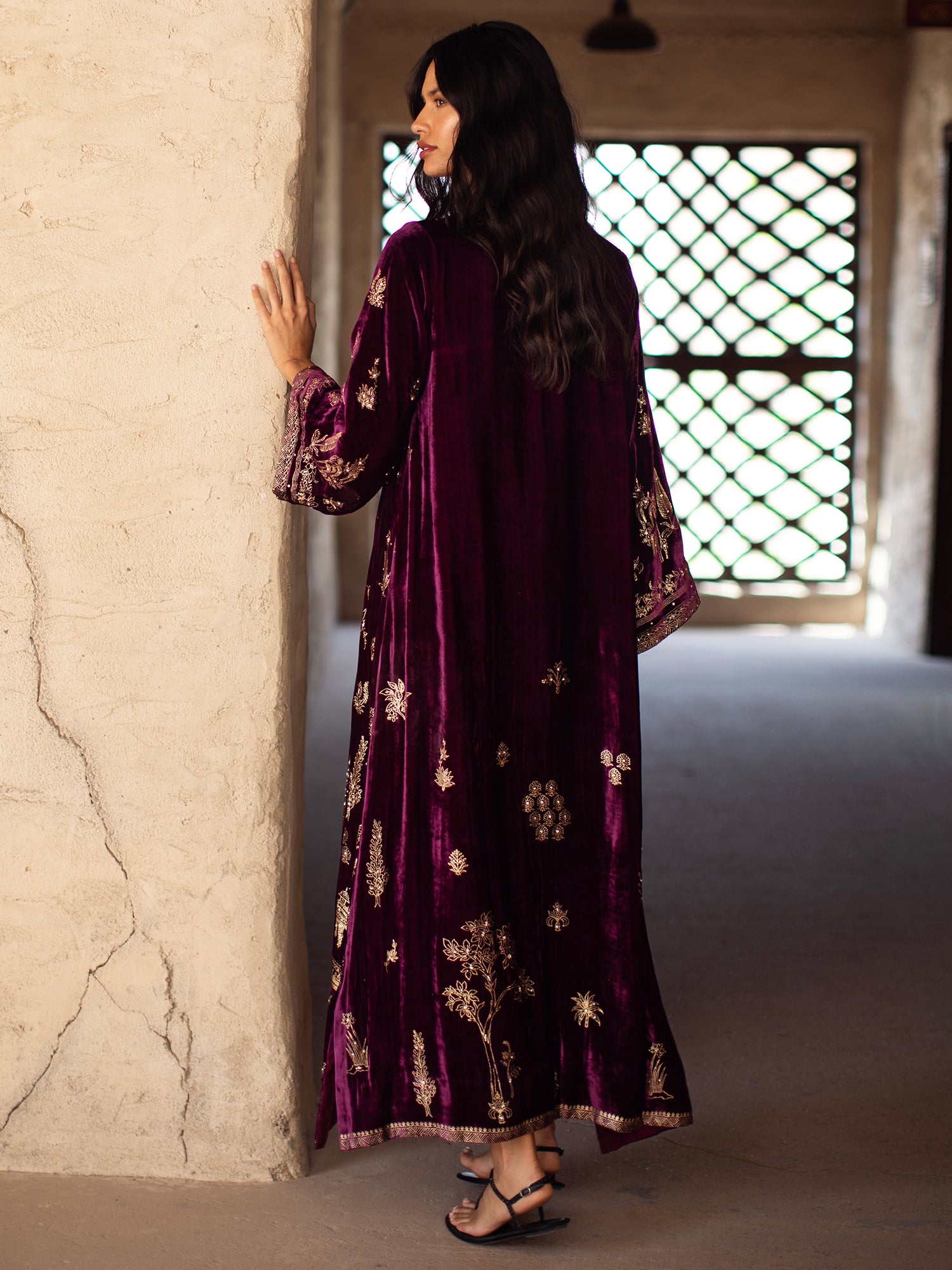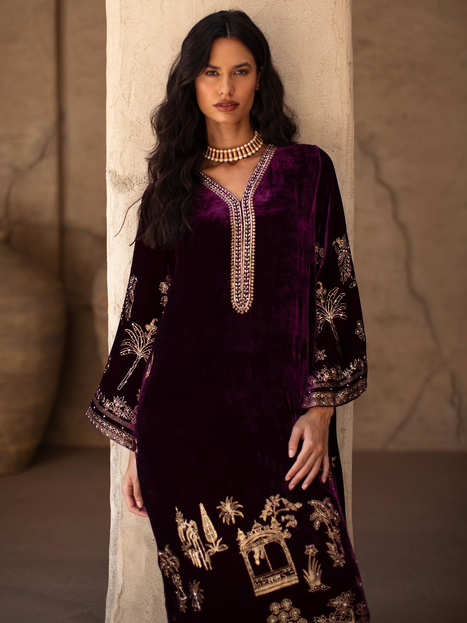 The skinny Jalabiya is tailored to perfection for all your soirées. Crafted from aubergine velvet, it showcases foil print with jewelled work inspired by Mughal motifs. A timeless ensemble for any festive occasion.