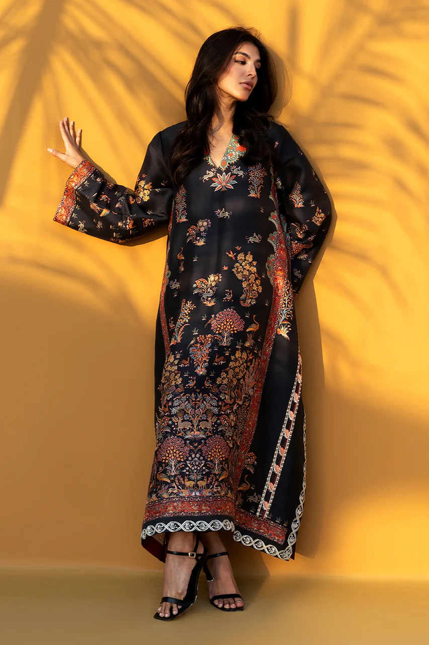 A long shirt creates a striking silhouette in a deep ebony hue. Crafted from pure raw silk, the fabric unfolds a rich tapestry of burnt orange, saffron, and crimson shades. The V-neckline introduces a narrative of wildlife motifs, while the wide, flowing sleeves are finished with a bold, burnt orange contrasting border. Defined by its fluid movement and maximalist pattern, this ensemble epitomizes opulent elegance.