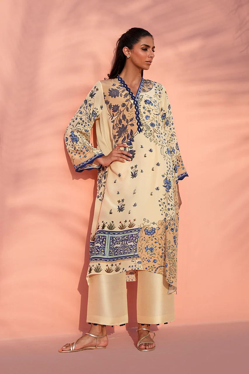 A relaxed crepe shirt in soft cream tones is brought to life with intricate botanical motifs in deep azure. The silhouette features fluid lines and wide sleeves, accented with contrasting scalloped borders and a patterned neckline for subtle definition. Finished with a statement printed hem panel, the design balances ease with visual depth. Paired with matching pure rawsilk culottes detailed with soft pleats, the look feels effortlessly composed.