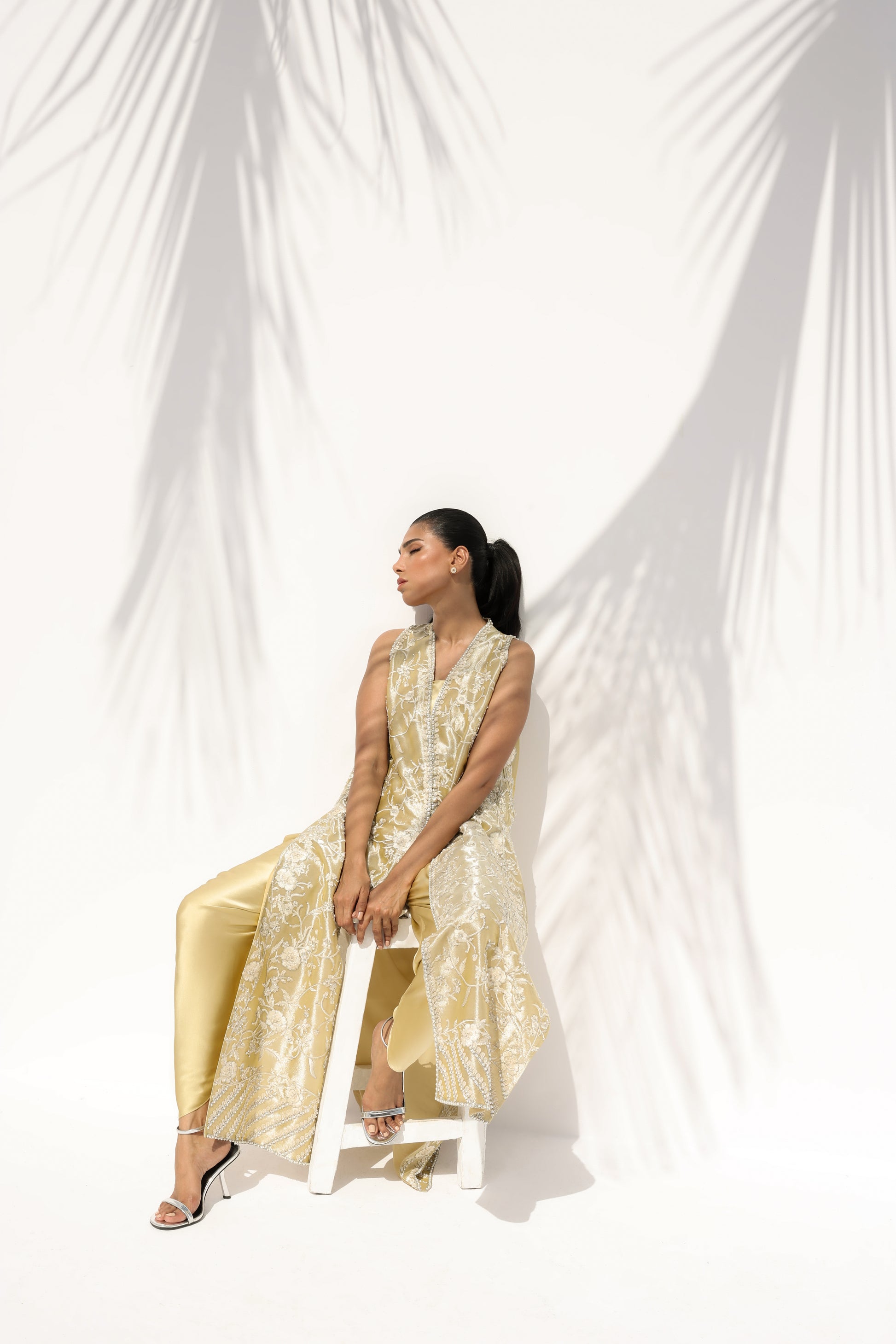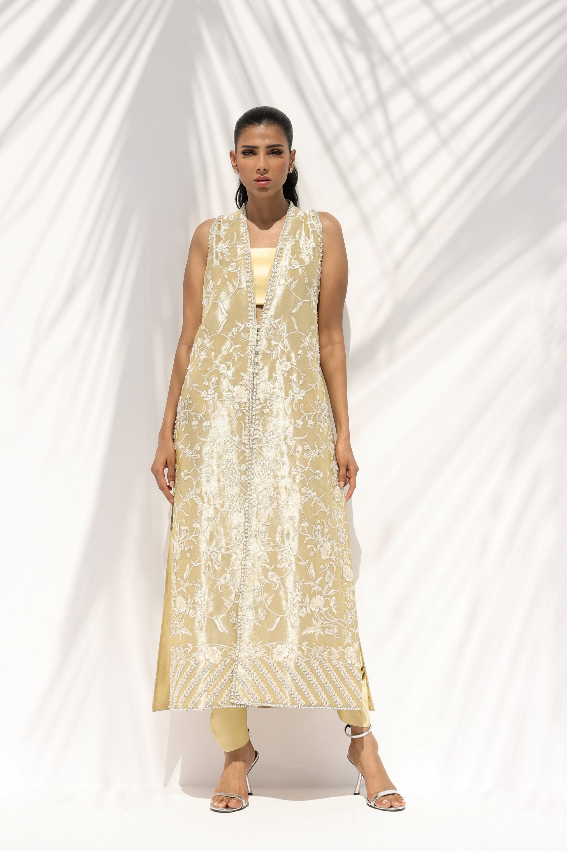 This radiant creation in soft butter yellow exudes timeless elegance, with intricate floral embroidery that dances across the fabric in delicate swirls of ivory and silver. The long, open-front silhouette is accentuated with exquisite detailing along the hem and front placket, striking a perfect balance between understated opulence and modern allure. A sleek charmeuse tube top and draped shalwar complete the look, complementing the jacket’s luminous texture with graceful ease.