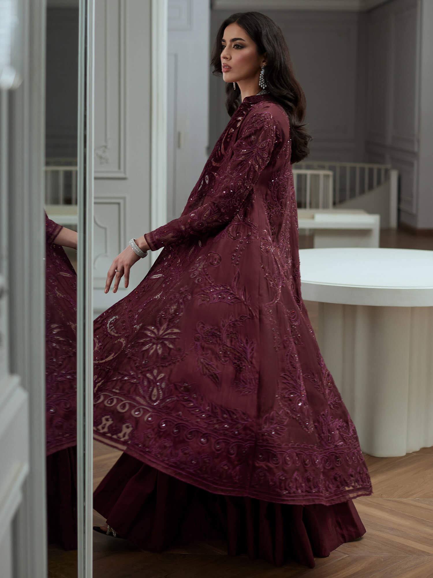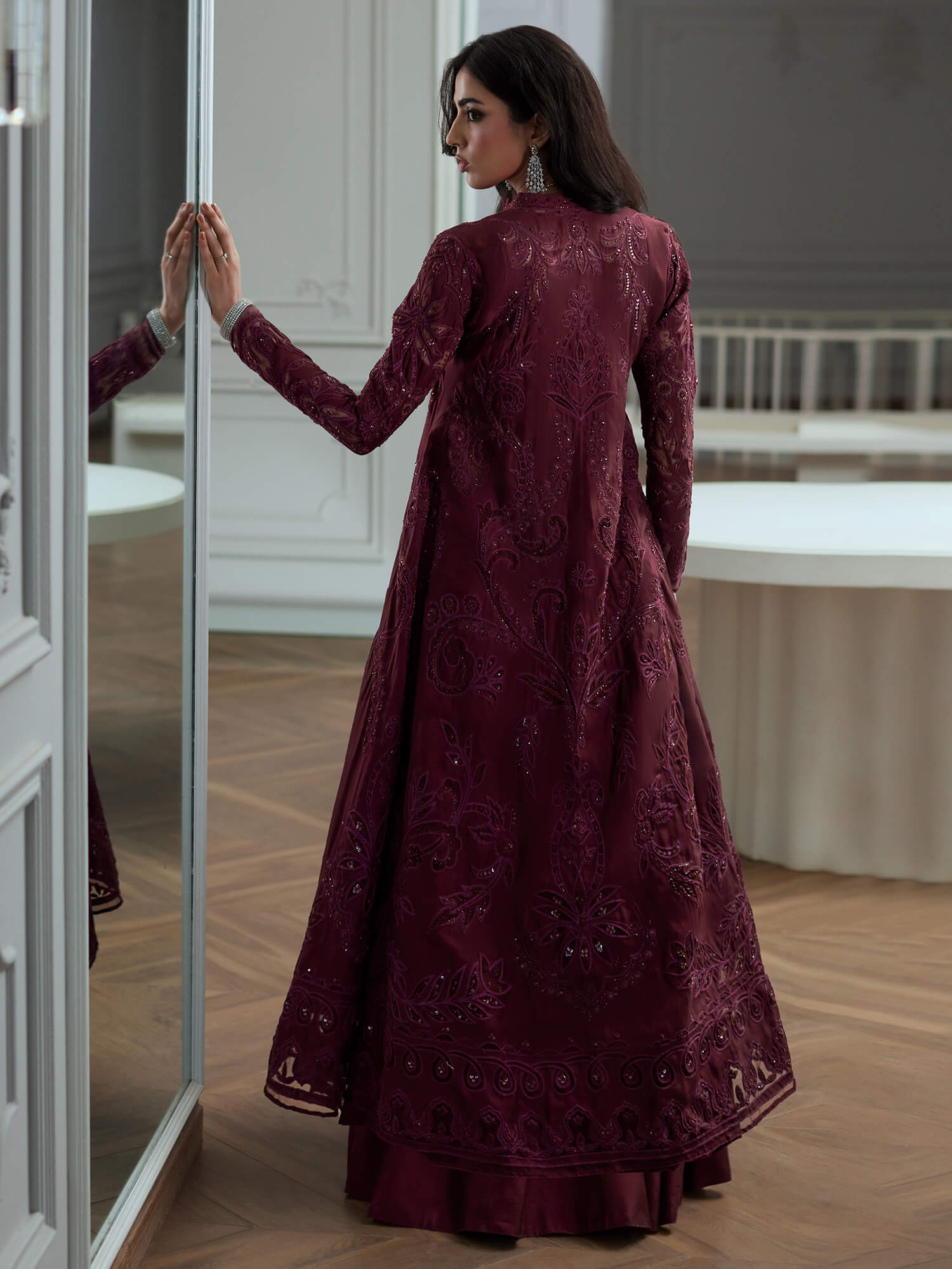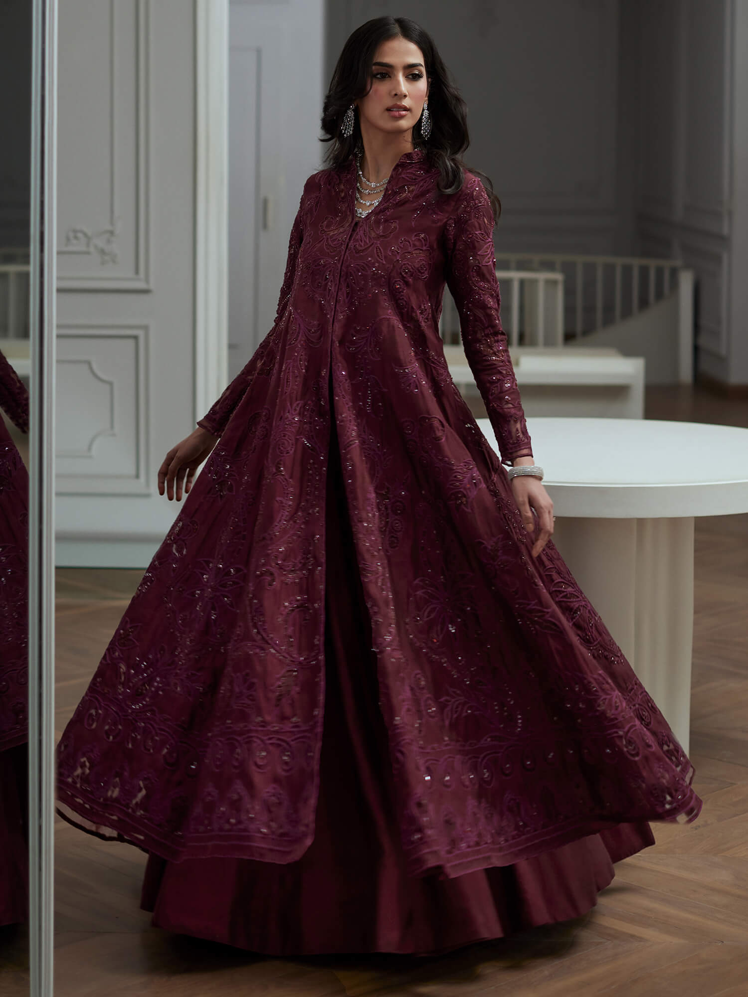A perfect blend of old-world charm and new-age sensibilities. Our deep red wine kalidar showcases reverse appliqued botanical and Mughal flora motifs with self on self jewelled work. It is paired with a blouse and a matching lehenga making it a perfect choice for evening soirees.