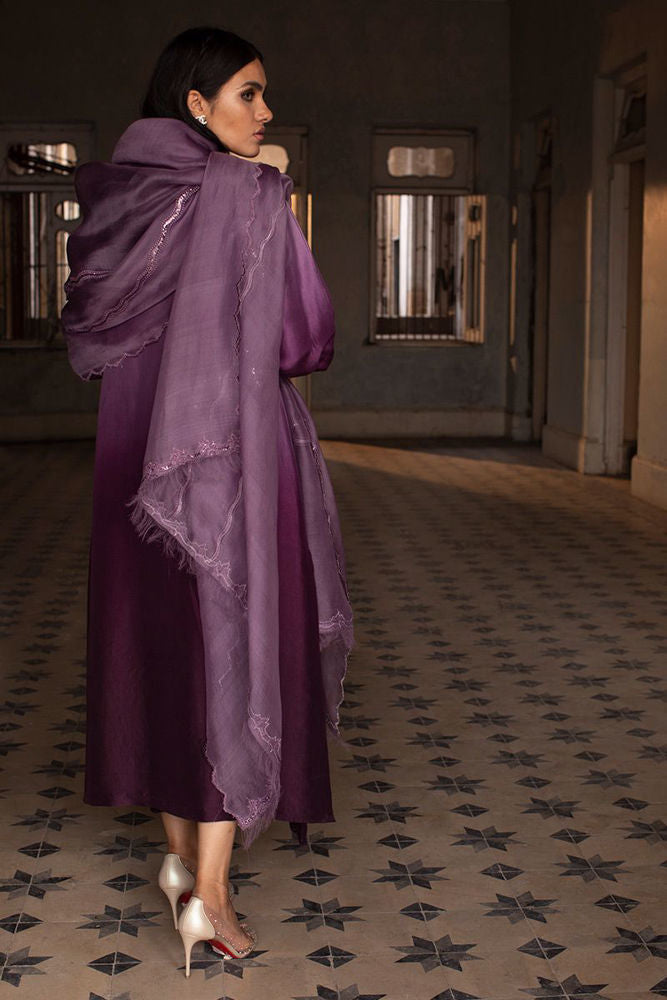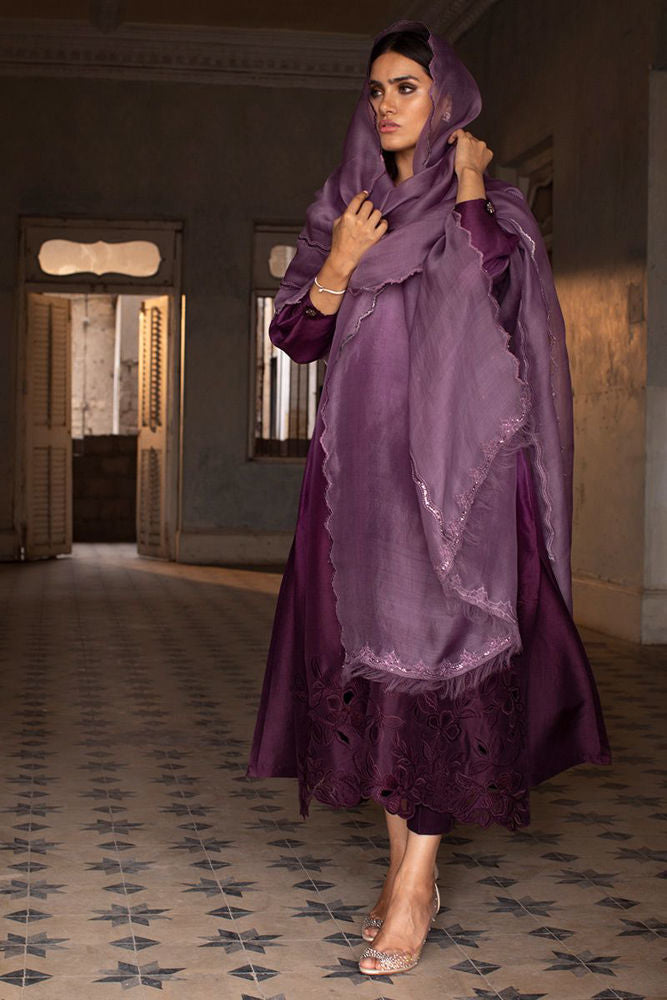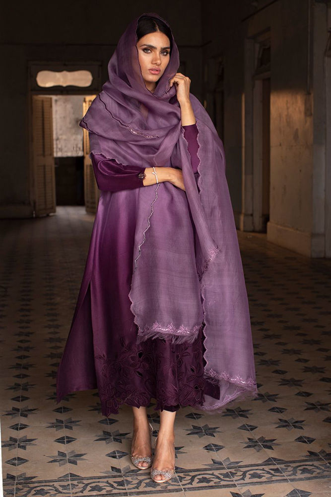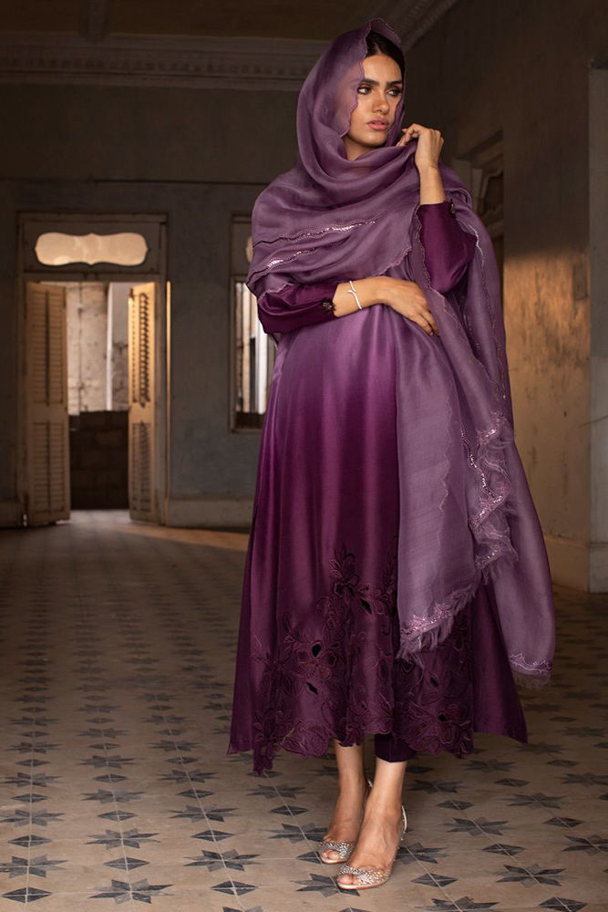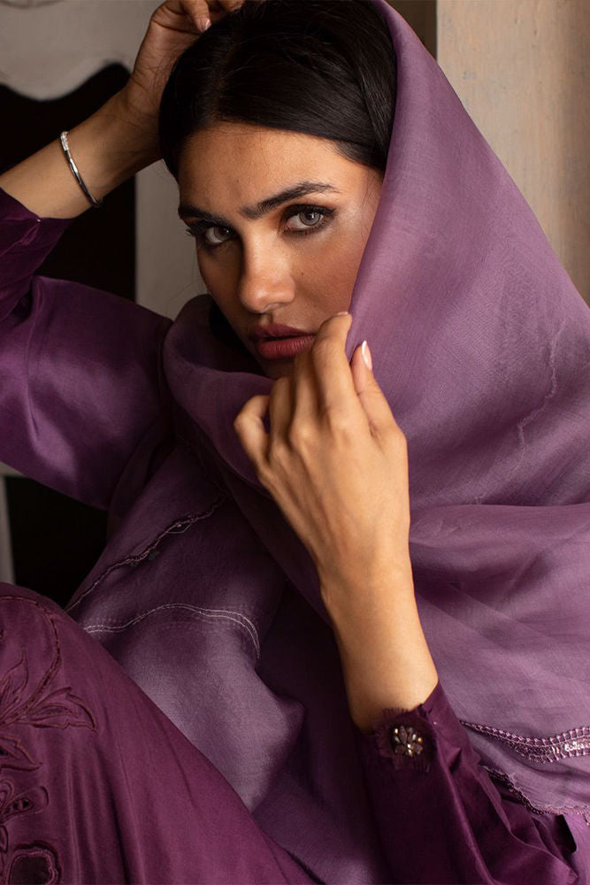 Craftsmanship par excellence, this sunset purple pure raw silk shirt features threaded flowers of resham and organza scattered over the hemline blossoming to the tunes of spring. Same color pure raw silk pants can be purchased at additional cost.