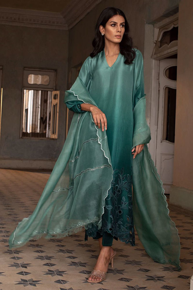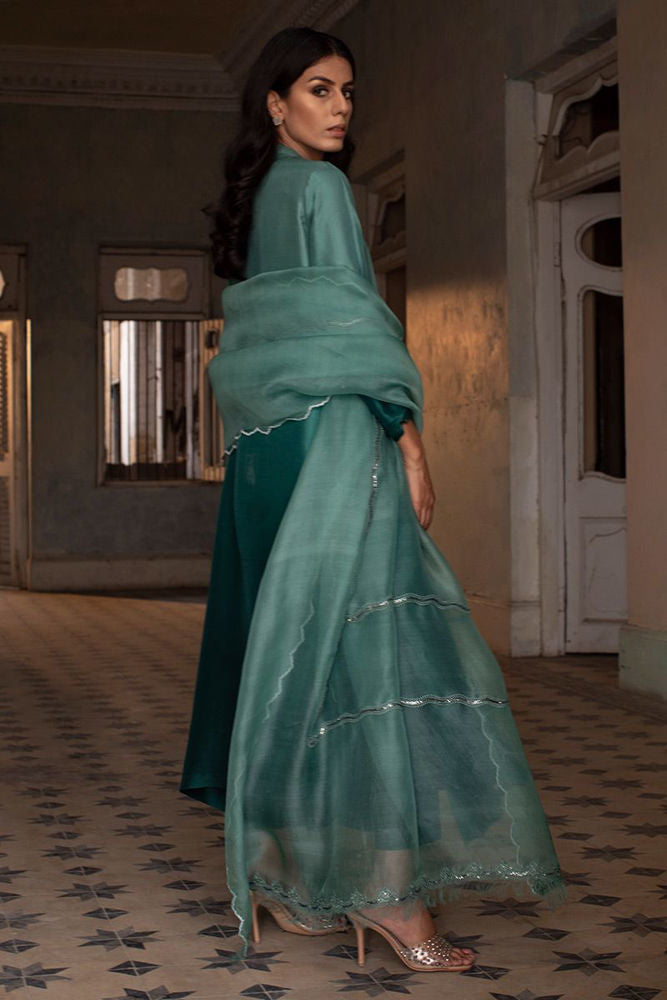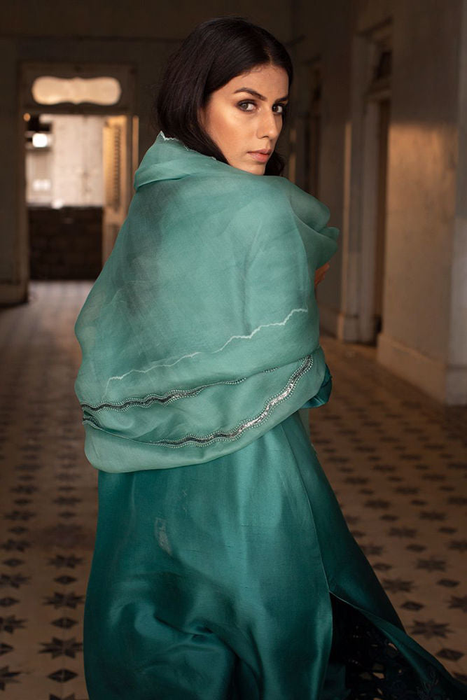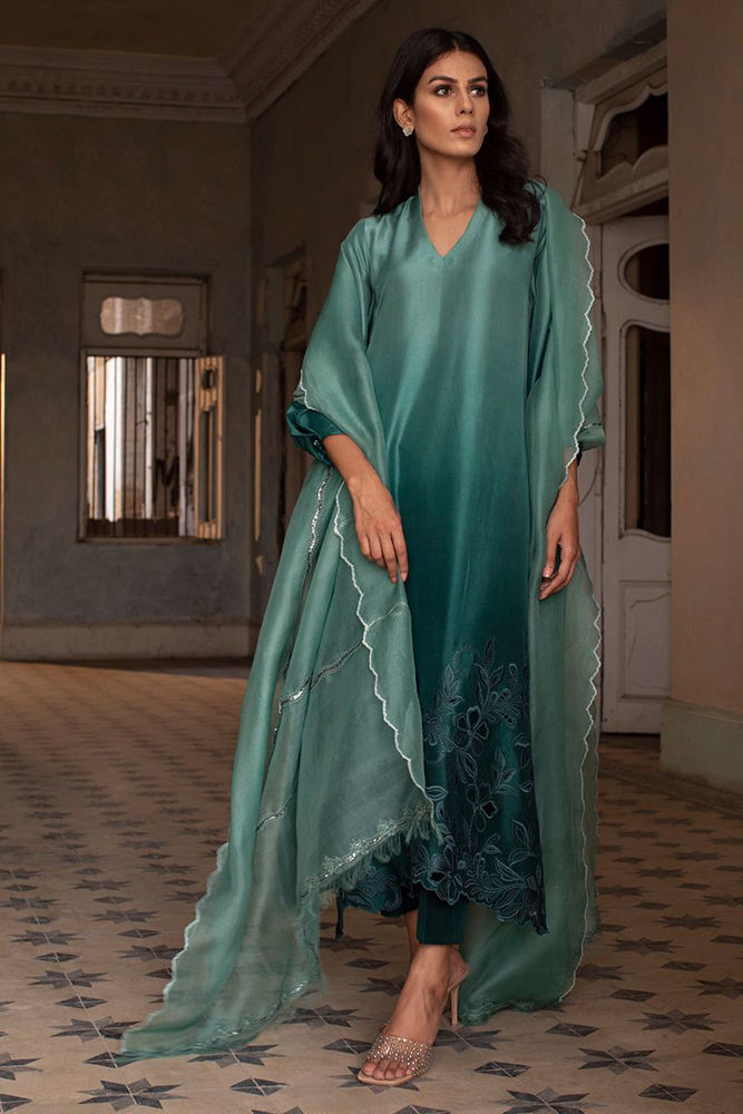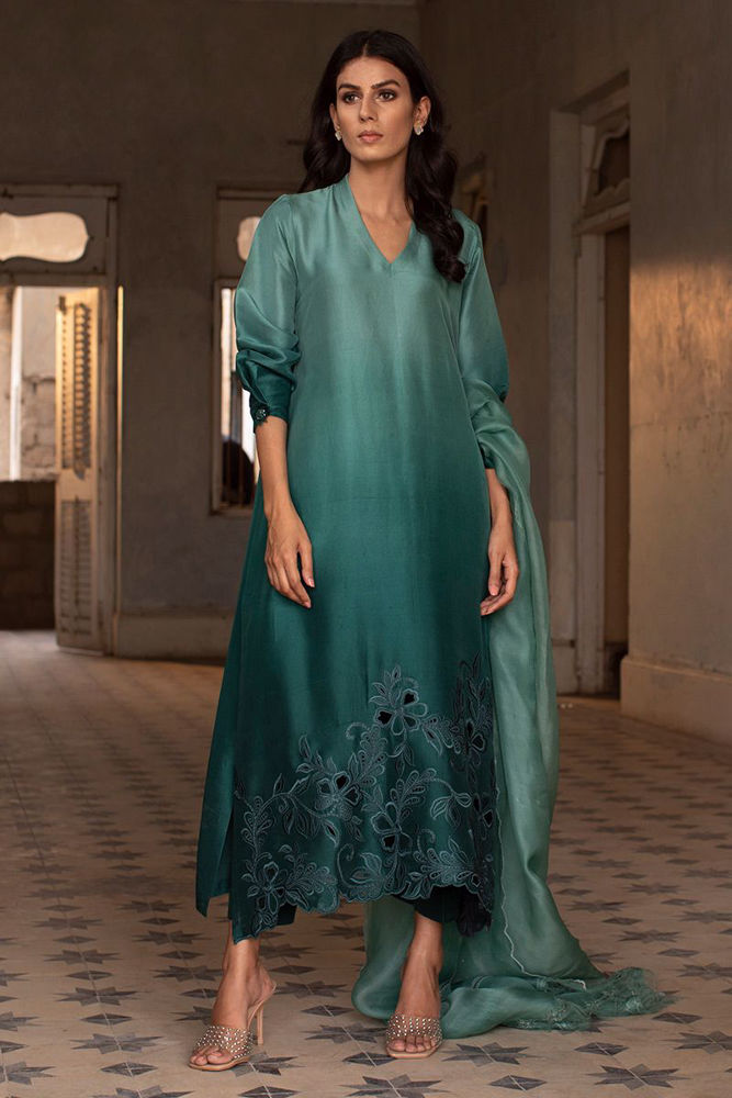 Craftsmanship par excellence, this antique green pure raw silk shirt features threaded flowers of resham and organza scattered over the hemline blossoming to the tunes of spring. Same color pure raw silk pants can be purchased at additional cost.