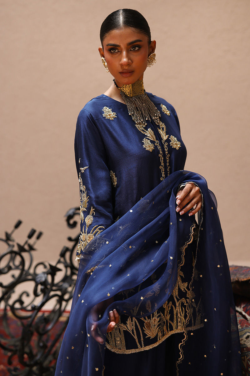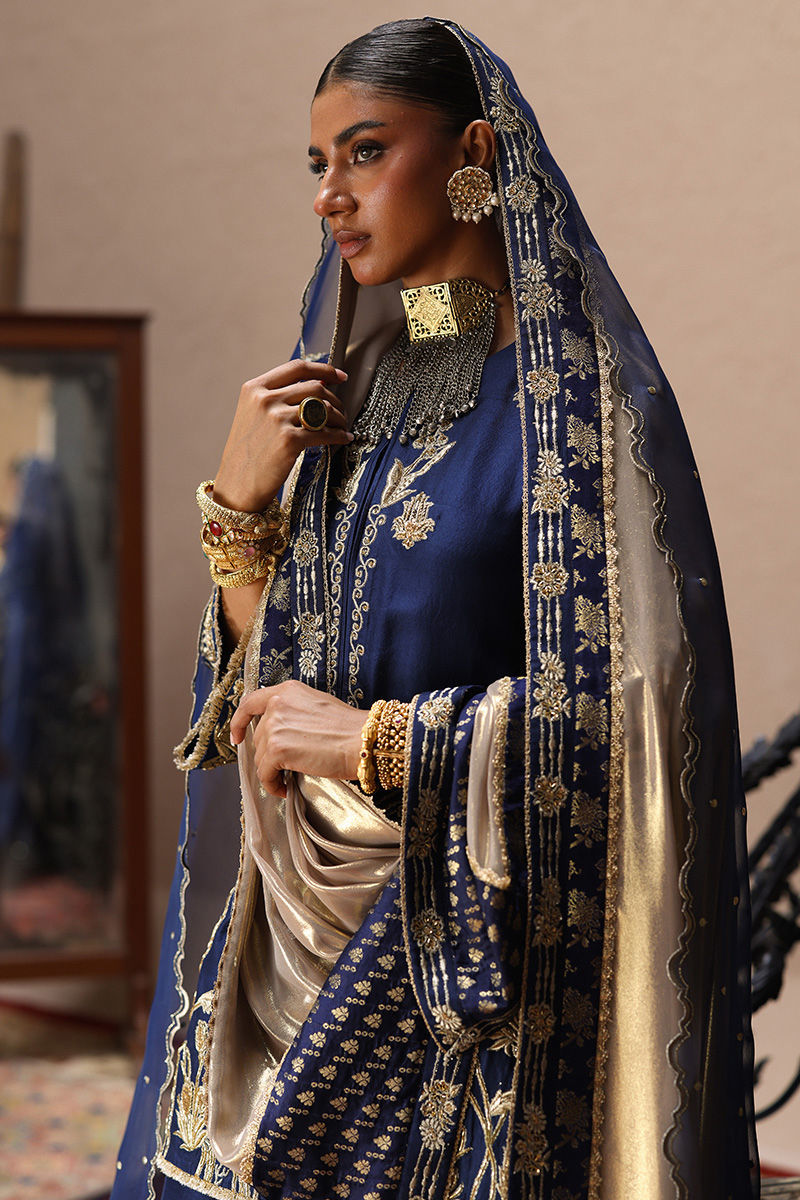 This deep blue ensemble in pure 80gms raw silk features a short shirt with pockets, richly adorned with light and dark gold zari embroidery, antique lame, and intricate zardozi work including kora, dabka, cutdana, stones, pearls, nakshi, sequins, and silver bird motifs on the front, sleeves, and back. Paired with farshi culottes detailed with sequins at the hem, the look is completed with your choice of dupatta: a pure silk with a four-sided gold border, an organza with scalloped zari embroidery, sequined handworked border and chan, or a regal gold lame with zari embroidery, banarsi finishing, and handworked borders.