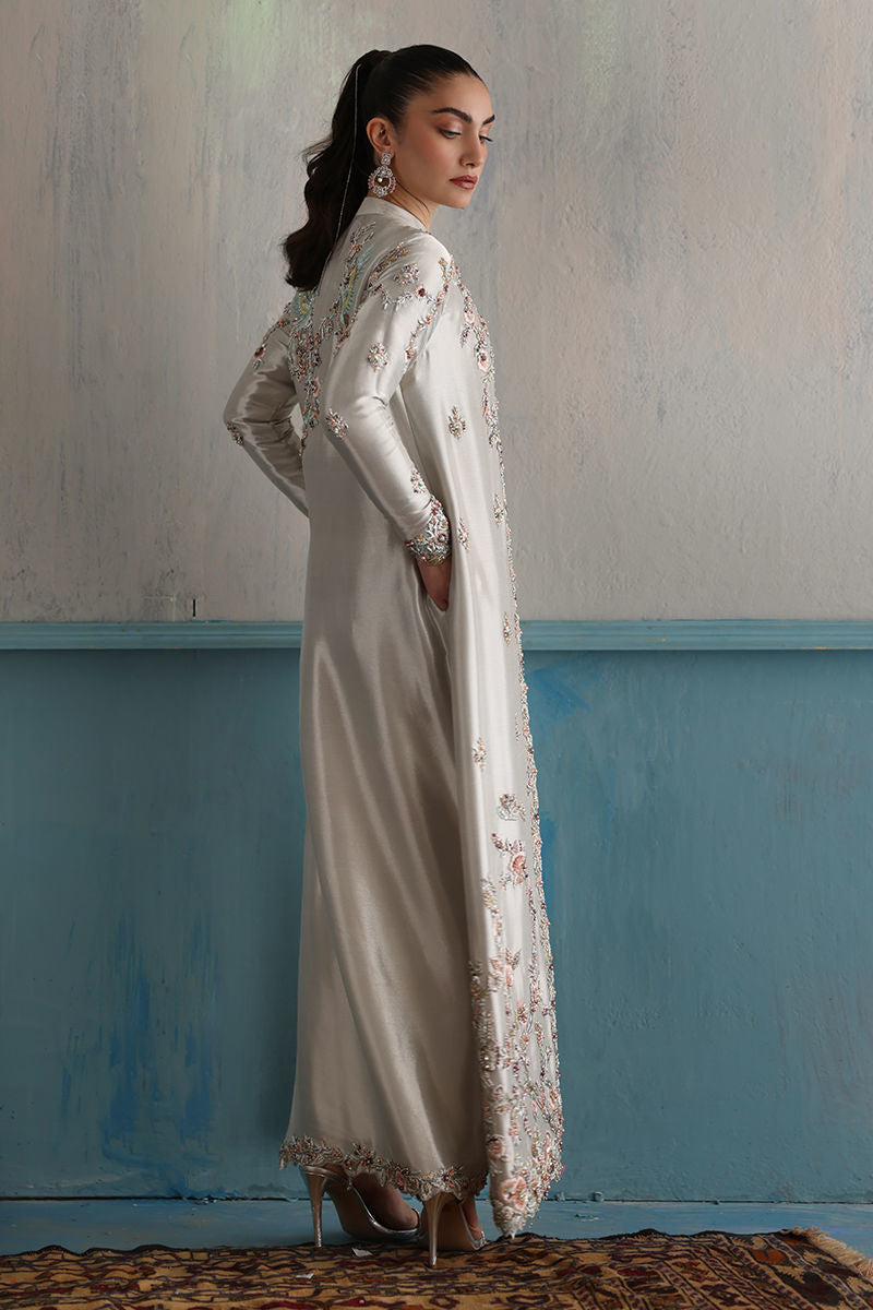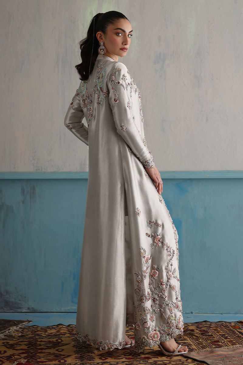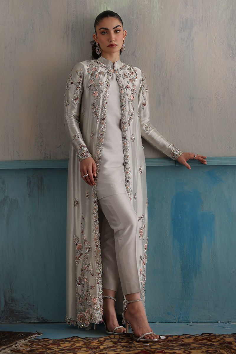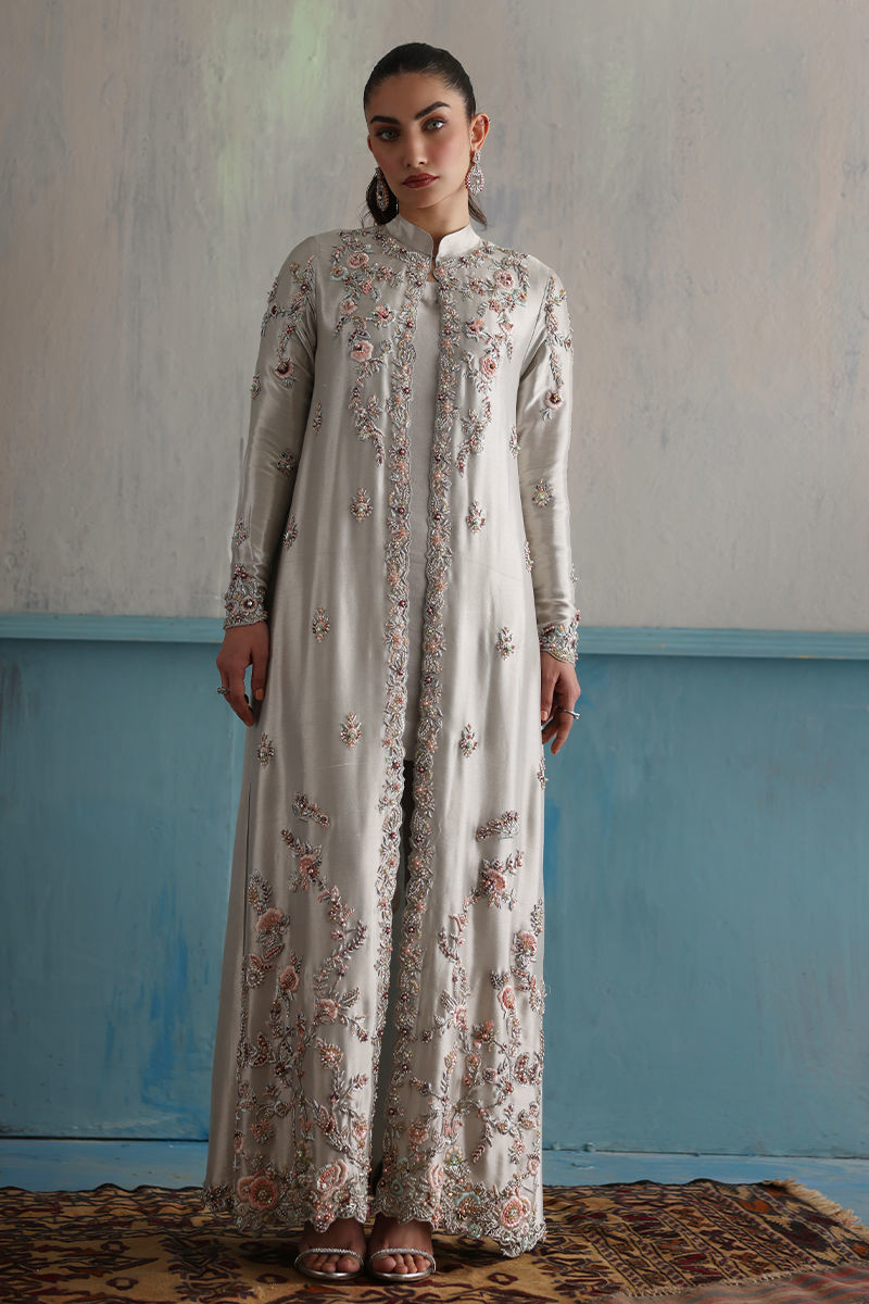 Drape yourself in luxury with the "Celestial Silver Lame Jacket." The outer layer is crafted from pure silver lame, the inner layer, tailored from 80 gms raw silk, adds a touch of opulence. The jacket is adorned with a symphony of handwork, featuring sequins, crystals, pearls, stones, and dabka, meticulously embellished on the front, back, and sleeves. Complementing the jacket is a pair of pure raw silk straight pants, adding a modern touch to the ensemble. The pants harmonize seamlessly with the extravagance of the jacket. Length 55
