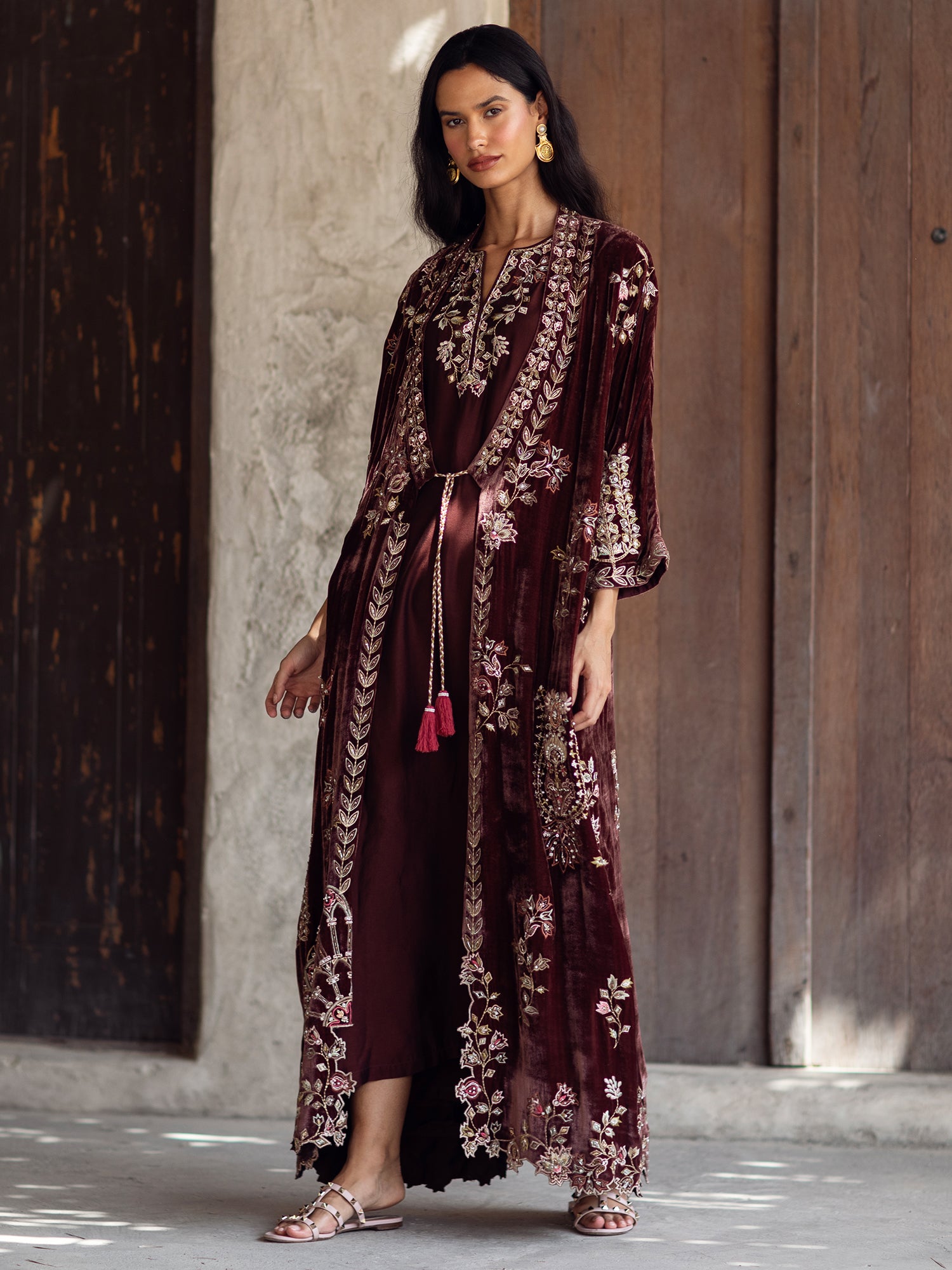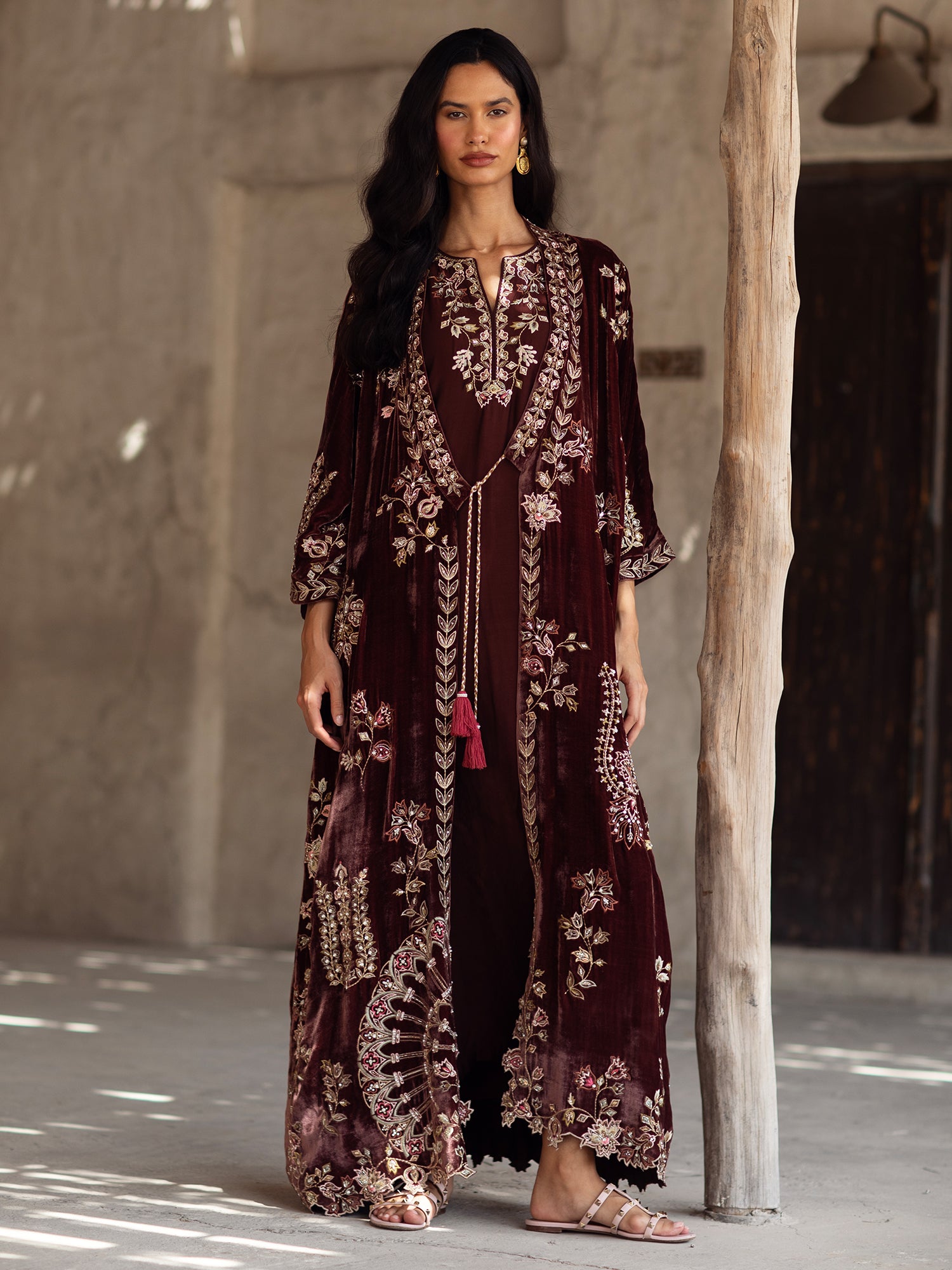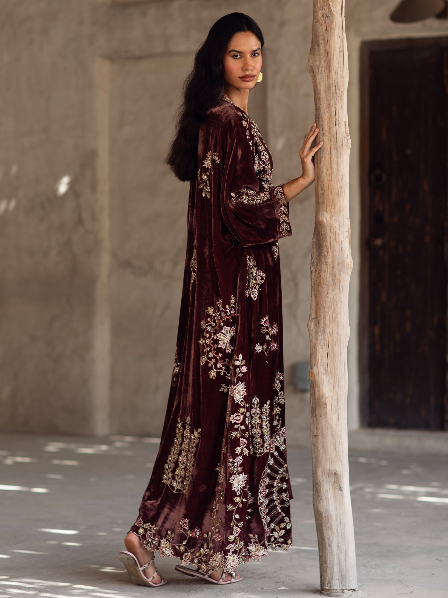 Our mahogany Laleh exudes timeless elegance and is tailored to perfection for all your soirées. Featuring fine zardozi work with multi resham embroidery inspired by Mughal and Jaipuri motifs, this Laleh is a timeless ensemble for any festive occasion.