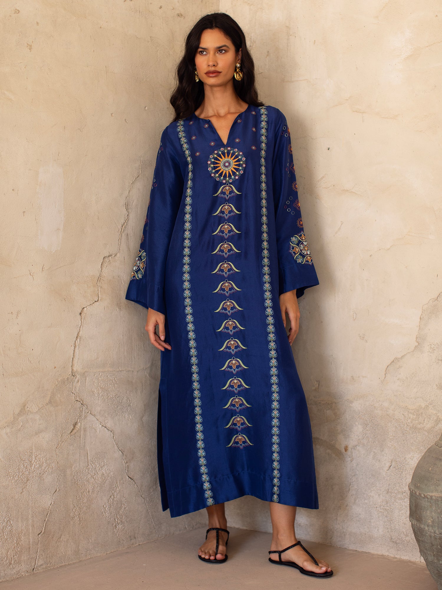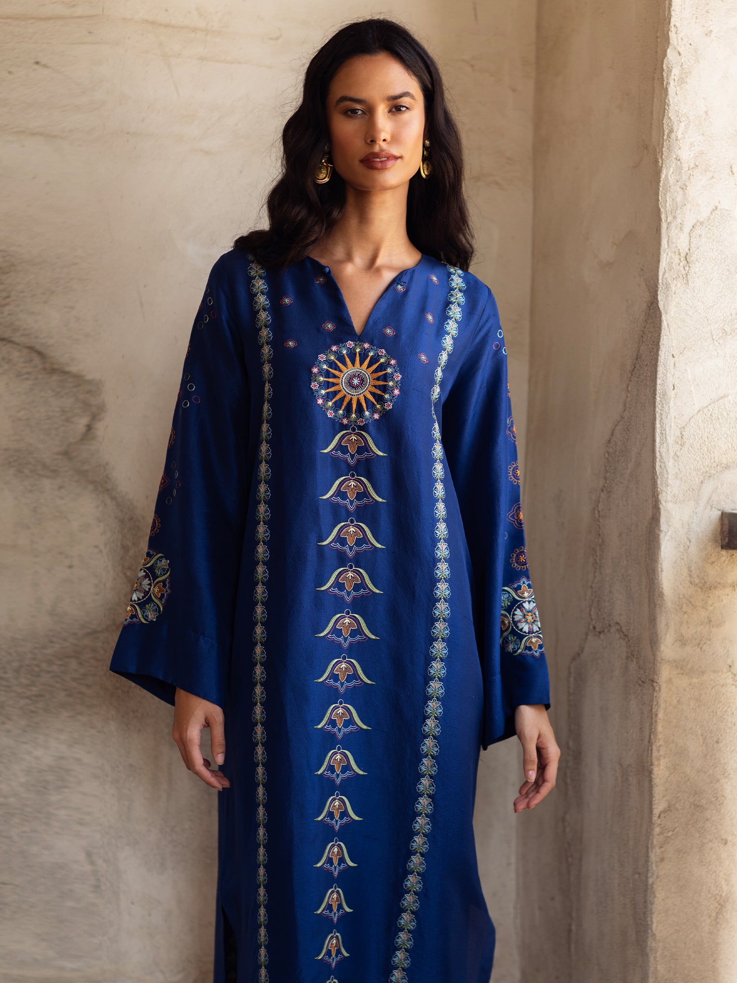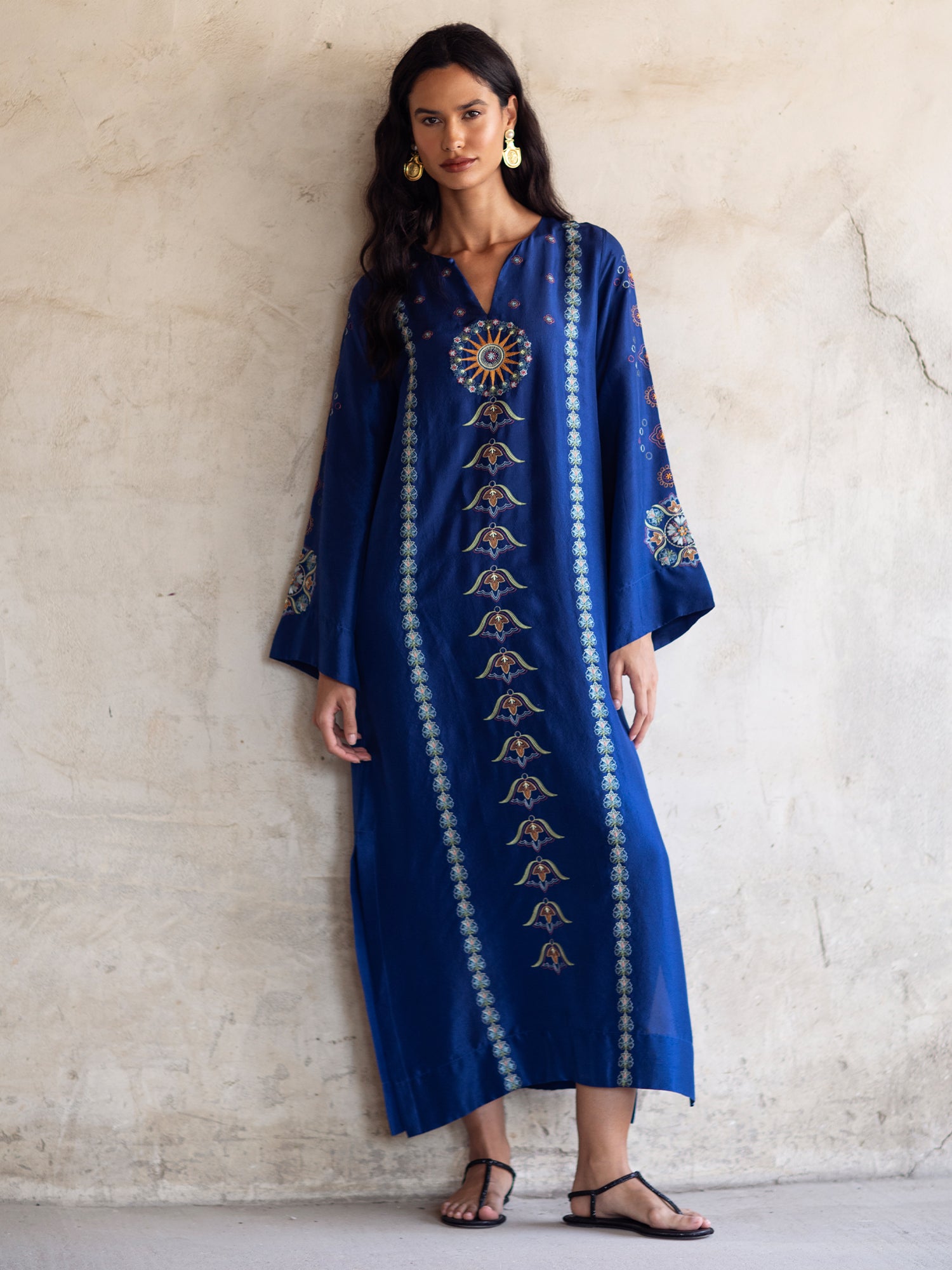 For the global nomad. Our electric blue raw silk Leia features fine multi hued aari embroidery in complementing accents inspired by suzani motifs, this versatile staple will be your favourite addition to your wardrobe this season.
