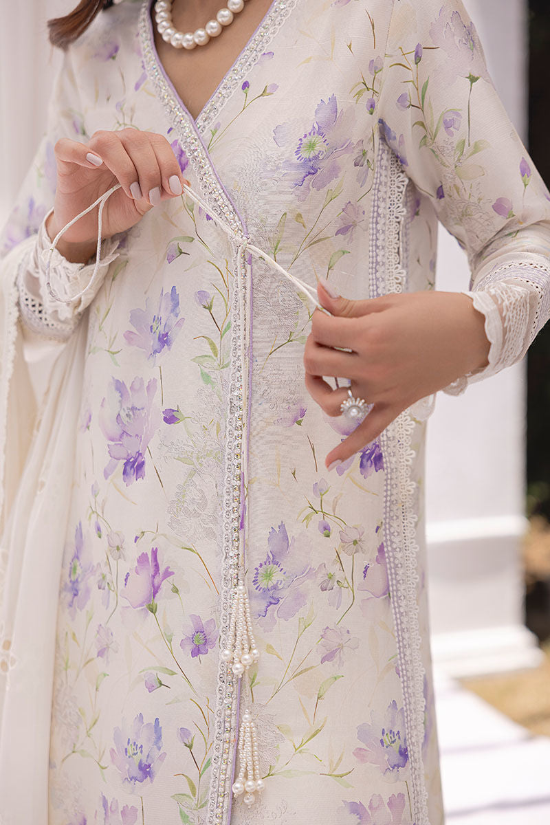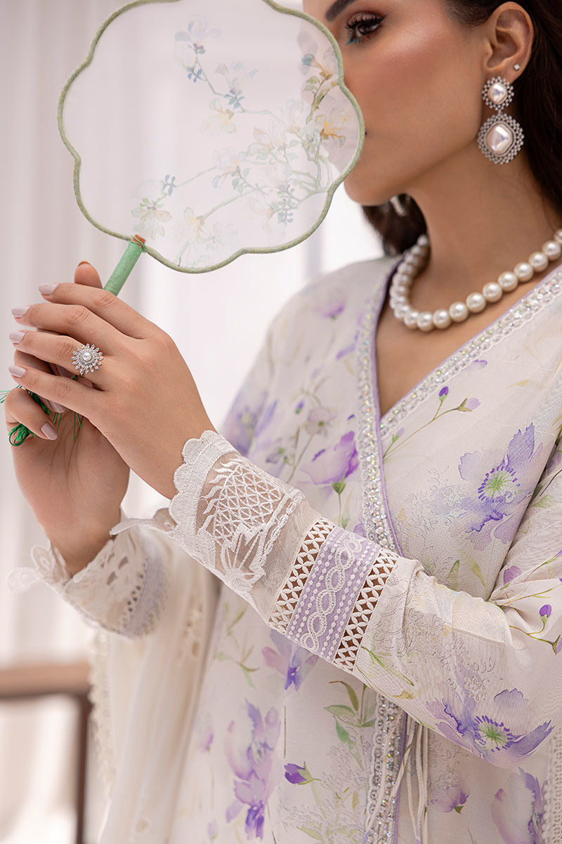 Lilac raw silk shirt in an angarkha style, printed with a soft floral digital pattern. The shirt is adorned with silver handwork along the neckline and borders, with matching laces that enhance the structure of the garment. A silk cutwork dupatta is included, decorated with lace detailing that aligns with the shirt’s design. The ensemble is finished with a silk crushed dhaaka, providing fluidity and ease of movement.