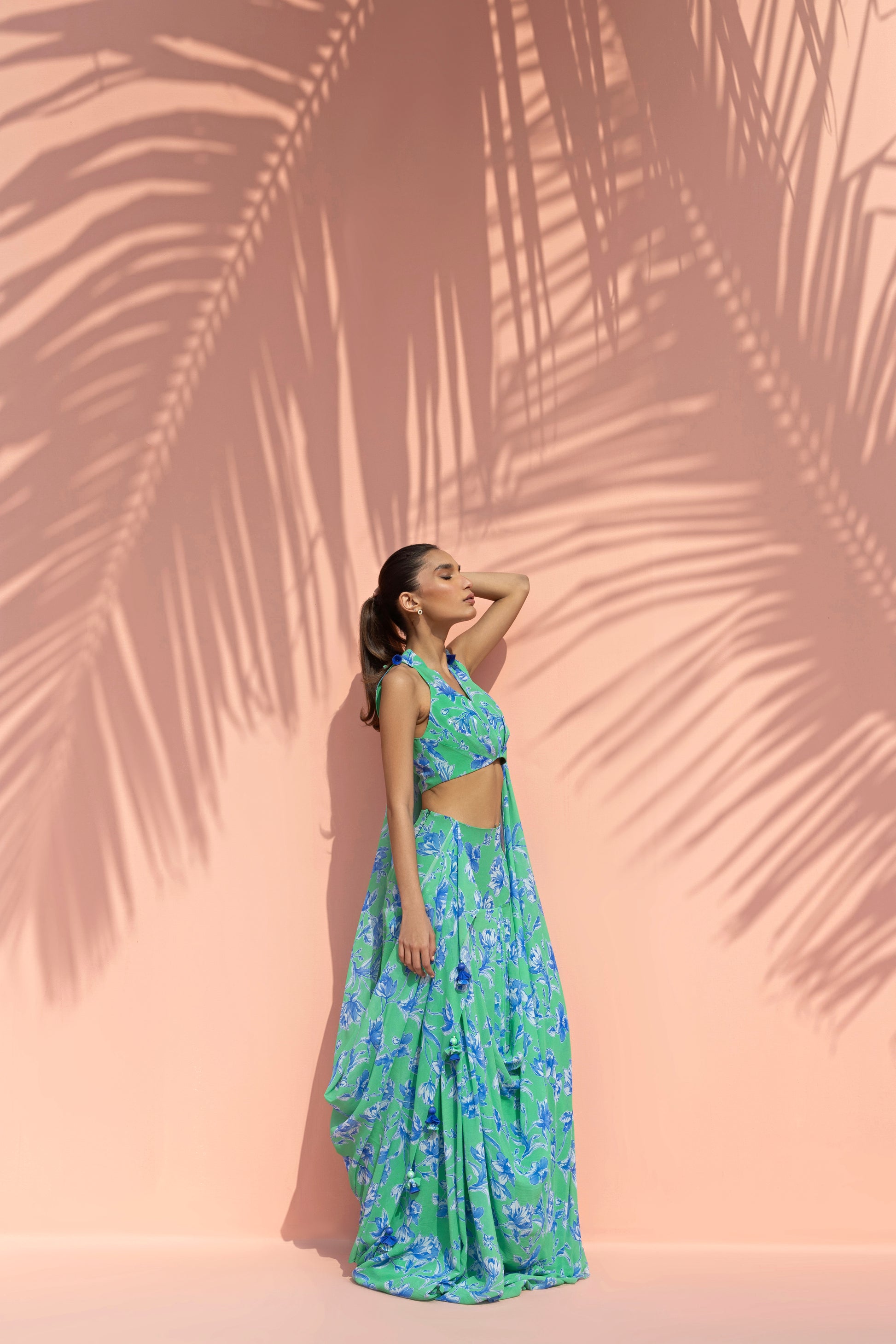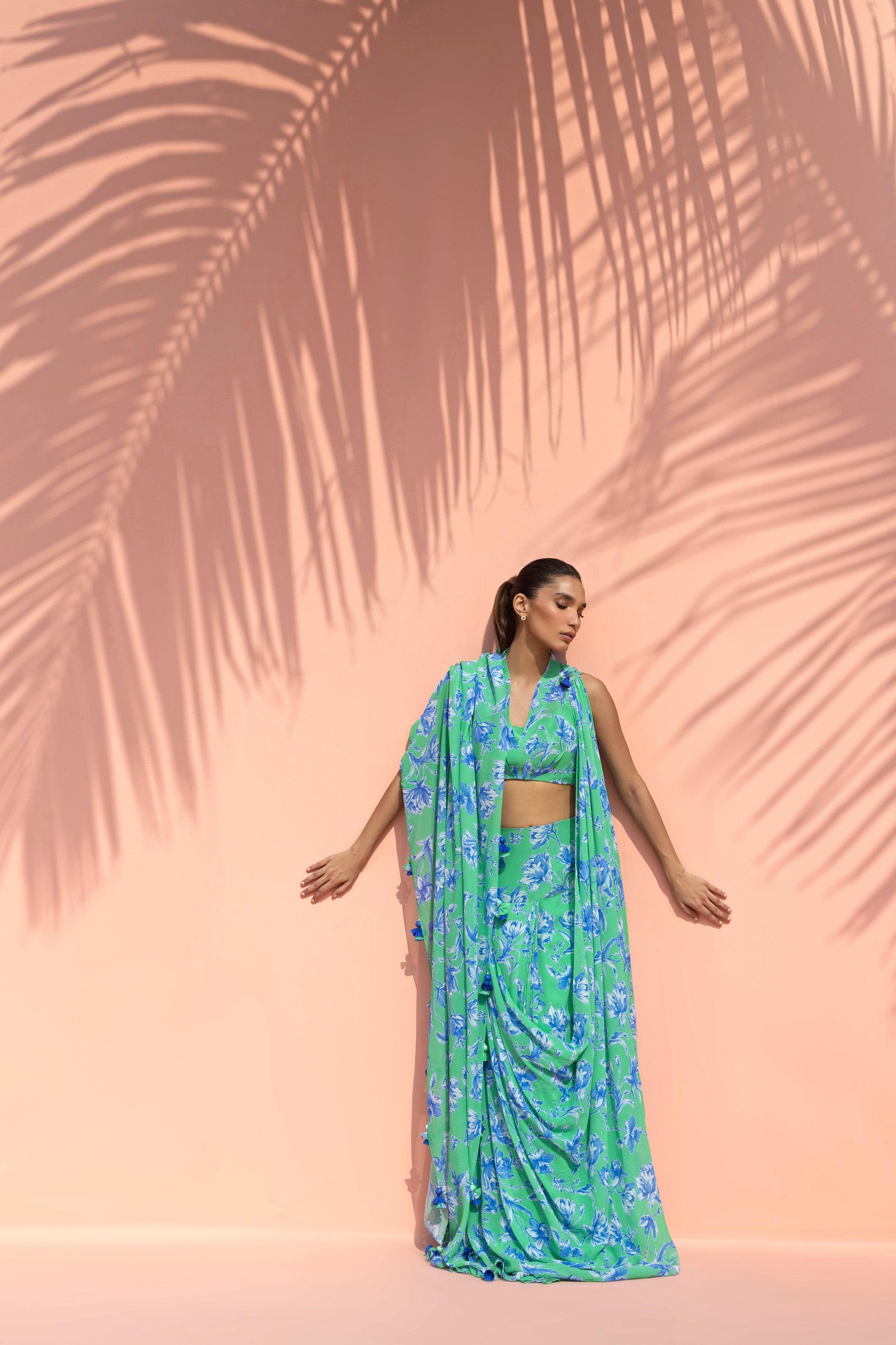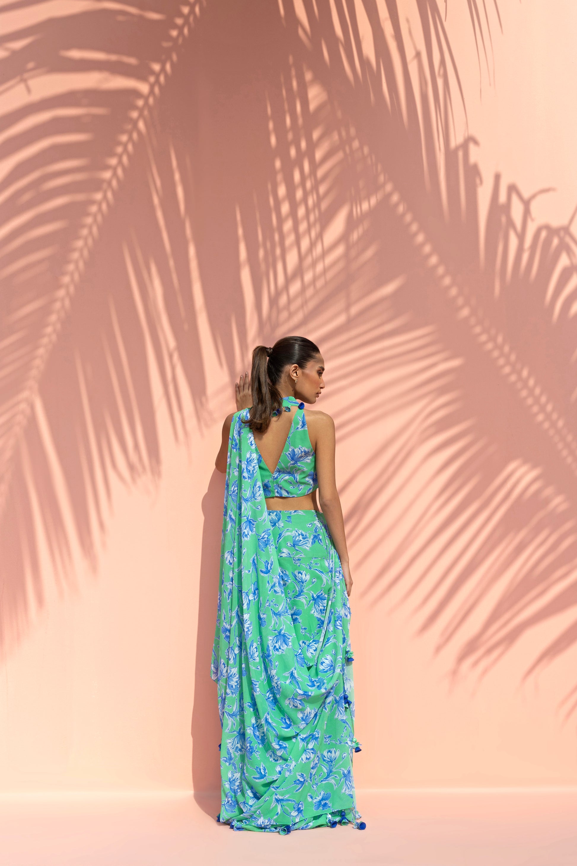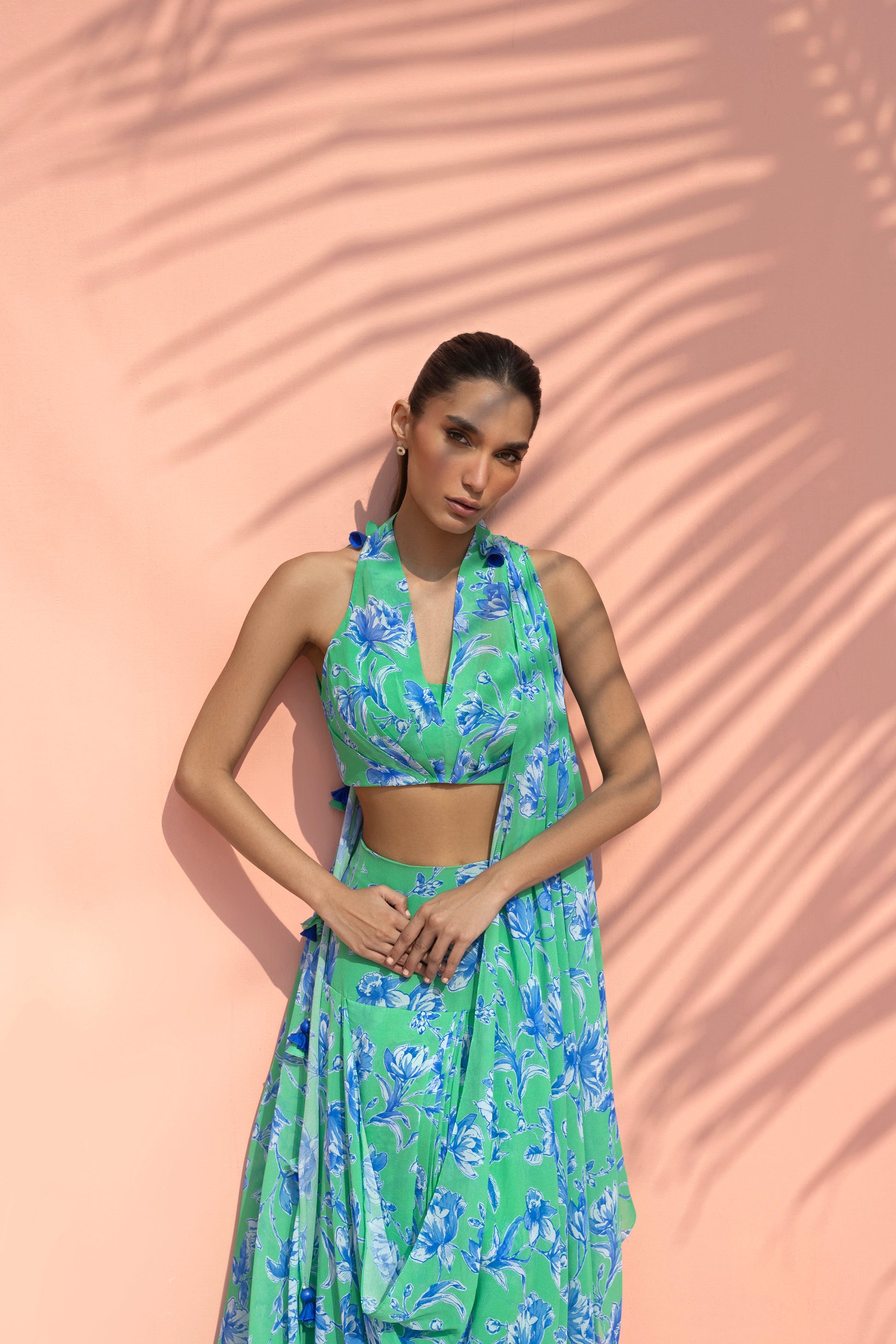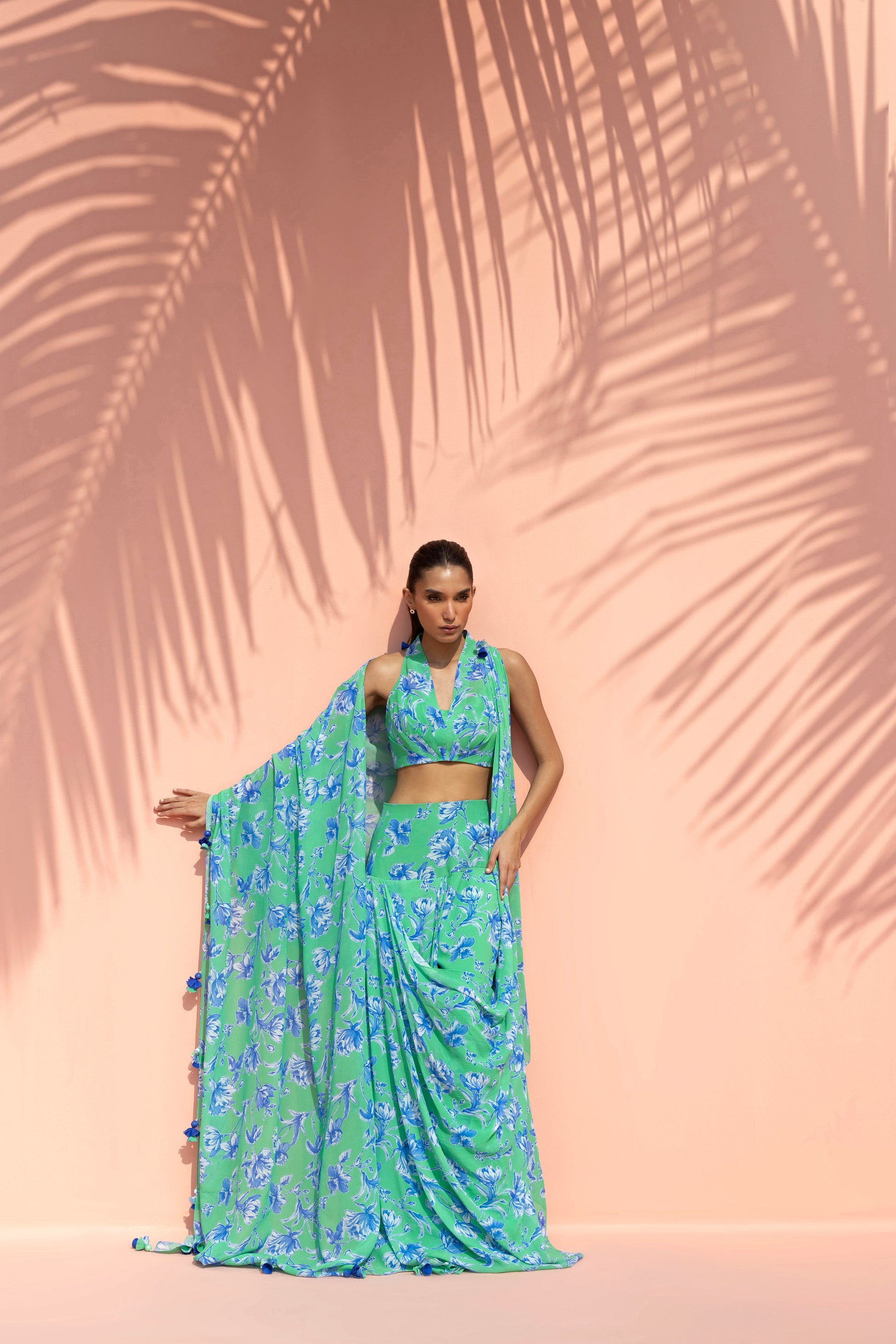 A vibrant interplay of colour and fluid drape defines this georgette ensemble, rendered in a striking aquamarine hue layered with bold painterly florals in vivid cobalt tones. The silhouette is anchored by a halterneck blouse with a soft V neckline, cinched at the waist with pleat detailing. It is paired with a fluid draped skirt that gathers and falls in soft folds, creating natural movement, while a matching pre draped dupatta, attached to the skirt and gathered into stylised folds at the shoulder, envelops the silhouette. Delicate tassel accents punctuate the edges, adding subtle movement and a playful finish to the ensemble.