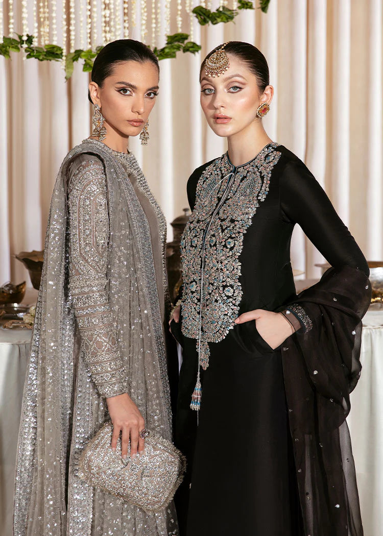 It’s a graceful grey raw silk shirt with heavily embellished front and organza sleeves. The dainty embellishments are in silver and grey pipes, sitara, cutdana, nakshi, dabka and Swarovski. It comes with a Indian Raw silk chooridaar and a gorgeous dupatta with sequin border on all 4 sides and heavy chatta of silver sitara.