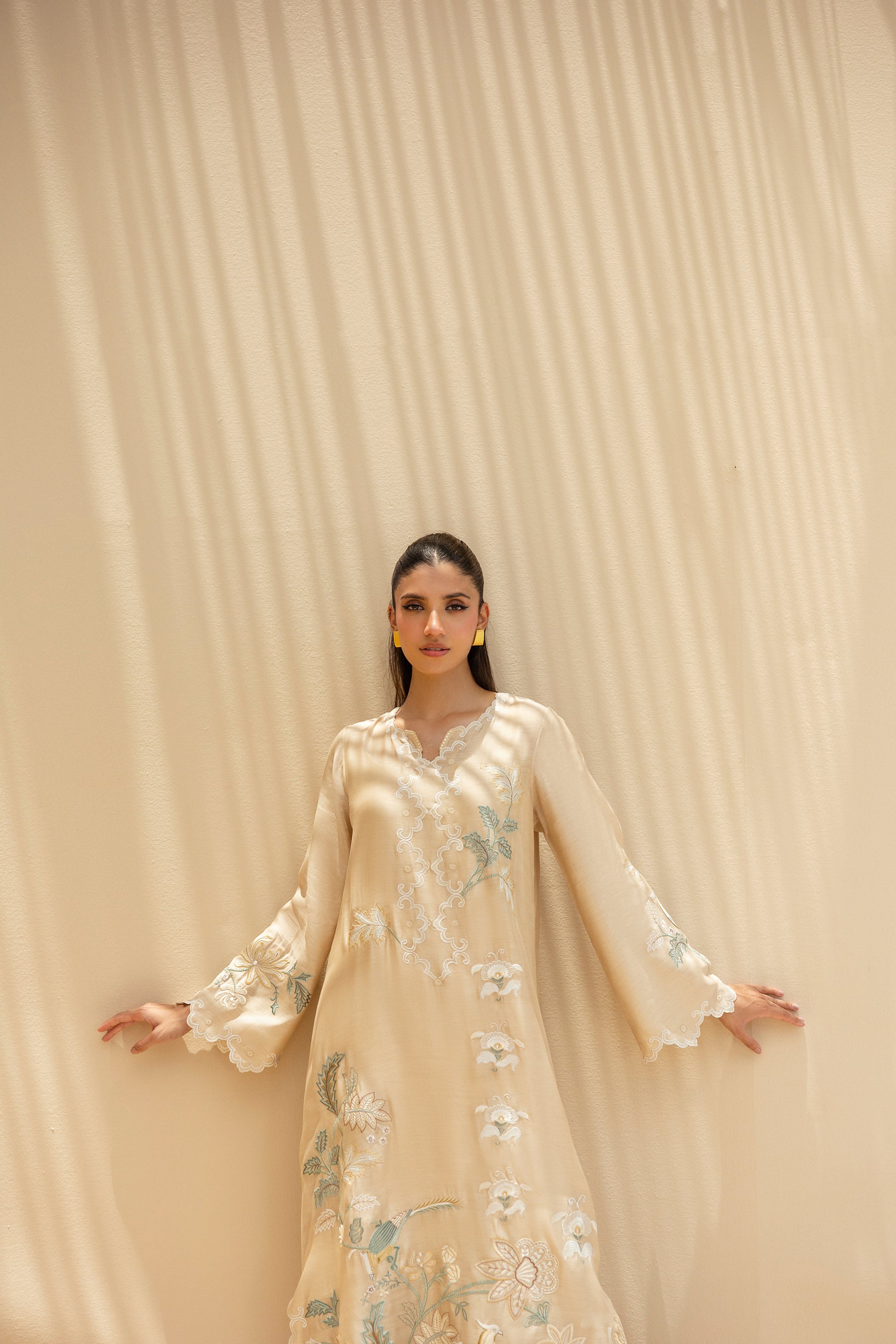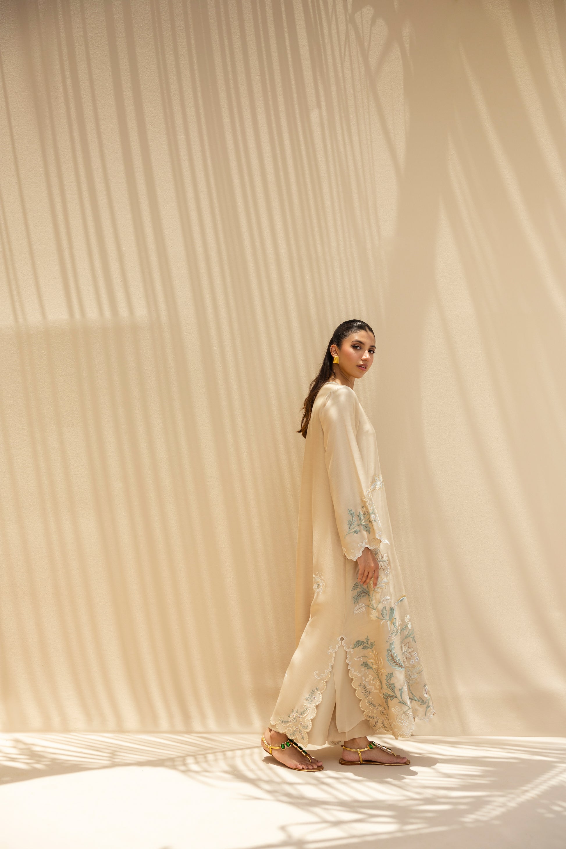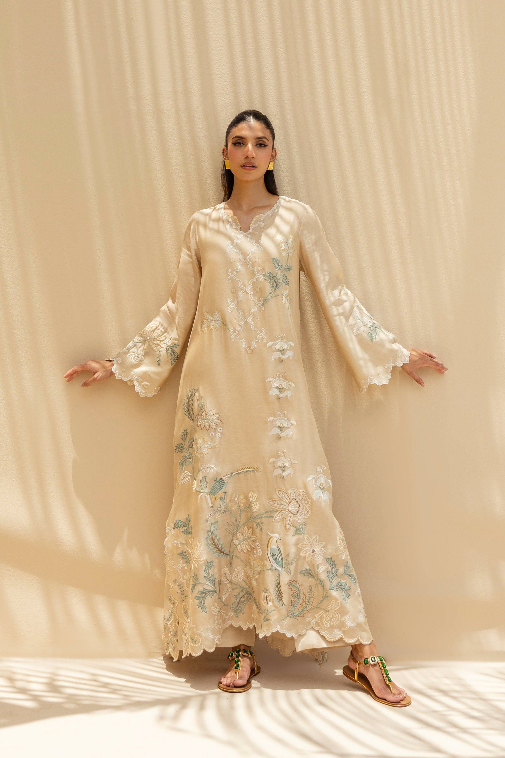 Ethereal and weightless, this relaxed kaftan in khaddi silk is adorned with intricate botanical embroidery in muted celestial tones and soft ivory. Scalloped hems, fluid sleeves and artisanal detailing lend it a poetic grace. The look is completed with matching pure rawsilk culottes.