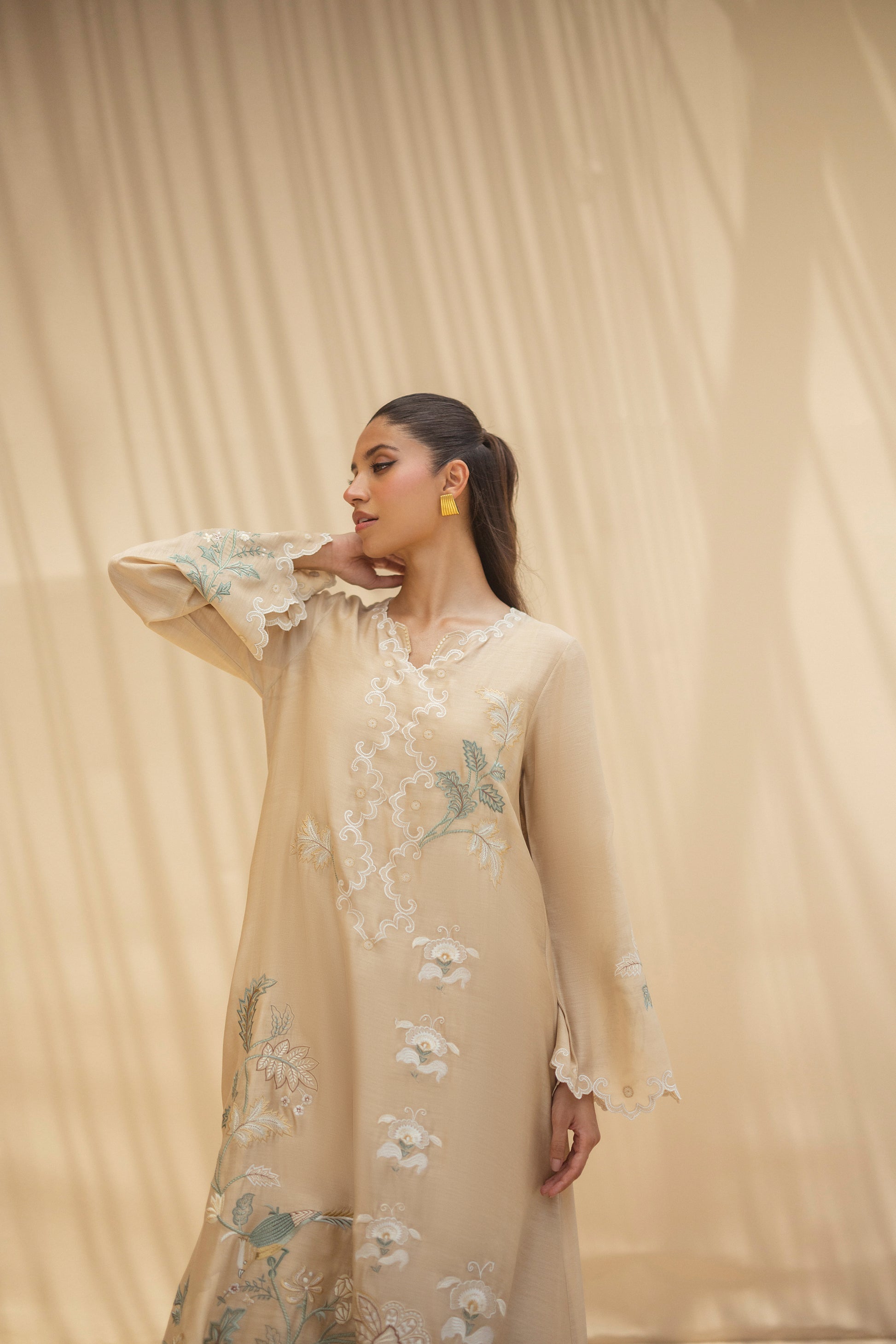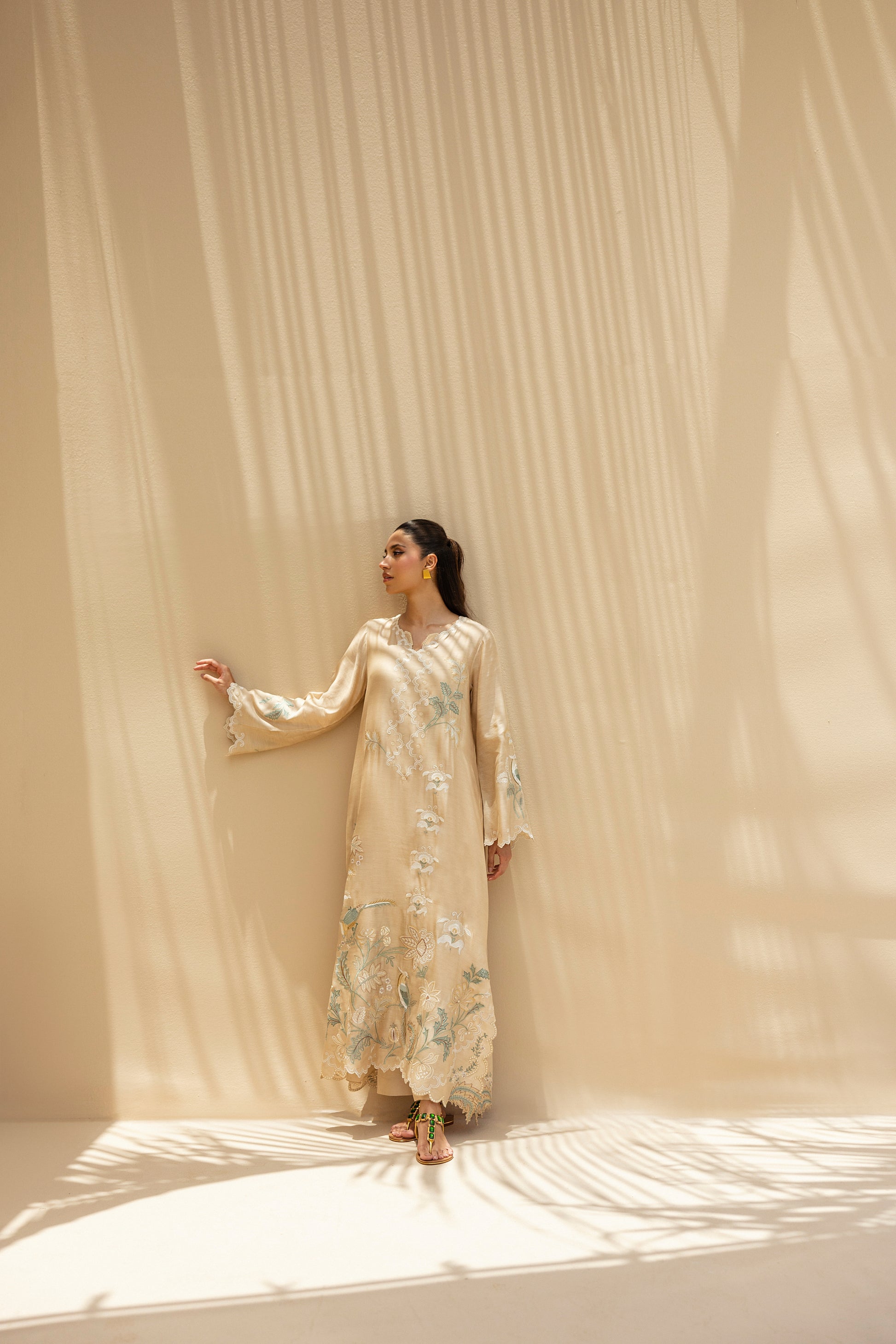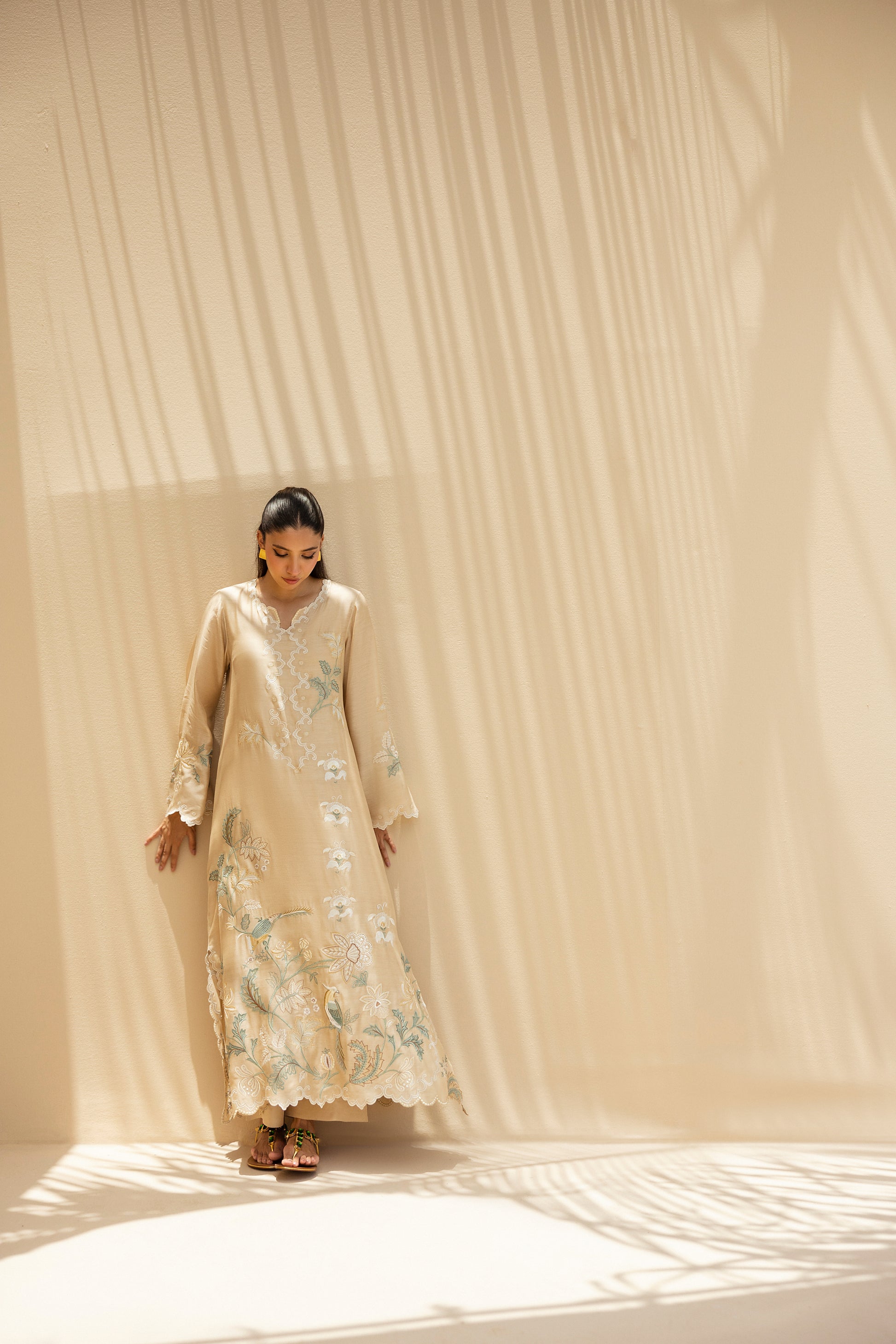 Ethereal and weightless, this relaxed kaftan in khaddi silk is adorned with intricate botanical embroidery in muted celestial tones and soft ivory. Scalloped hems, fluid sleeves and artisanal detailing lend it a poetic grace. The look is completed with matching pure rawsilk culottes.