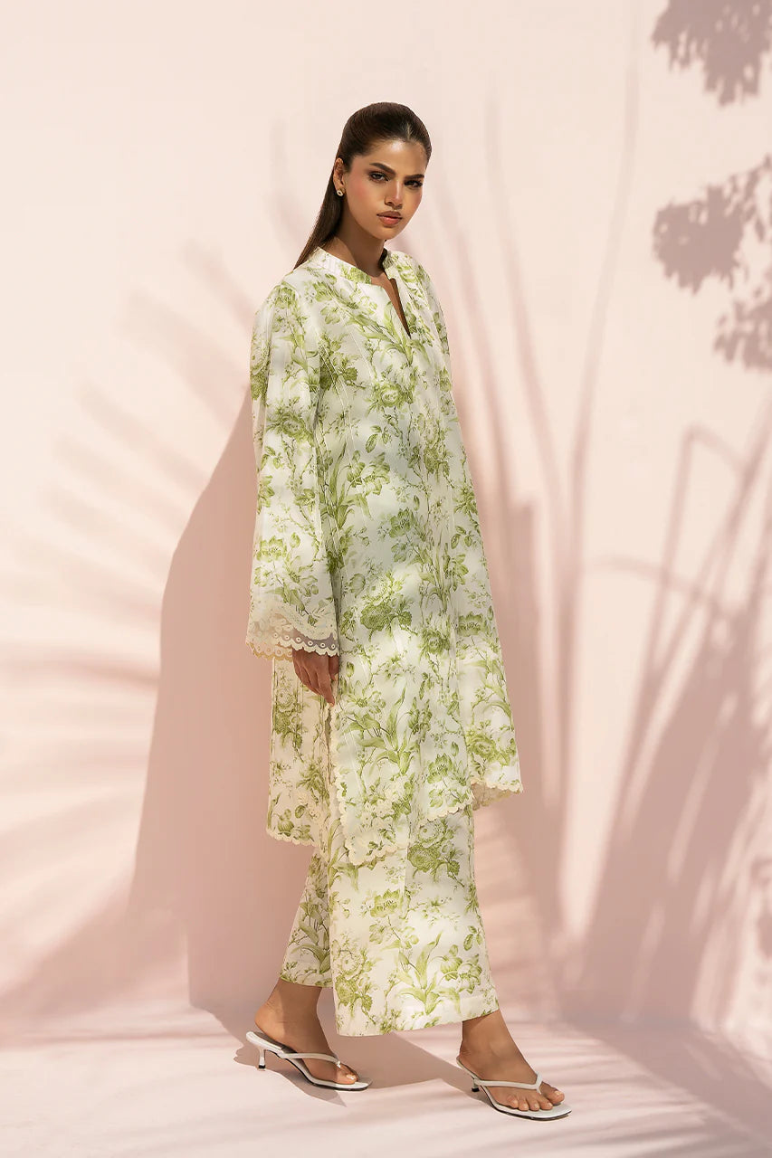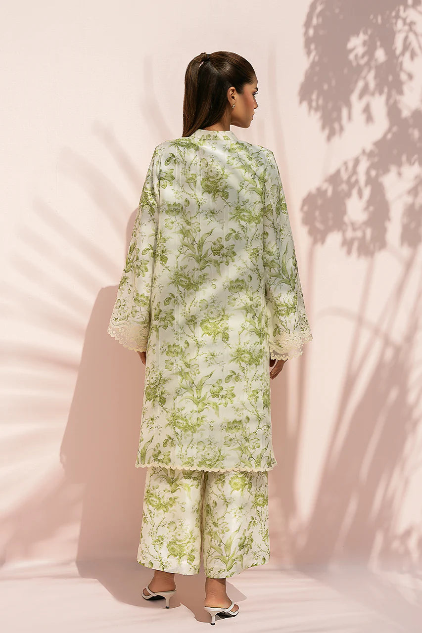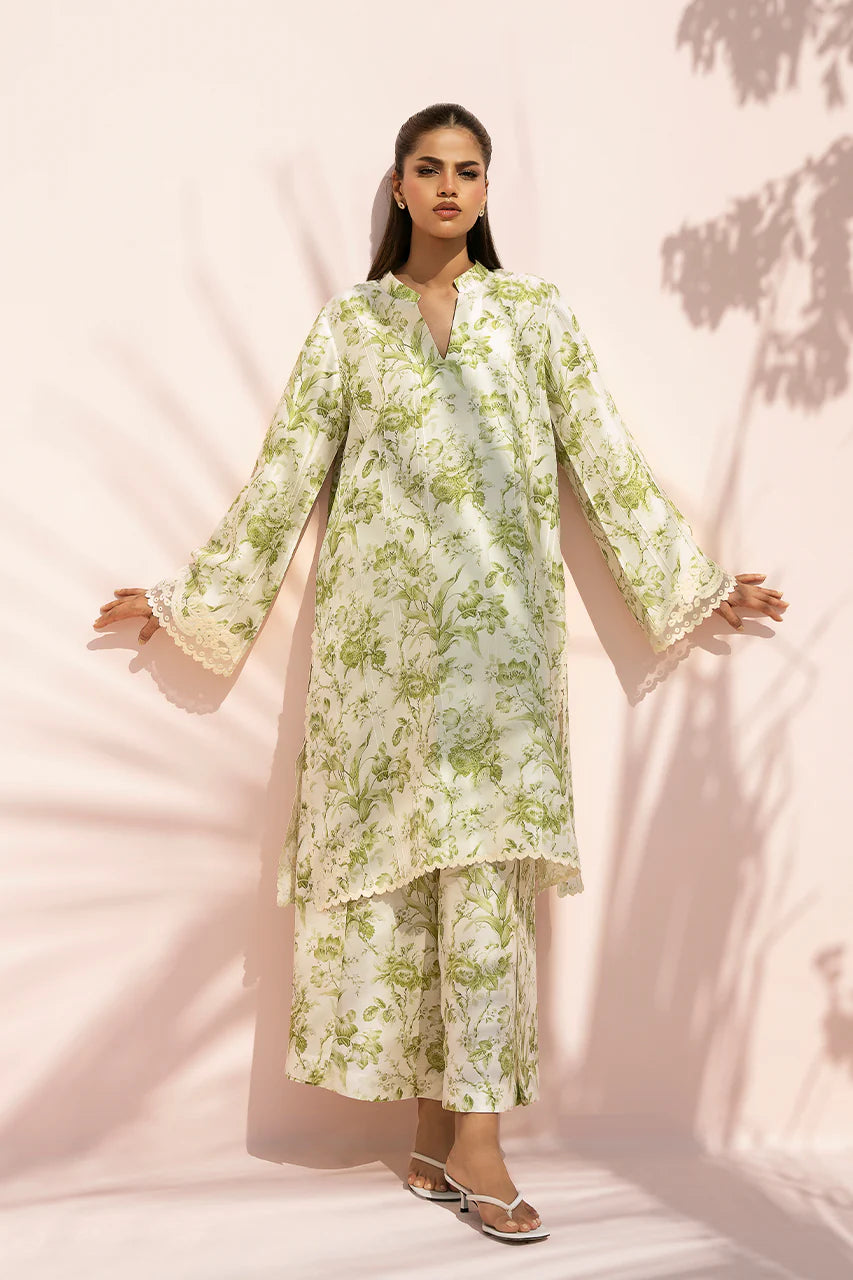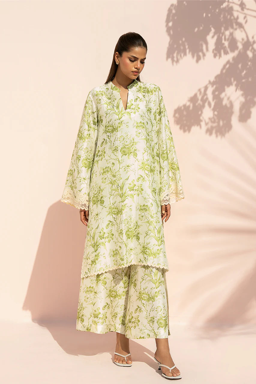An airy tea green pure rawsilk ensemble is enlivened with fresh botanical prints in soft green tones. The A line shirt is cut in a relaxed silhouette with wide sleeves and a clean band neckline, finished with delicate aari embroidery at the cuffs and hem for a subtle, refined touch. It is paired with culottes in a coordinating print, creating a seamless, fluid finish.