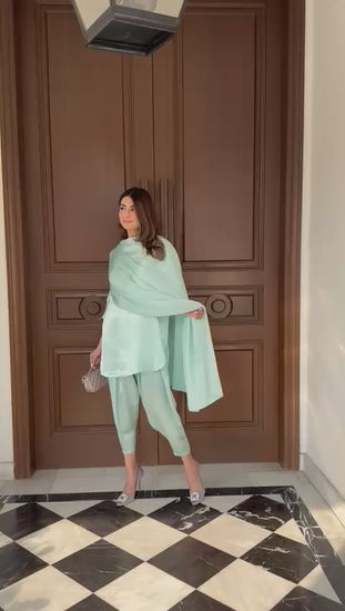 This elegant chamuse silk short shirt is paired with a chic skinny shalwar for a sleek, contemporary silhouette. The kurta features an attached scarf that adds a refined and graceful finish, making the ensemble effortlessly sophisticated.