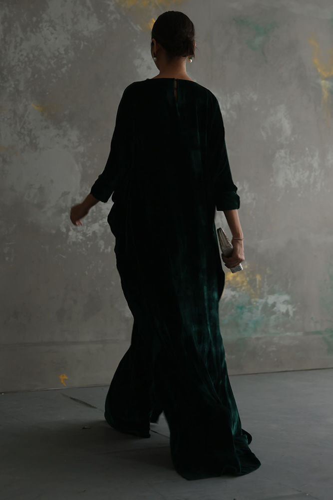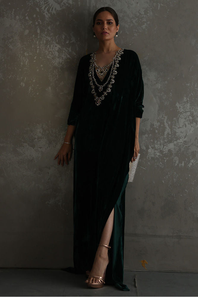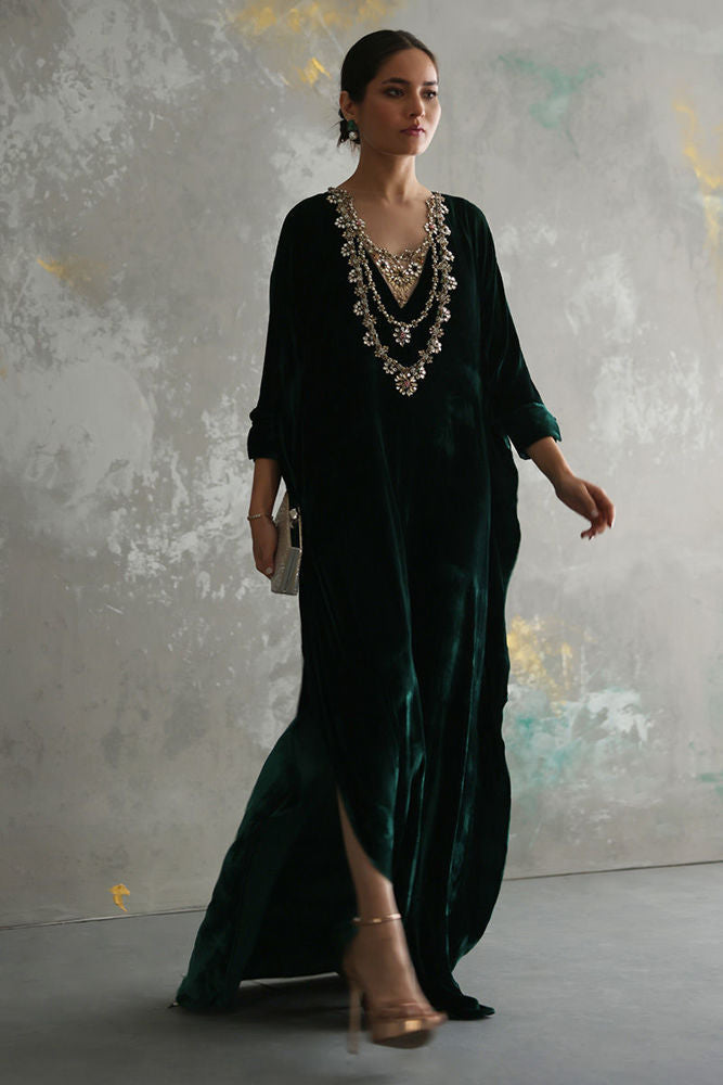 A stunning Emerald Green pure velvet kaftan gives a major fashionista goal. The 3D Jewel look, handwork embroidery around the neckline is a real beauty.