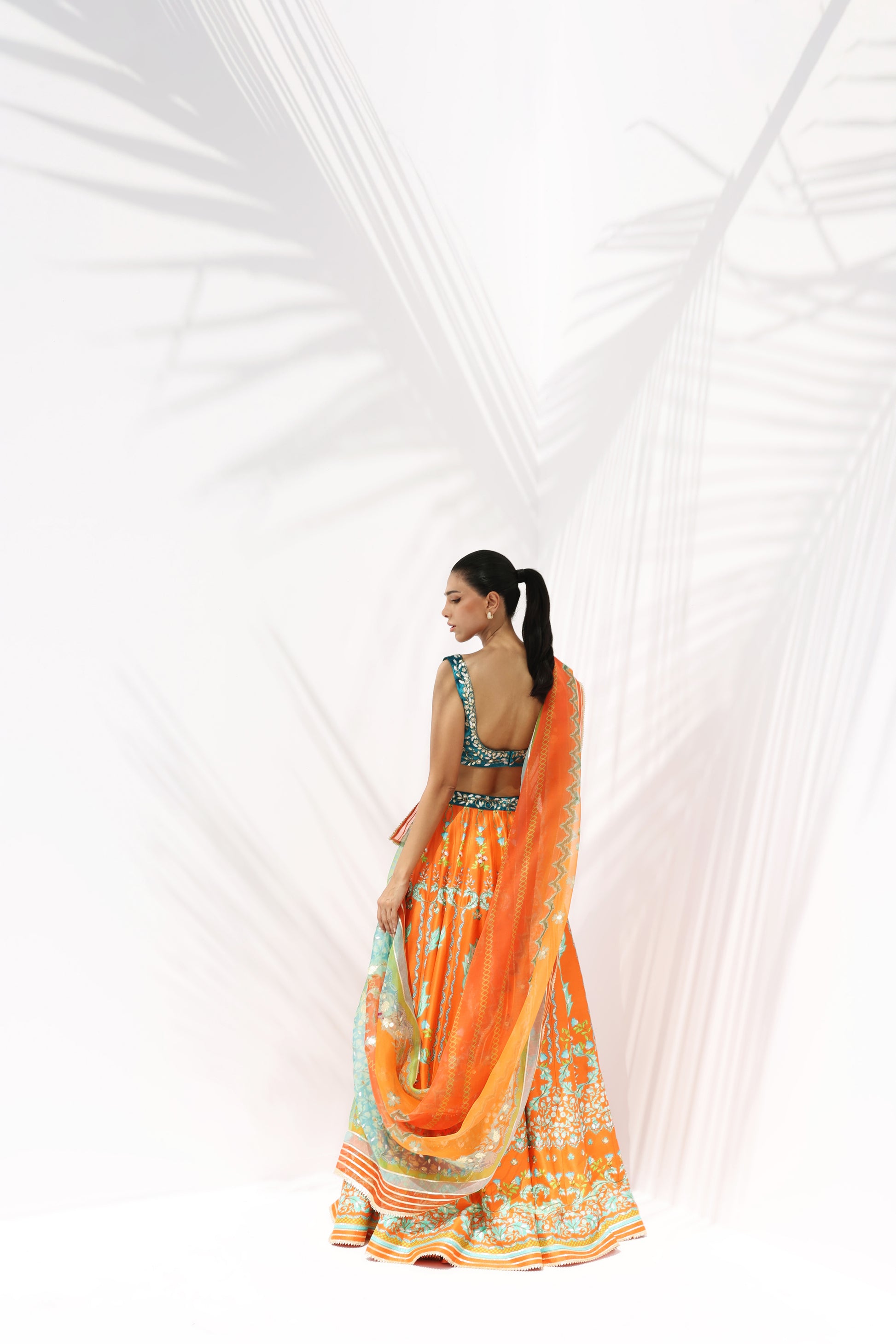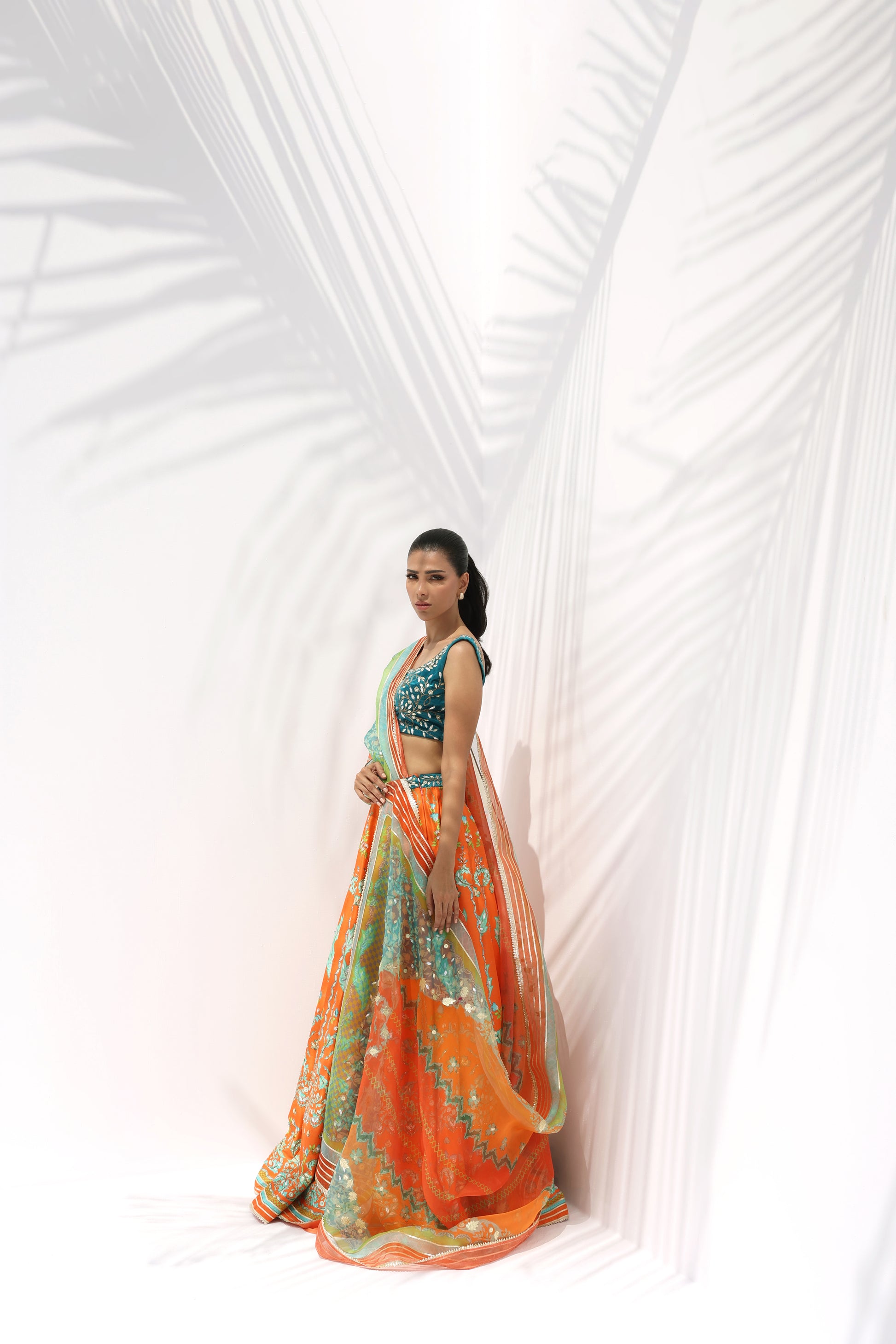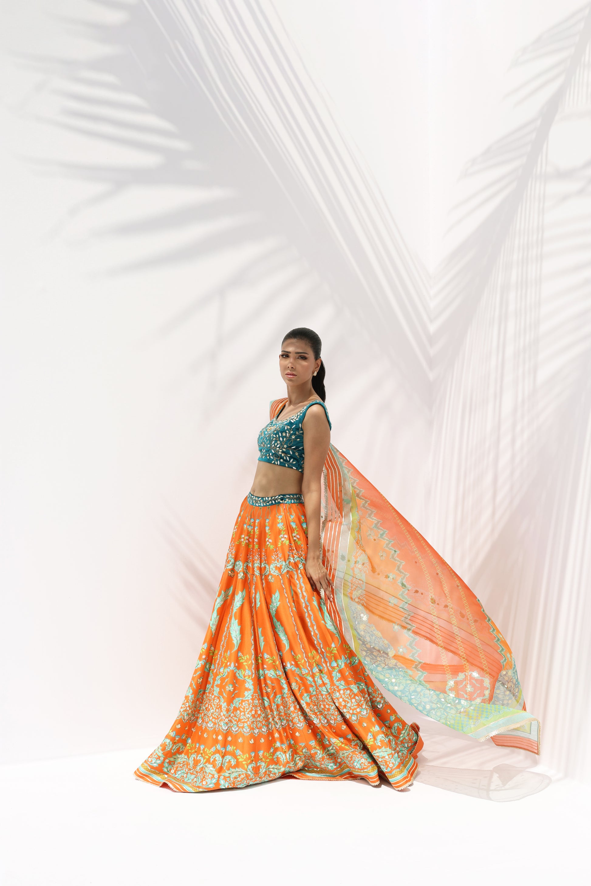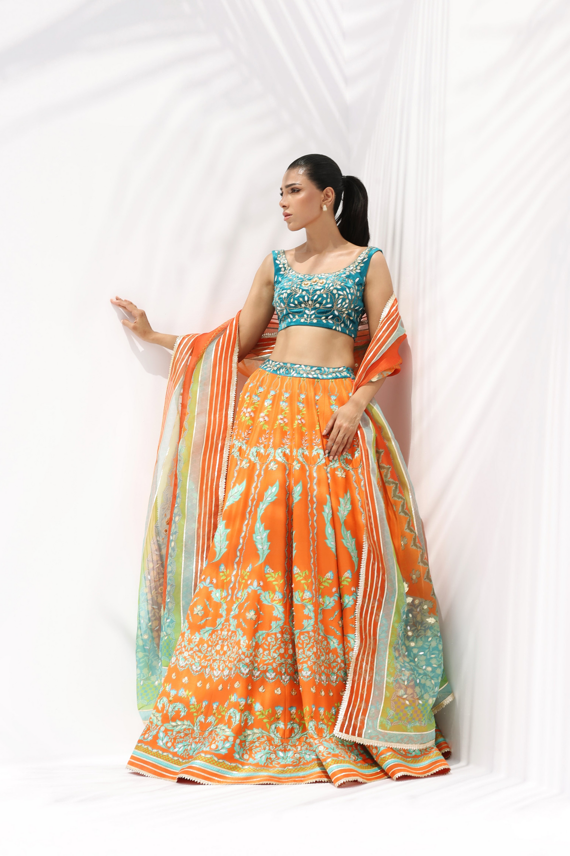In jewel tones of teal and tangerine, this ensemble strikes a balance of artistry and finesse. The teal velvet cropped blouse is richly embroidered with gilded vines and florals, its dark surface shimmering against the light. It is paired with a flowing pure raw silk lehenga in layered tones of blue, adorned with fine gota embroidery, delicate sequins, and painterly florals that scatter across its expanse. A diaphanous organza dupatta, edged with gota and finished with tasselled accents, completes the look with refined elegance.