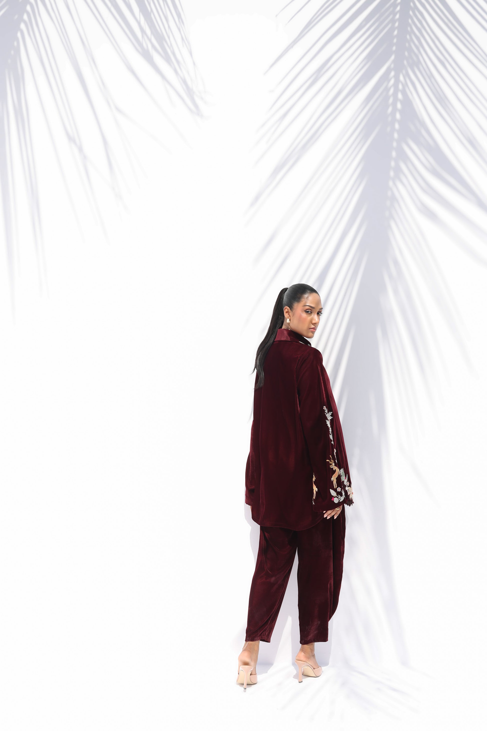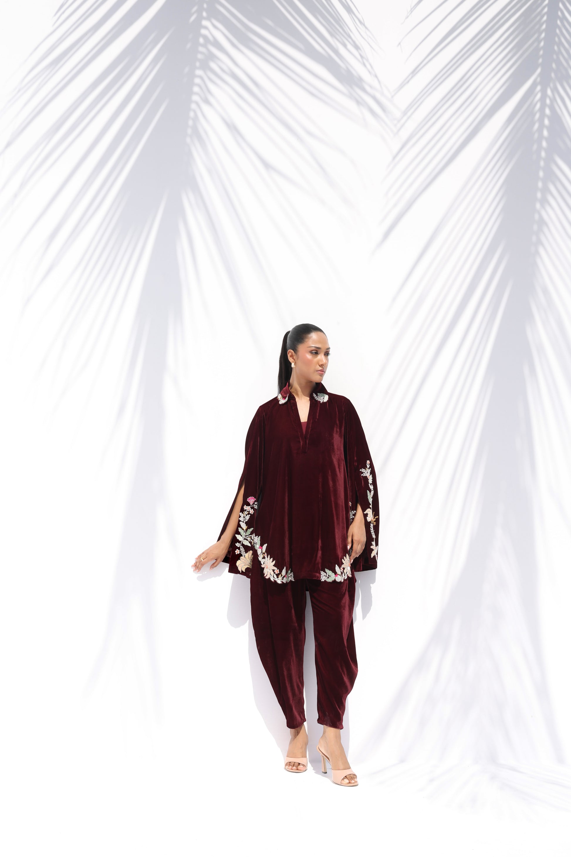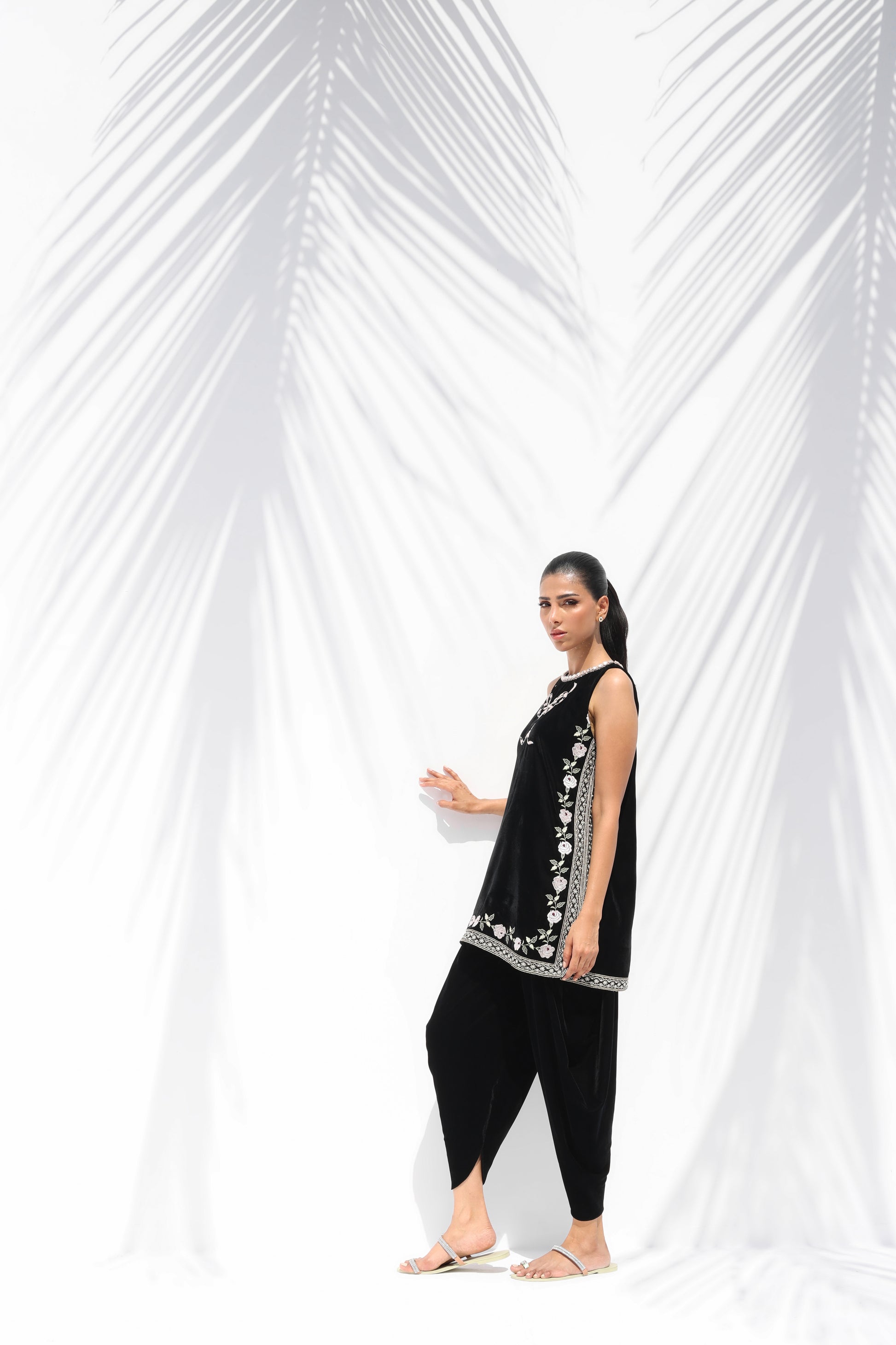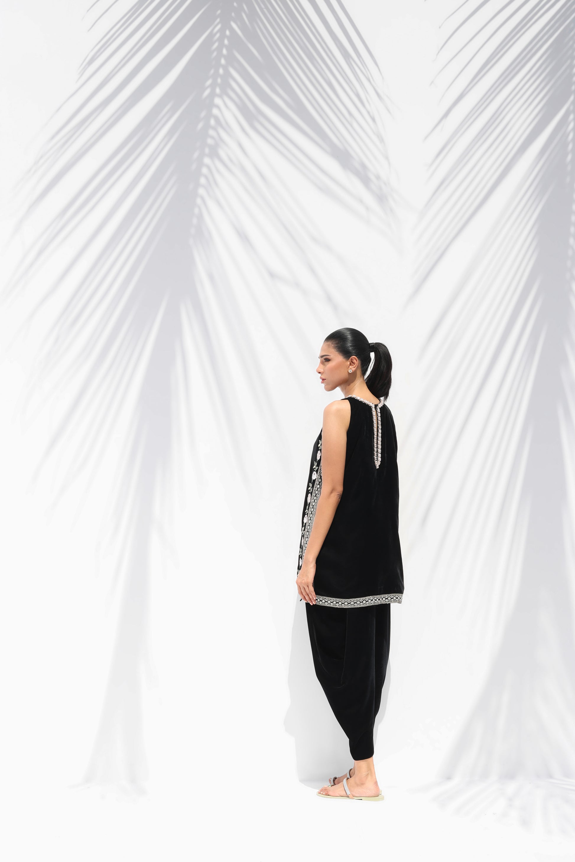 A vision of contemporary elegance, this ebony velvet shirt is tailored in a sleeveless A-line silhouette. Delicate embroidery adorns the neckline with a bow motif and traces the borders in soft floral vines. Paired with a velvet balloon shalwar that balances fluidity and structure, the look is finished with a pearl and diamante edged neckline, embodying modern glamour.