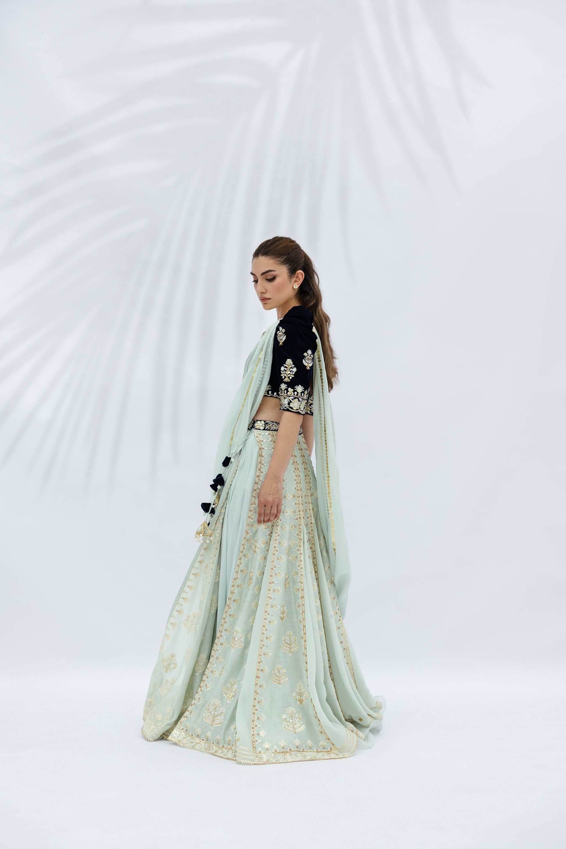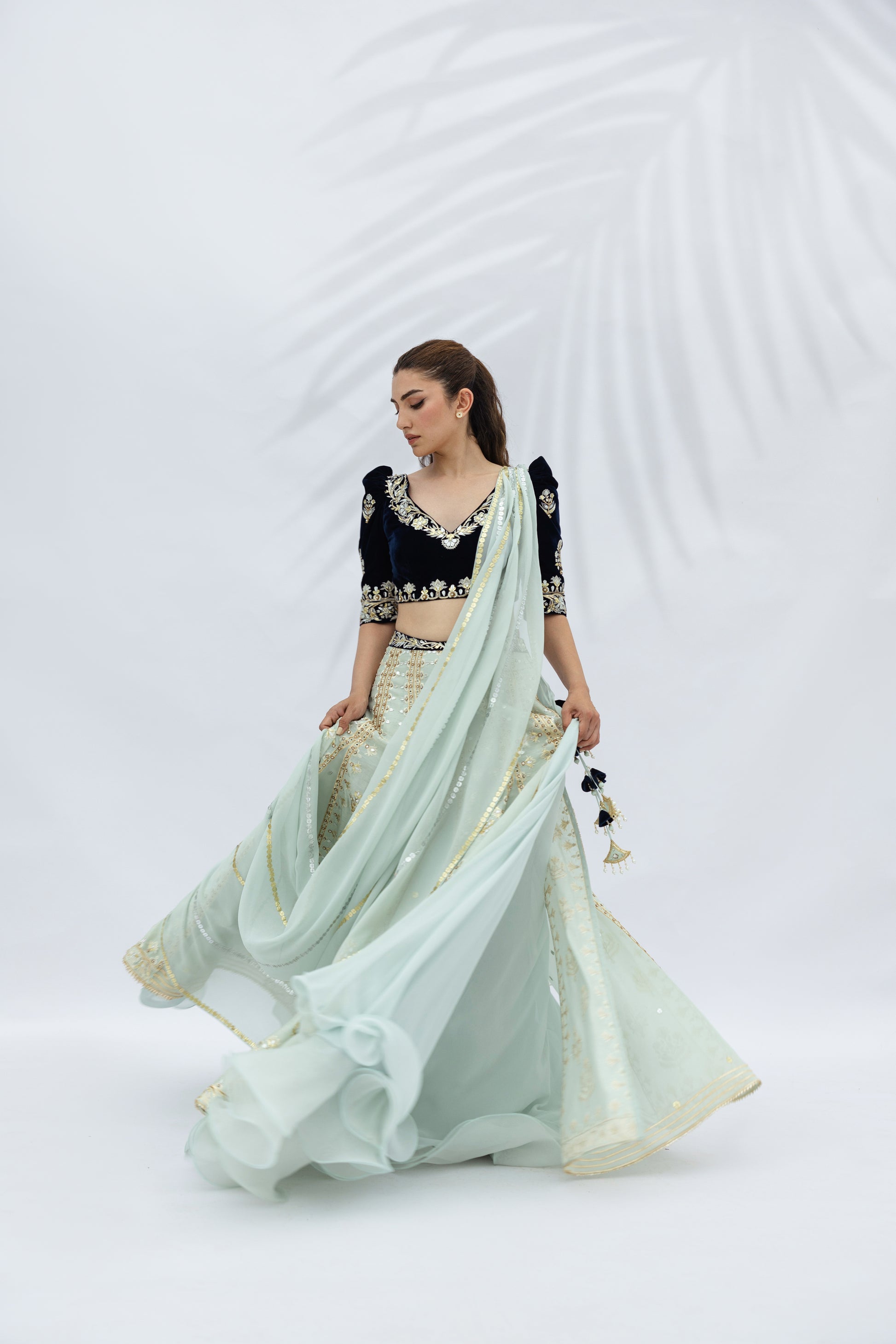 A striking interplay of midnight blue and mint, this look marries regal poise with airy grace. The cropped velvet blouse, in deep midnight blue, is sculpted with structured shoulders and delicately embellished with resham and zardoze embroidery. It pairs with a voluminous mint hued khaddi silk lehenga, layered in soft organza ruffles at the hem and embroidered with gilded rosettes, sequins, zardoze work and gota borders that catch the light with every turn. A diaphanous georgette dupatta edged in gold sequins completes the look, draping effortlessly to balance drama wih poise.