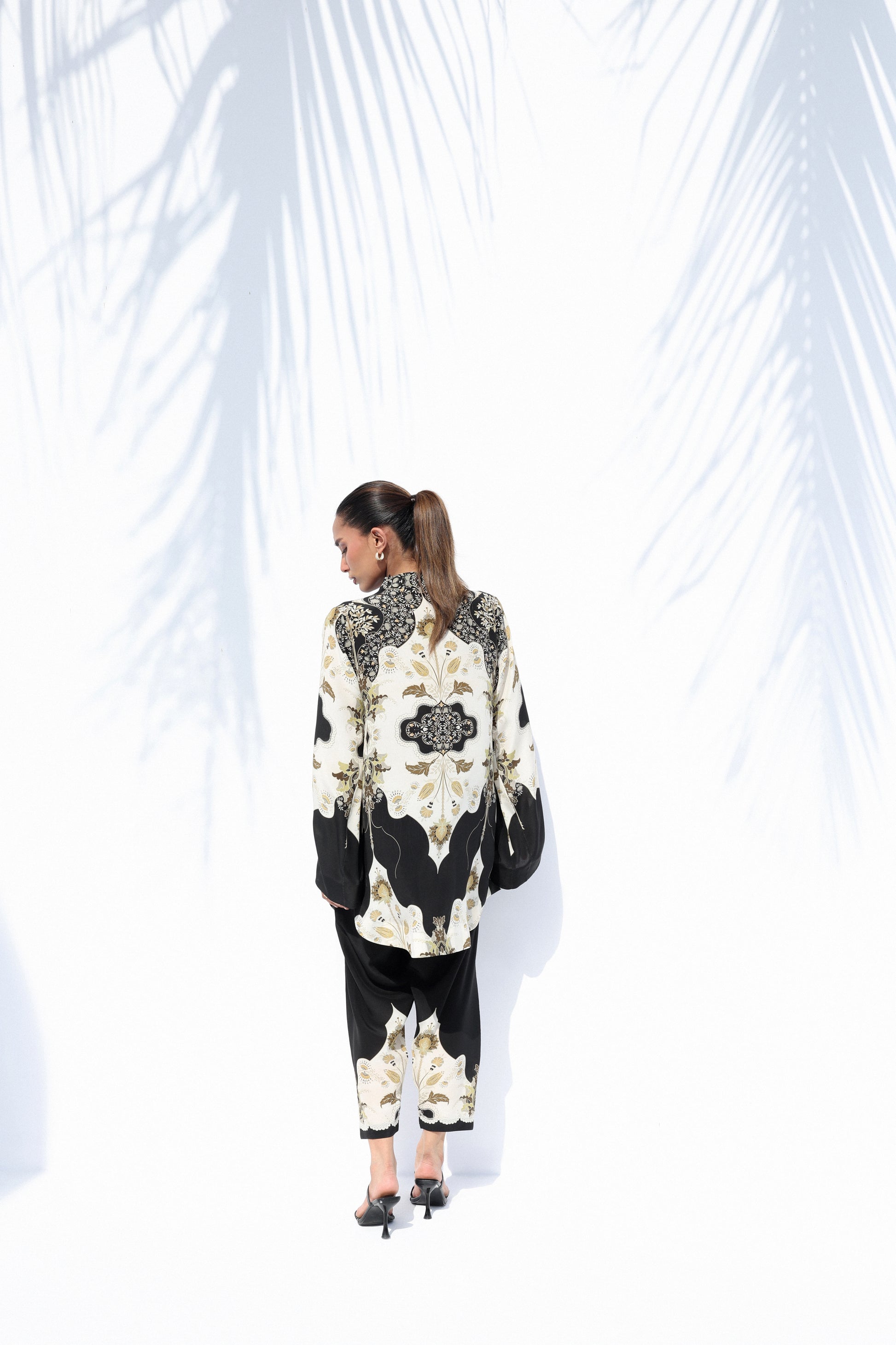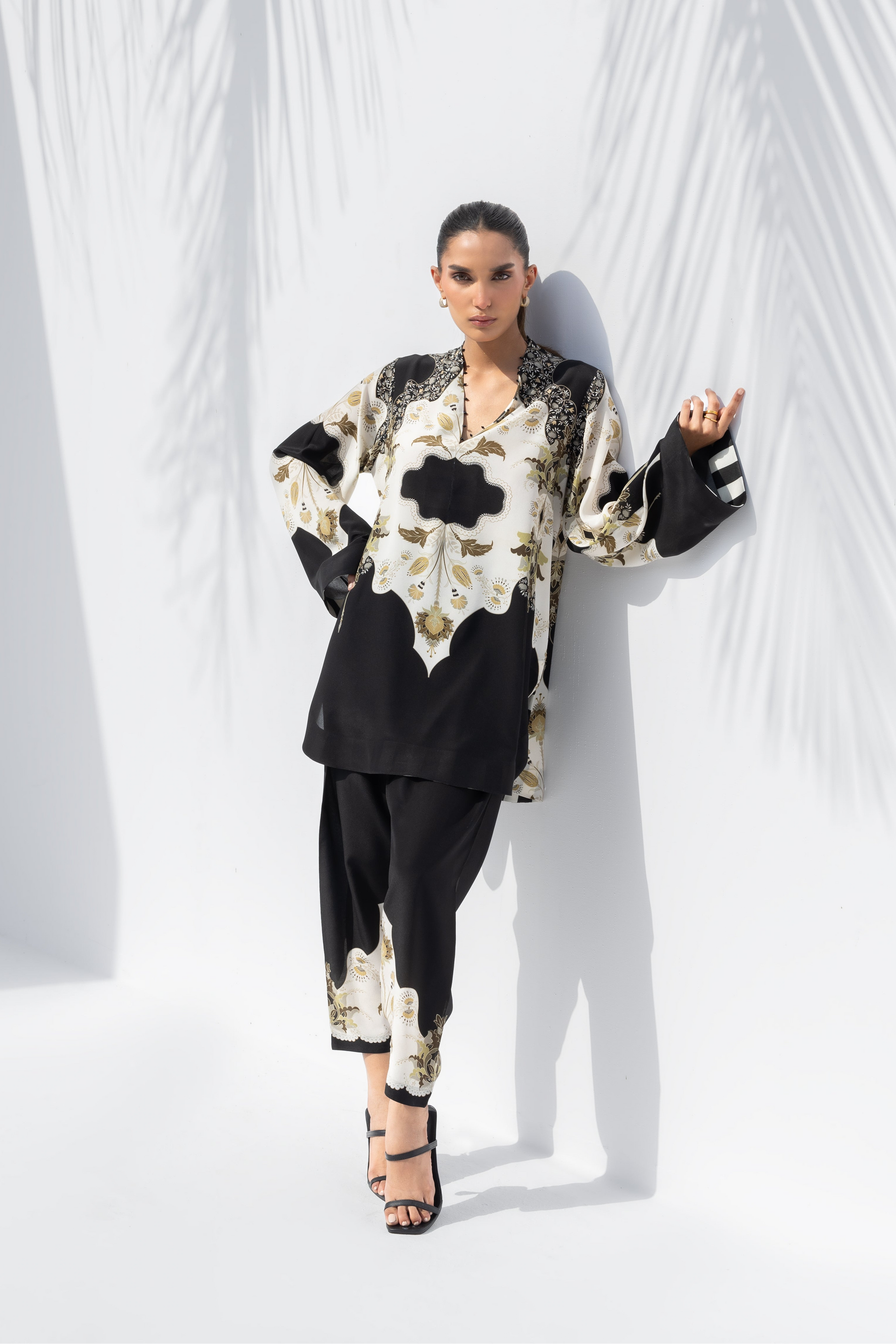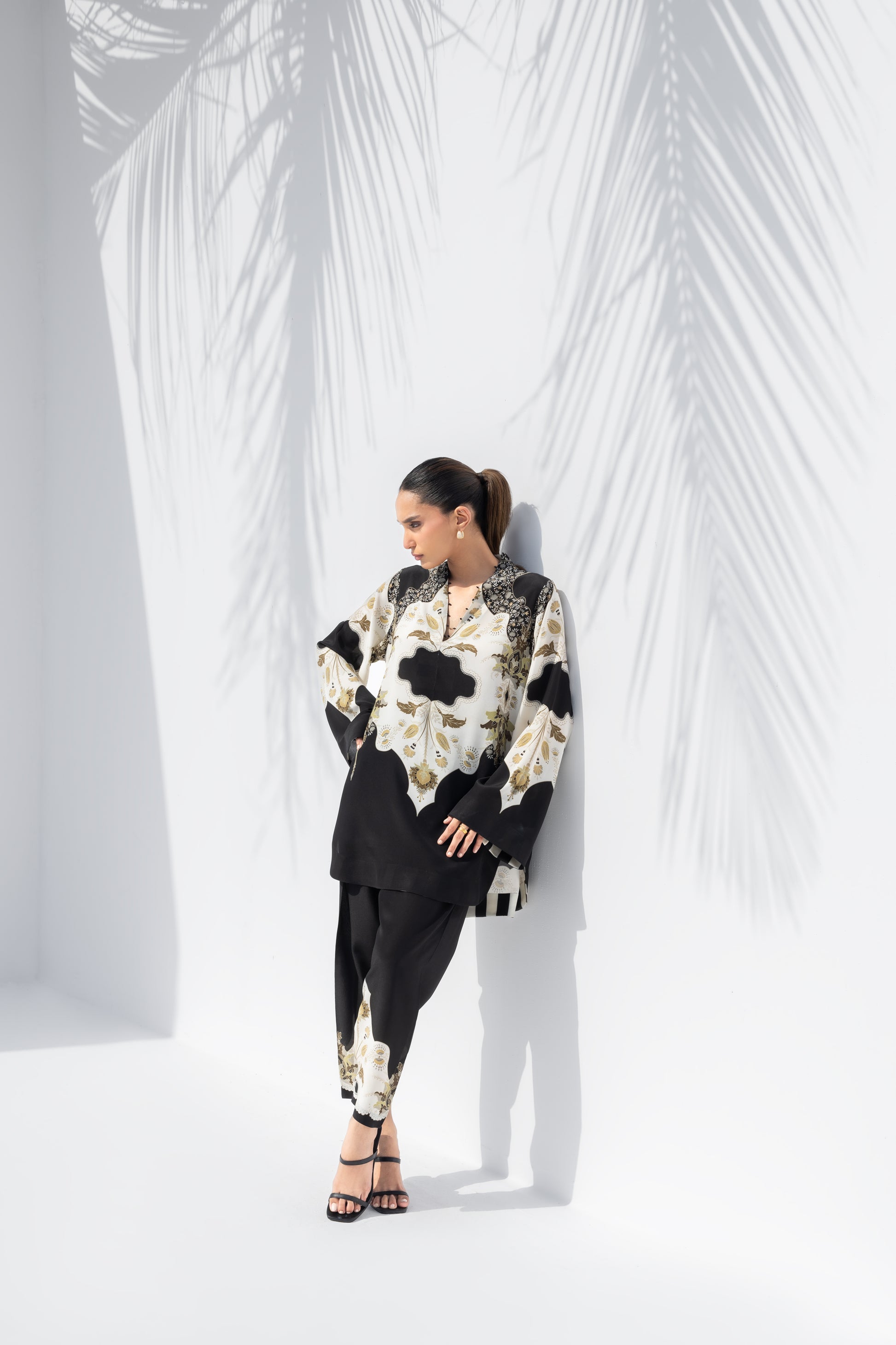 In striking ebony and ivory, this crepe ensemble features a relaxed short shirt with vintage-inspired print in shades of olive, ebony, and cream. Paired with perfectly tailored shalwar that echoes the print’s scalloped edge at the ankle, the look becomes a striking synthesis of traditional pattern and contemporary silhouette.