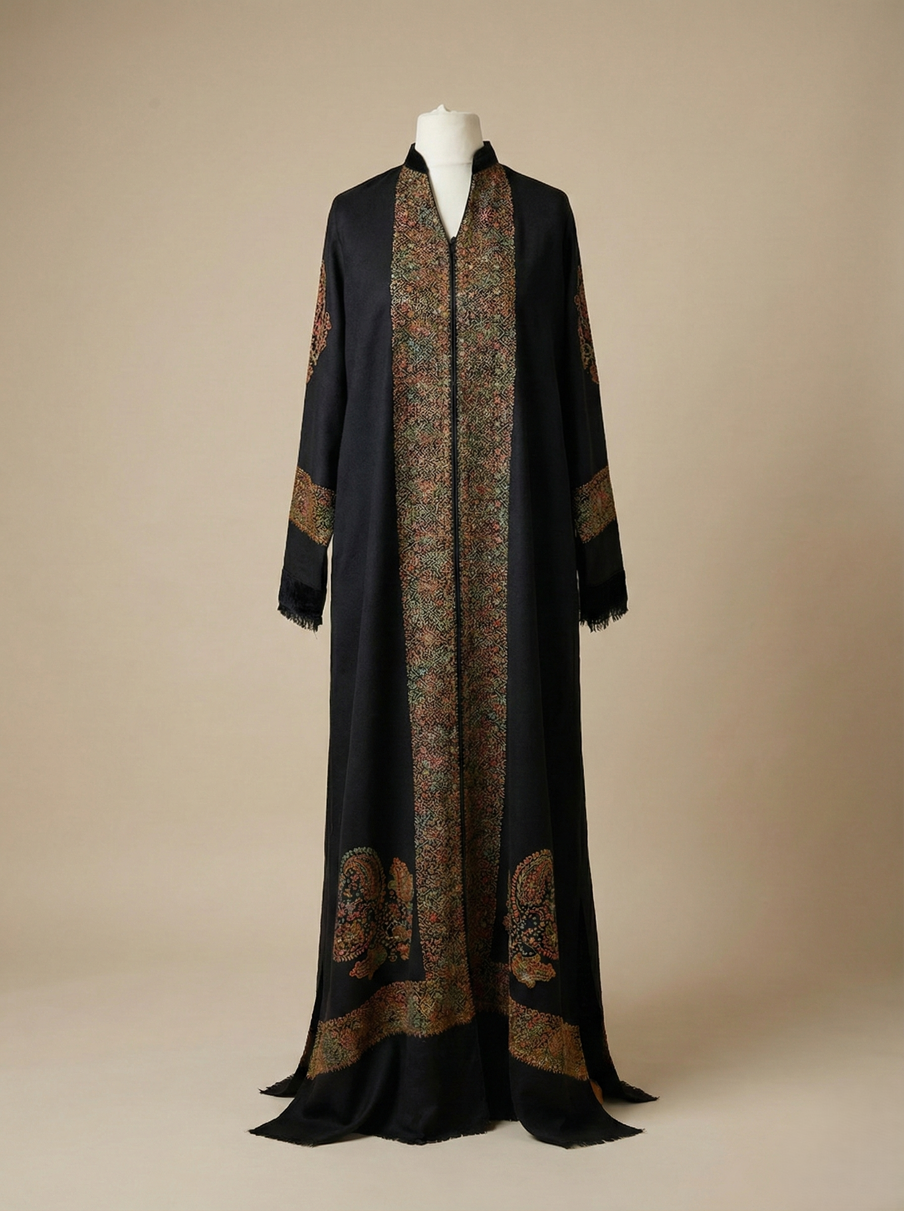 A sleek black long kaftan featuring intricate multicolor embroidery along the front, sleeves, and hem. Flowy, elegant, and 61 inches in length—perfect for a refined, traditional look.