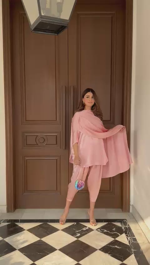 This elegant chamuse silk short shirt is paired with a chic skinny shalwar for a sleek, contemporary silhouette. The kurta features an attached scarf that adds a refined and graceful finish, making the ensemble effortlessly sophisticated.