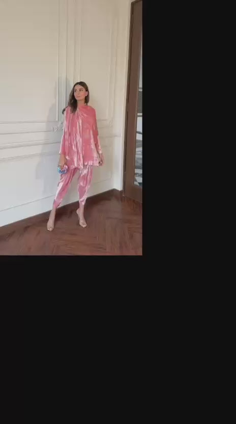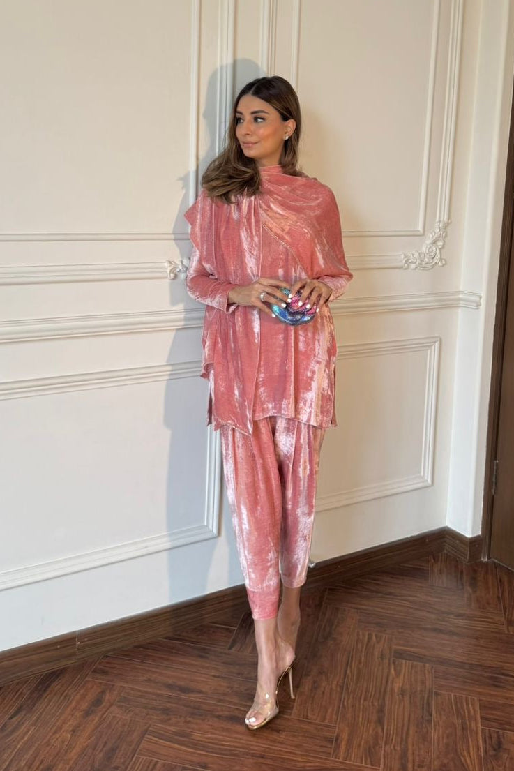 An elegant velvet short shirt paired with a sleek skinny shalwar. Featuring an attached scarf that completes the look with refined sophistication.