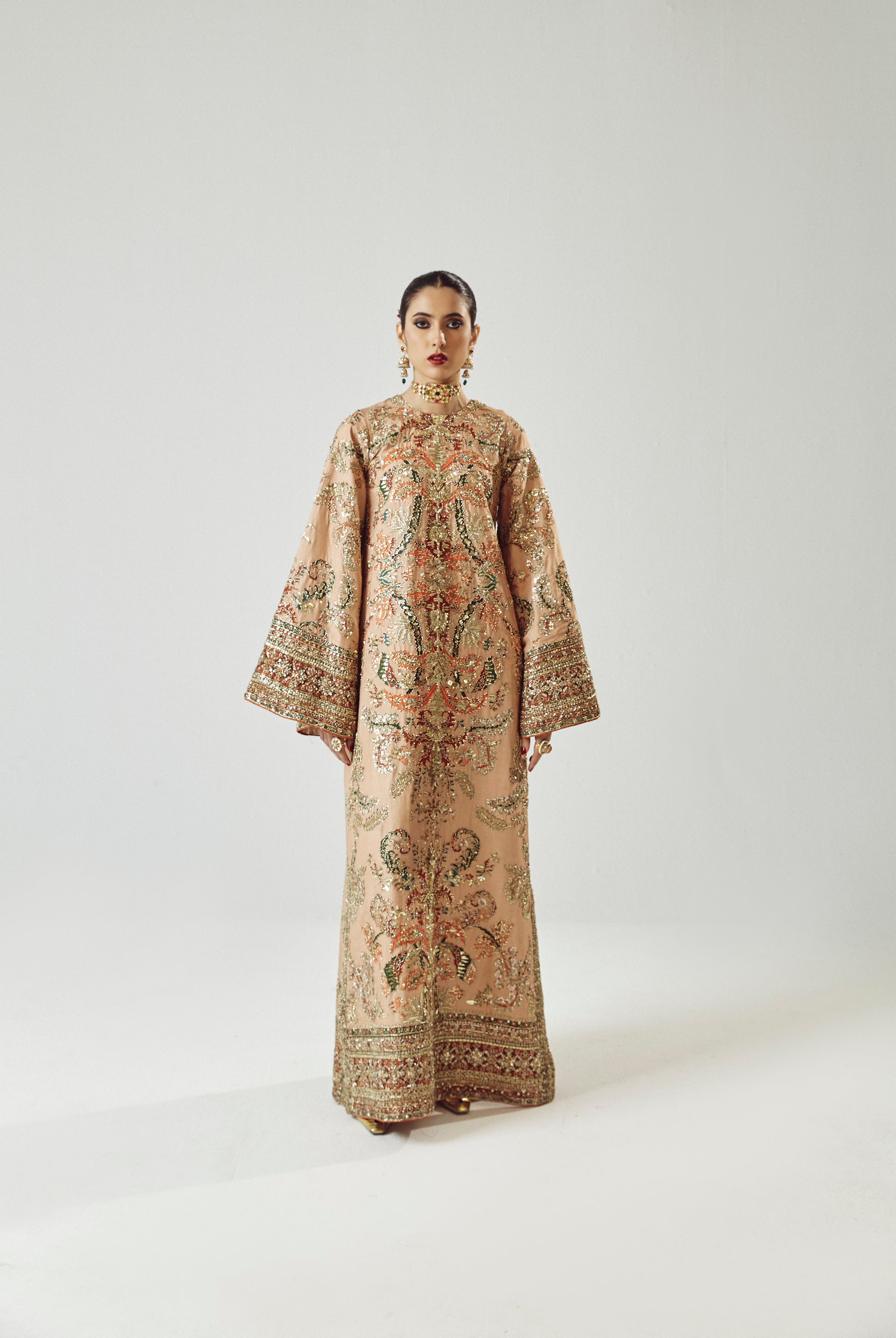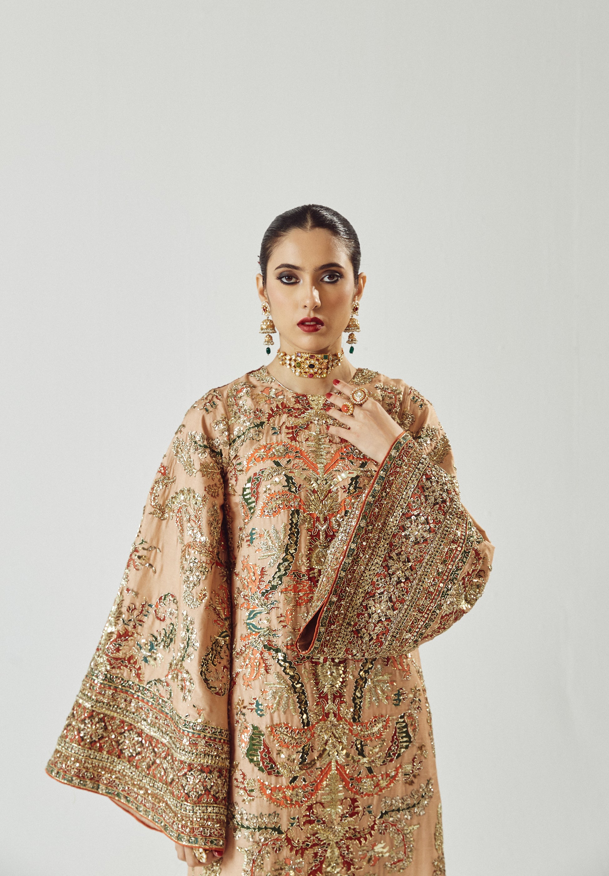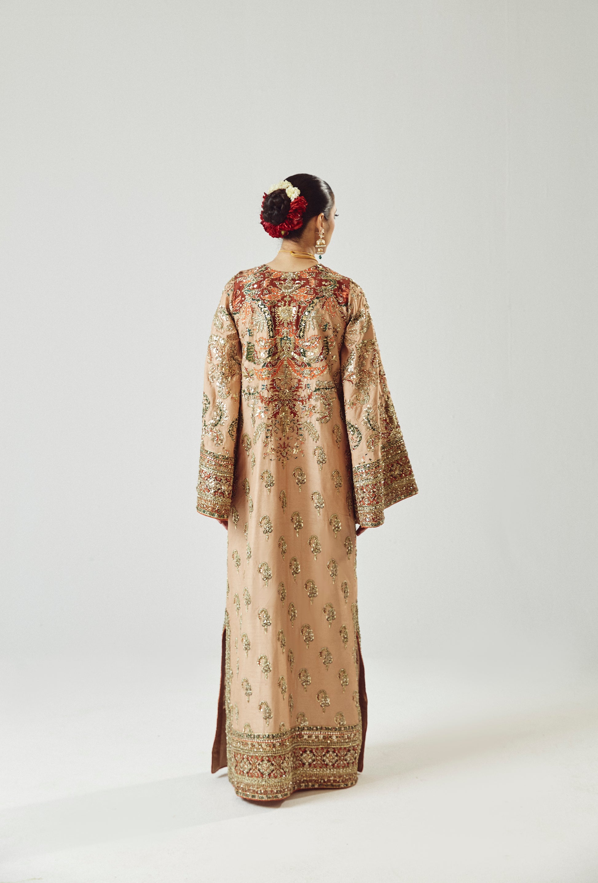 This jaw-dropping printed raw silk long shirt, embellished with intricate adda work of mukesh, naqshi, sequins, gotta and traditional materials. It's a true masterpiece, combining contemporary flair with timeless craftsmanship.