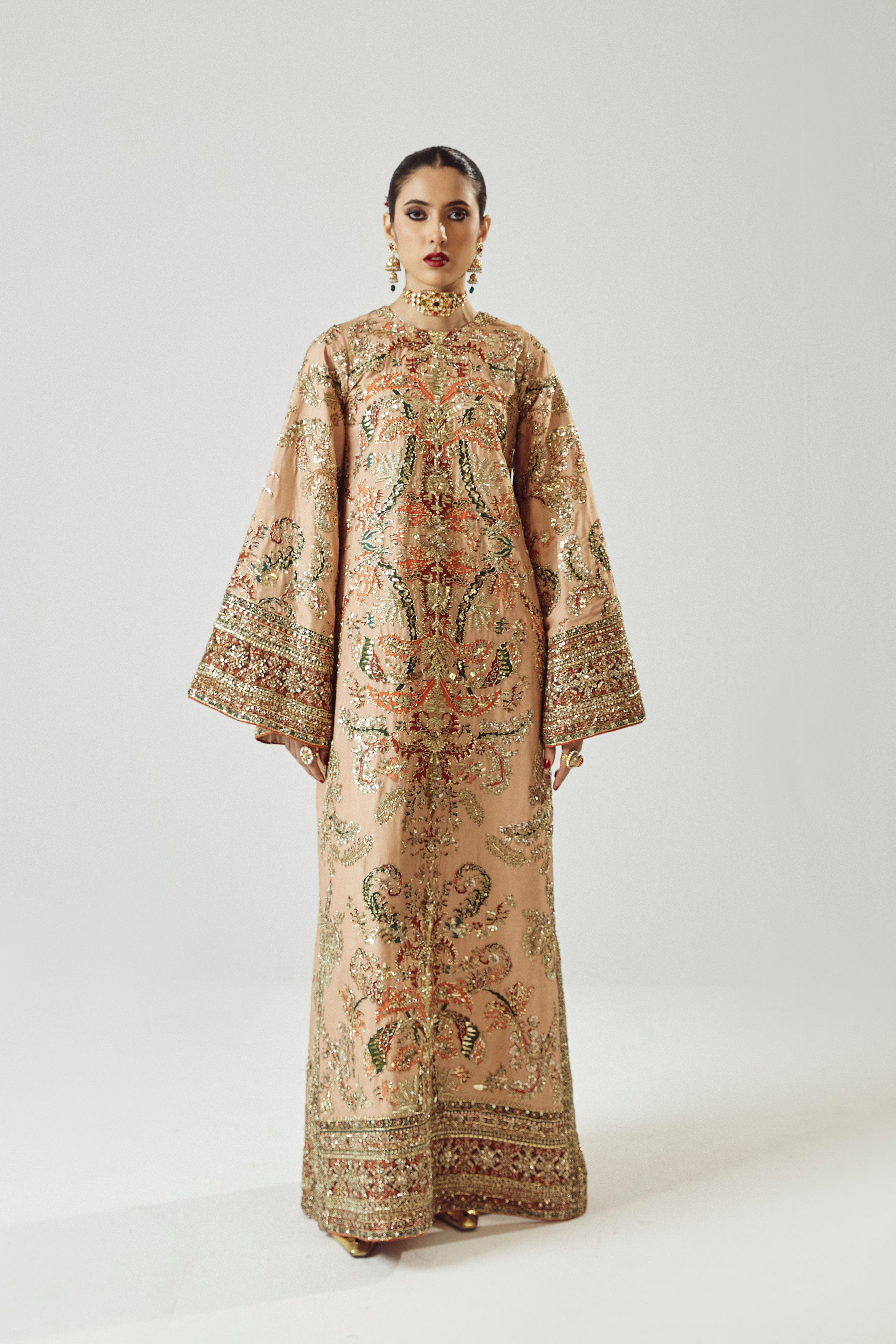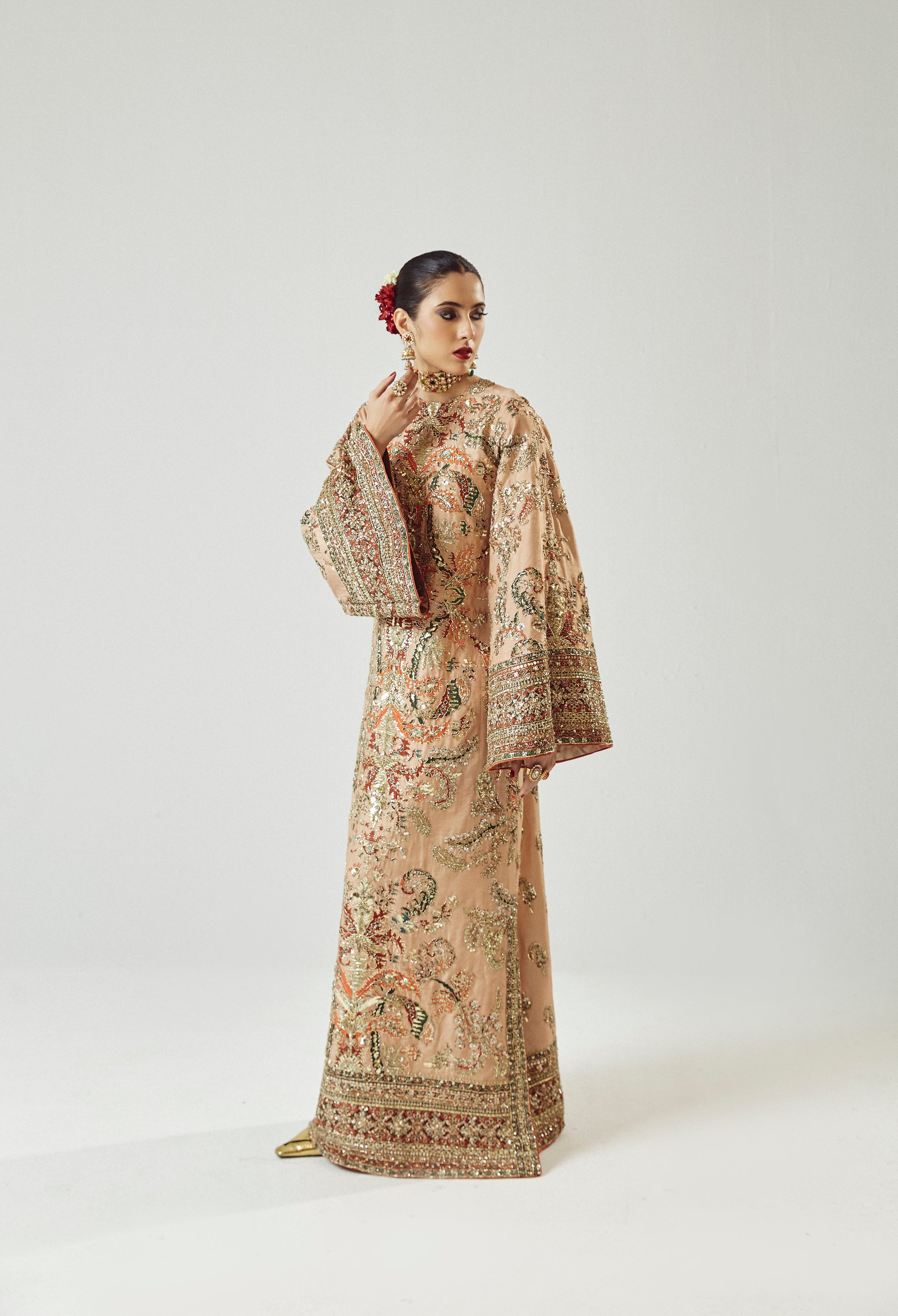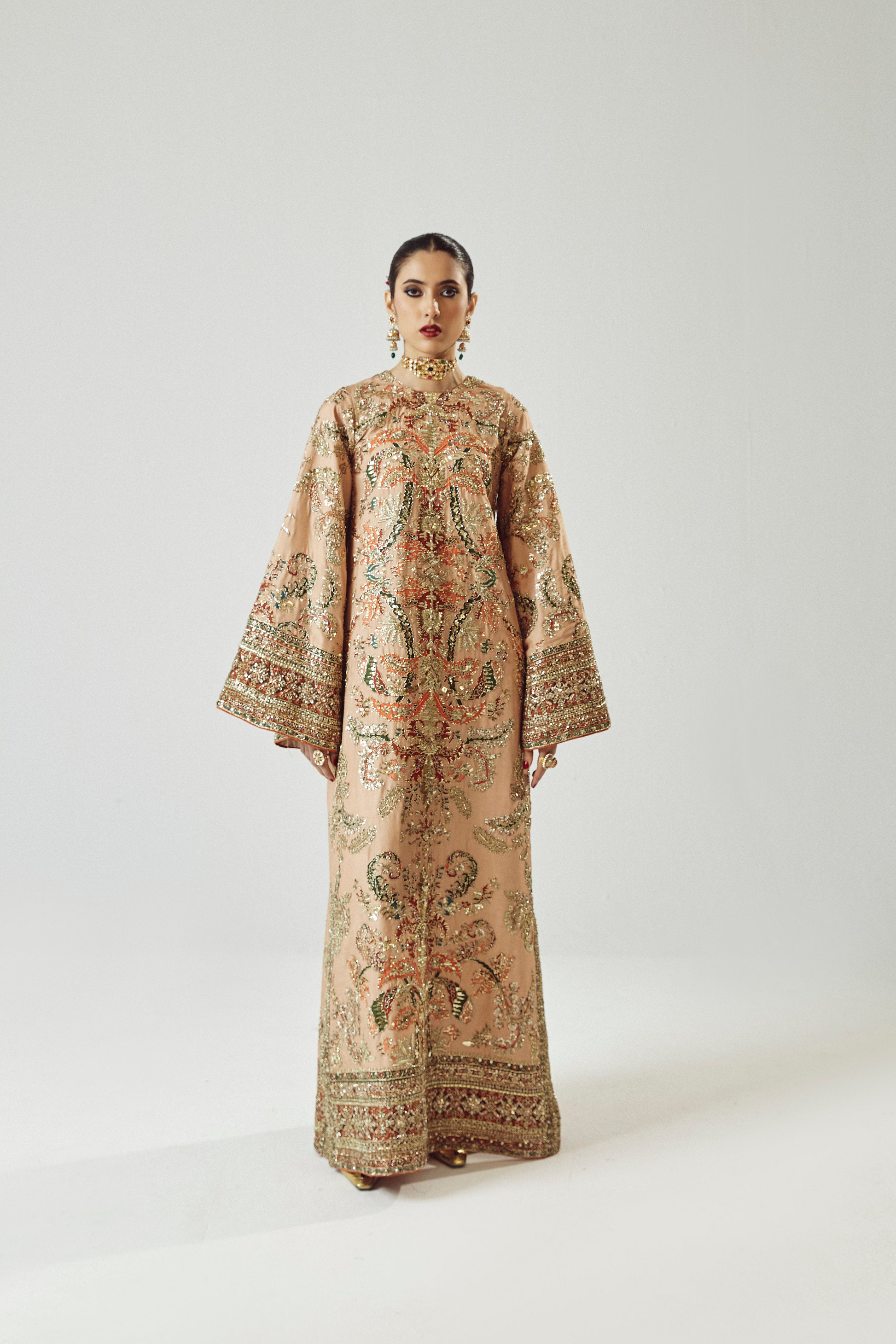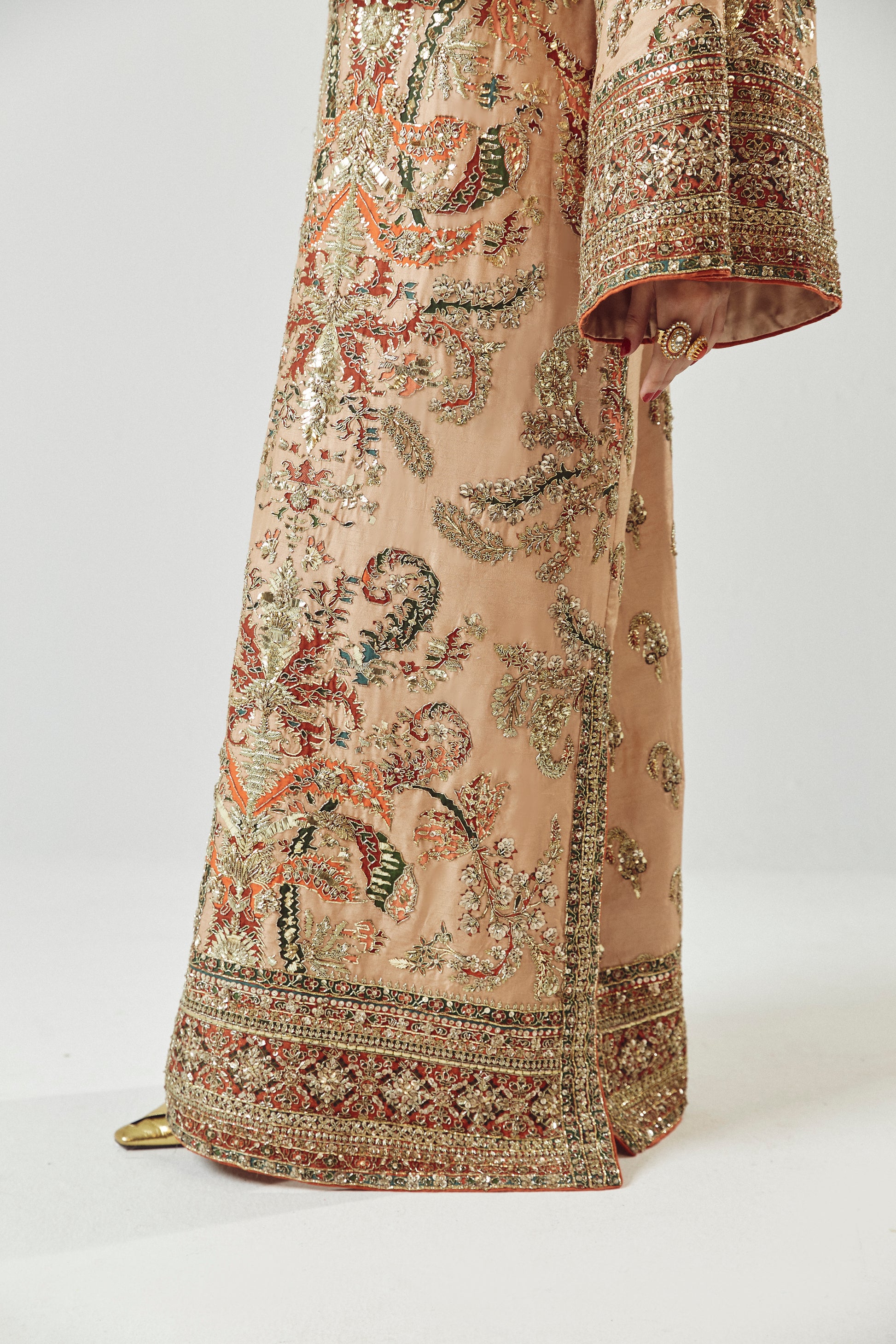 This jaw-dropping printed raw silk long shirt, embellished with intricate adda work of mukesh, naqshi, sequins, gotta and traditional materials. It's a true masterpiece, combining contemporary flair with timeless craftsmanship.