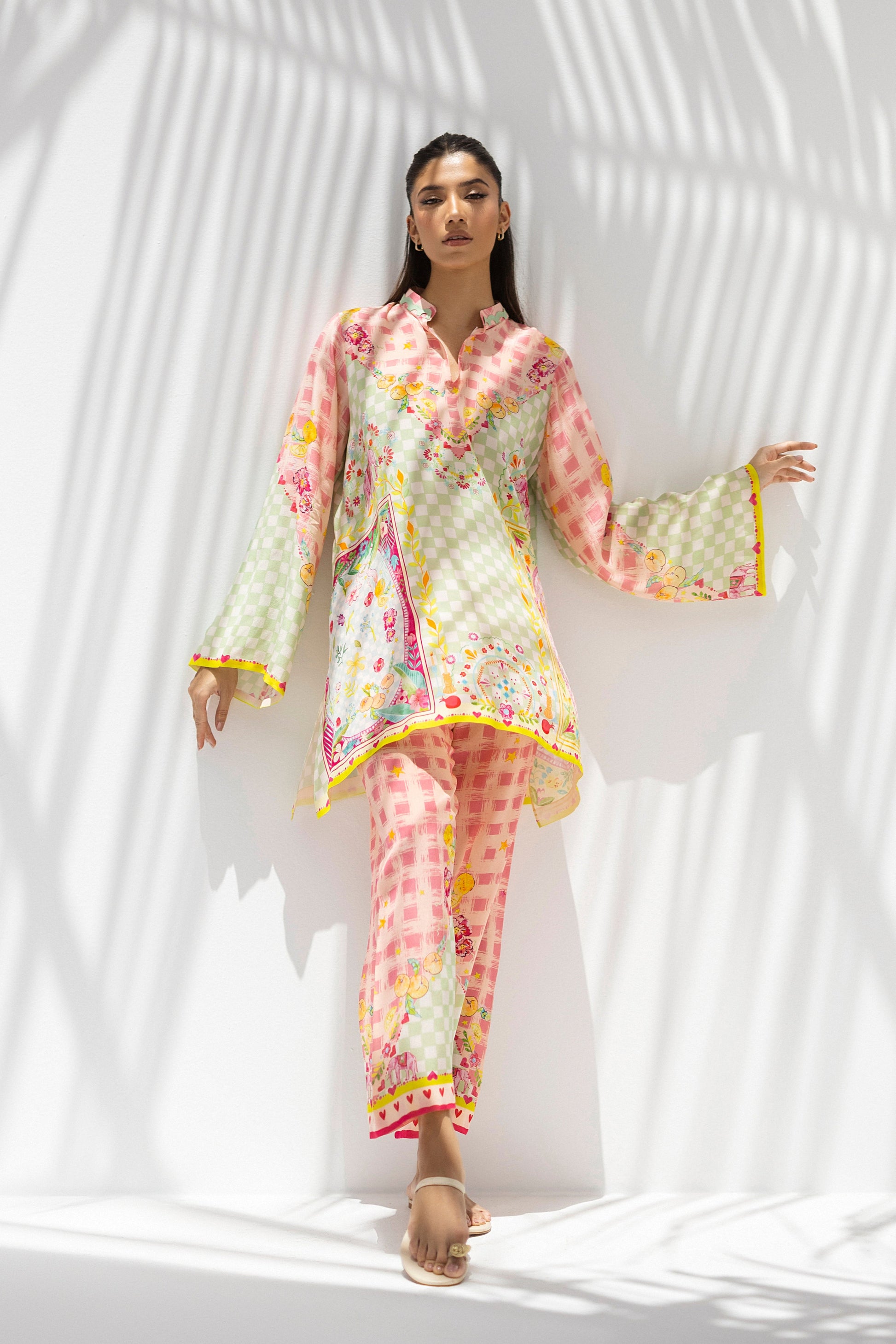 A crepe co-ord set exudes playful charm with its relaxed kurta, adorned in delicate pastel hues of tea green and blush chequered pattern, artfully accented by elephants, floral vines, fruits and vibrant hot pink hearts and pomegranates. Paired with perfectly tailored culottes featuring a whimsical chequered print.