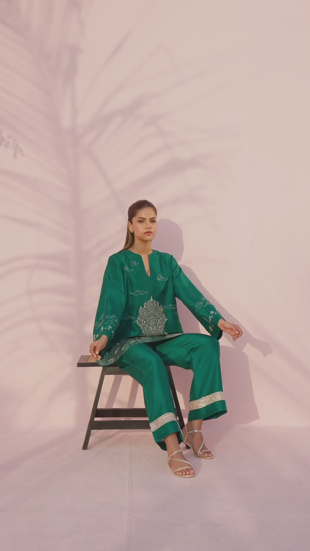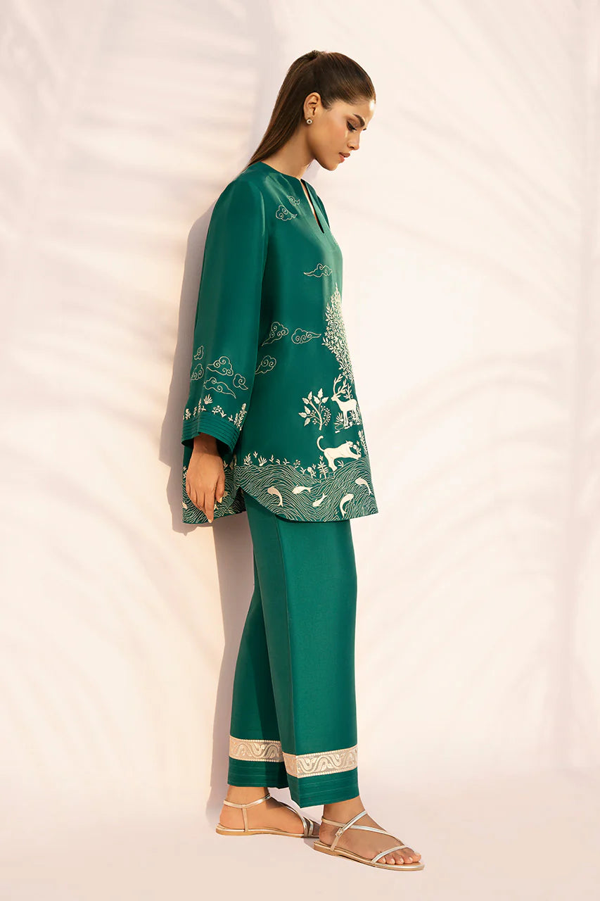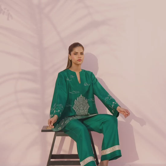 This sophisticated plum pure rawsilk ensemble features a short shirt intricately adorned with cream embroidery depicting a serene woodland scene, with deer, tigers, and a central tree of life. The design is accented by a split neckline and wide flared sleeves detailed with delicate cloud and celestial motifs. Paired with culottes, finished with a broad cream embroidered border and pleated detailing at the hem, the look feels polished and refined.