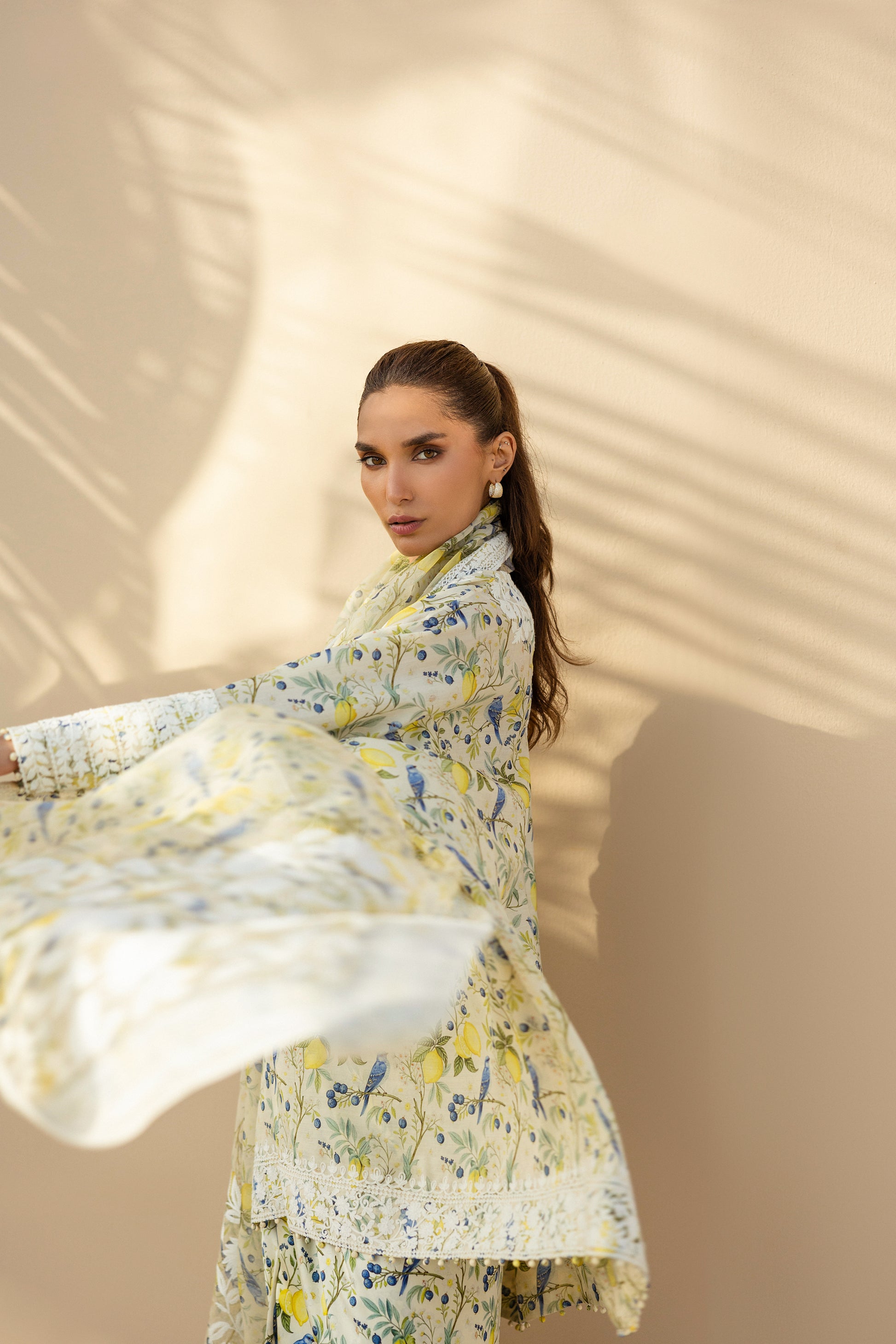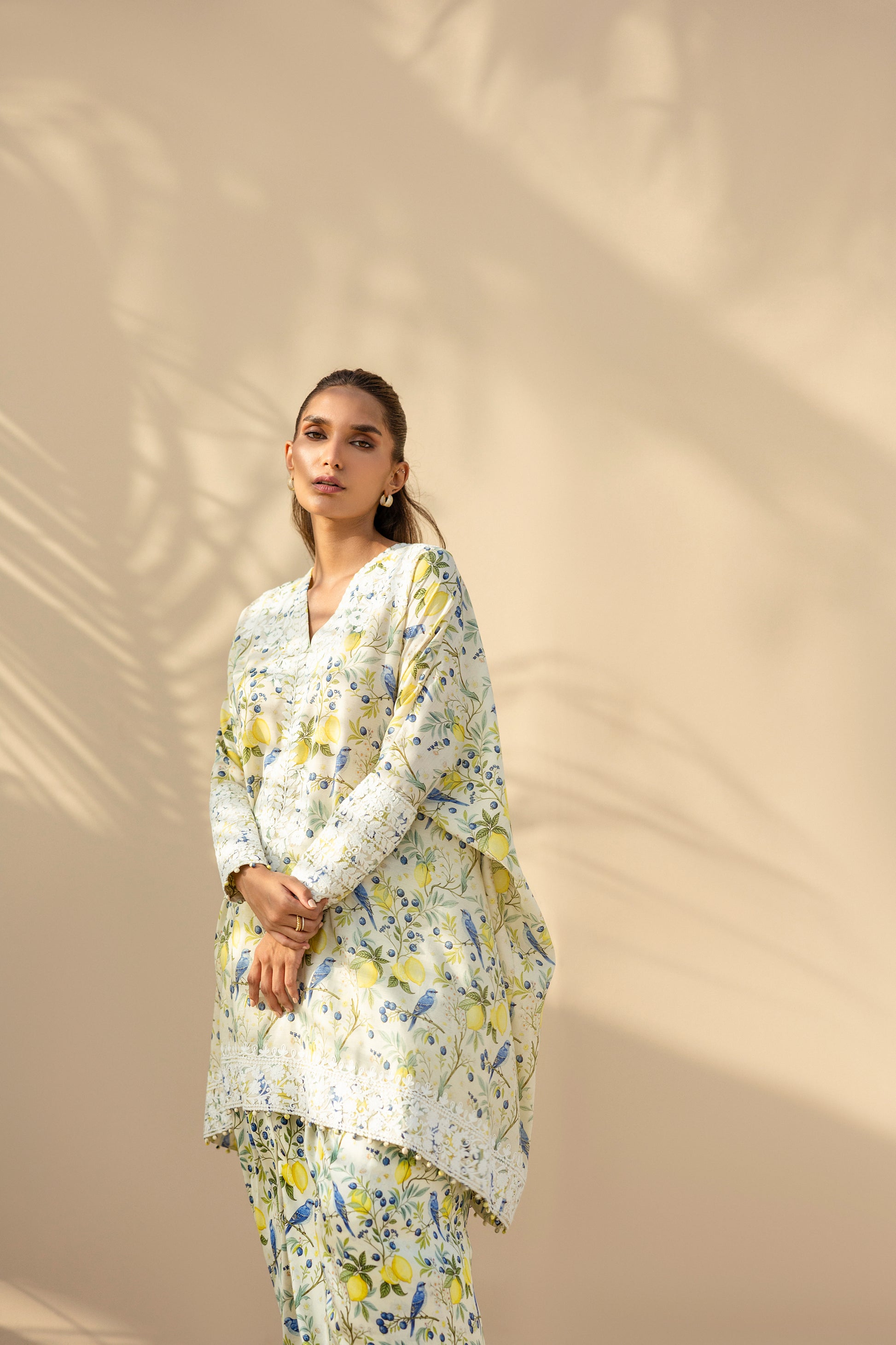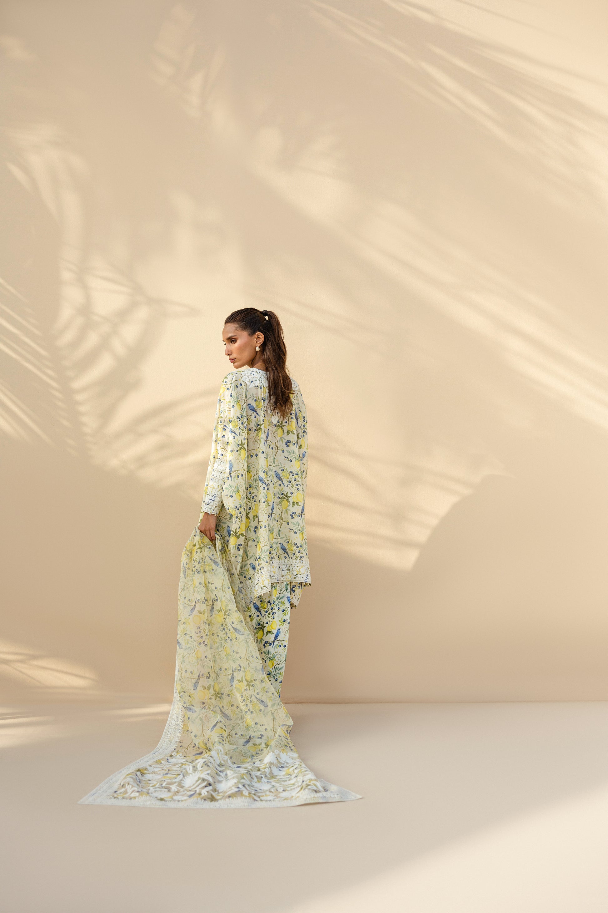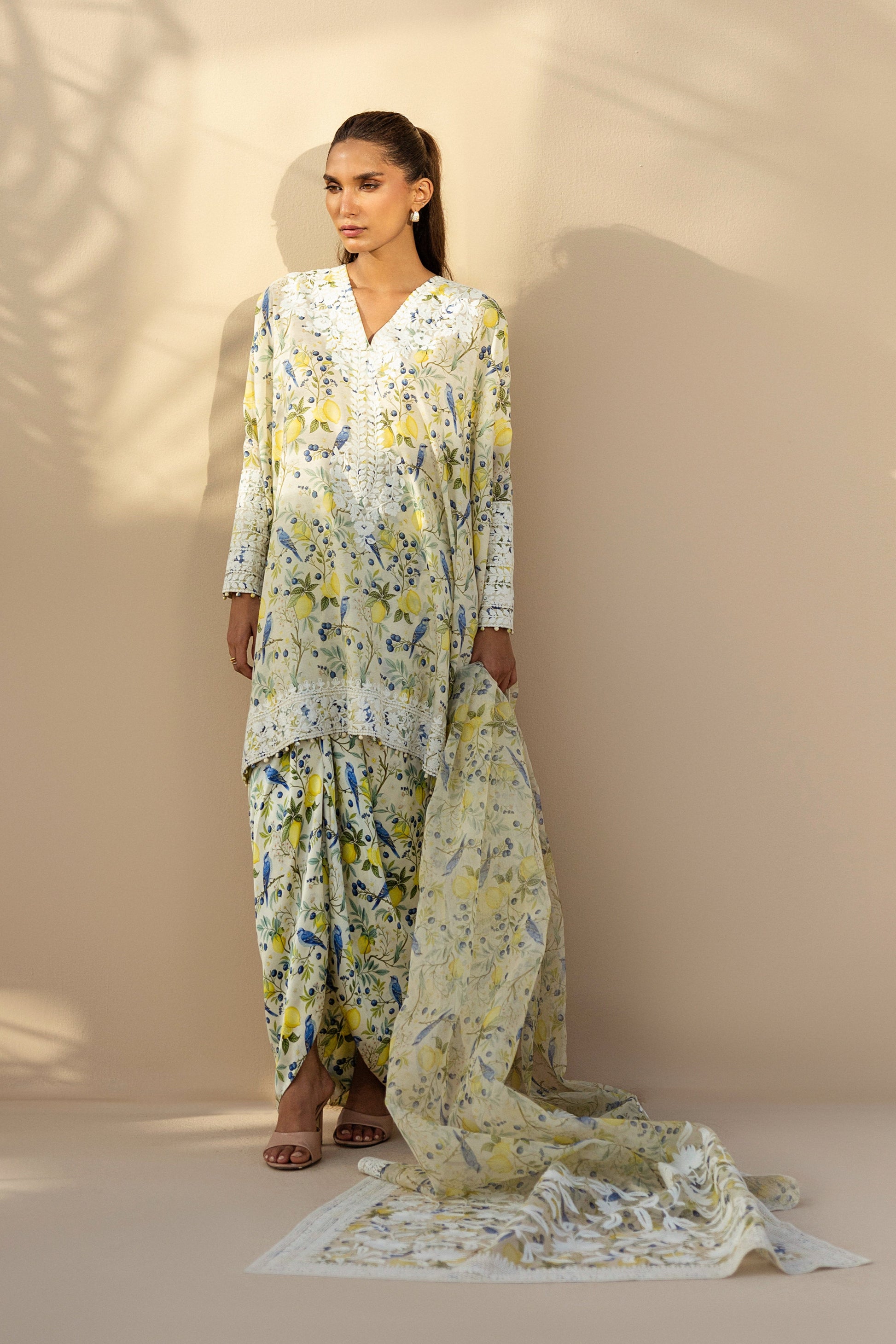Bathed in a soft eggshell hue, this ensemble is patterned with azure and lemon yellow florals and avian motifs. The delicately printed shirt is elevated with aari embroidered vines framing the neckline, sleeves and hemline, infusing artisanal flair into its modern silhouette. It is paired with a matching printed draped skirt in charmeuse and a flowing organza dupatta with an aari embroidered pallu, lending the look a touch of regal grace.
