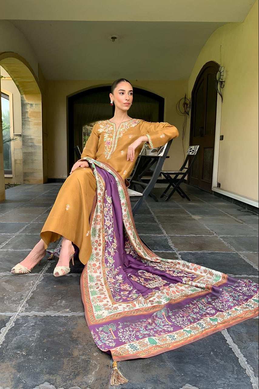 Crafted from pure raw silk, this medium-size suit blends elegance with comfort. The embroidered mustard kameez is beautifully paired with a rich plum printed and hand embroidered dupatta, creating a refined and timeless look. Perfect for festive gatherings, celebrations, and elegant daywear.