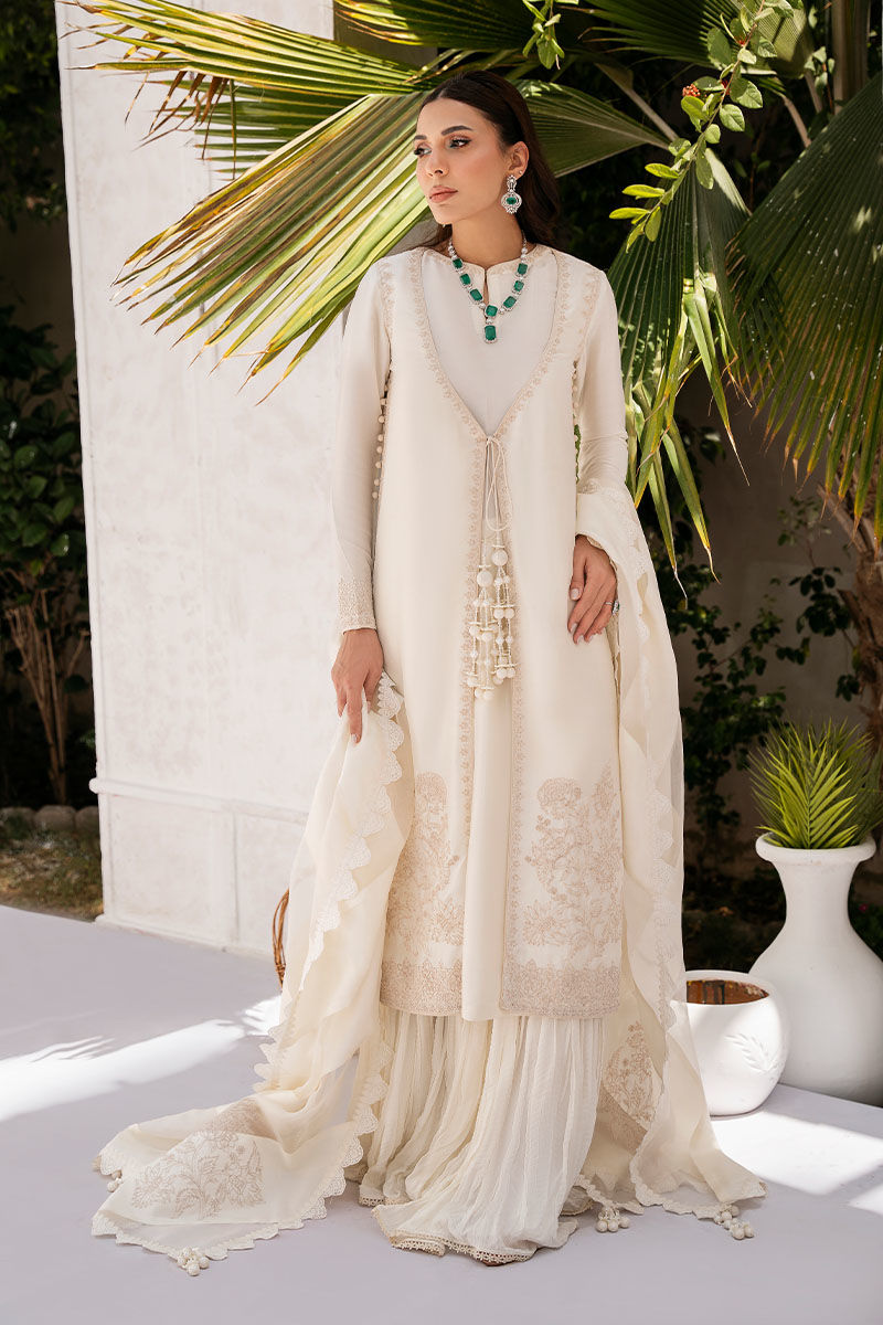 An elegant all-ivory ensemble featuring a front-open, full-sleeved jacket paired with a sleeveless inner, both crafted from the finest raw silk and adorned with intricate Kashmiri embroidery. The dupatta offers a contemporary twist on traditional chatta-patti, enhanced with delicate, artisanal embroidery. A crushed dhaaka lends the perfect touch of texture and movement, completing the look with grace and understated sophistication