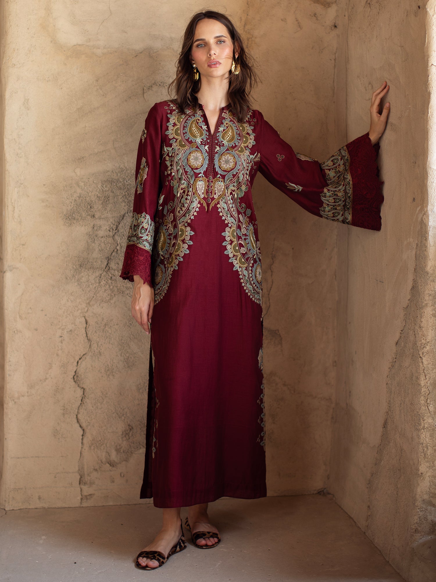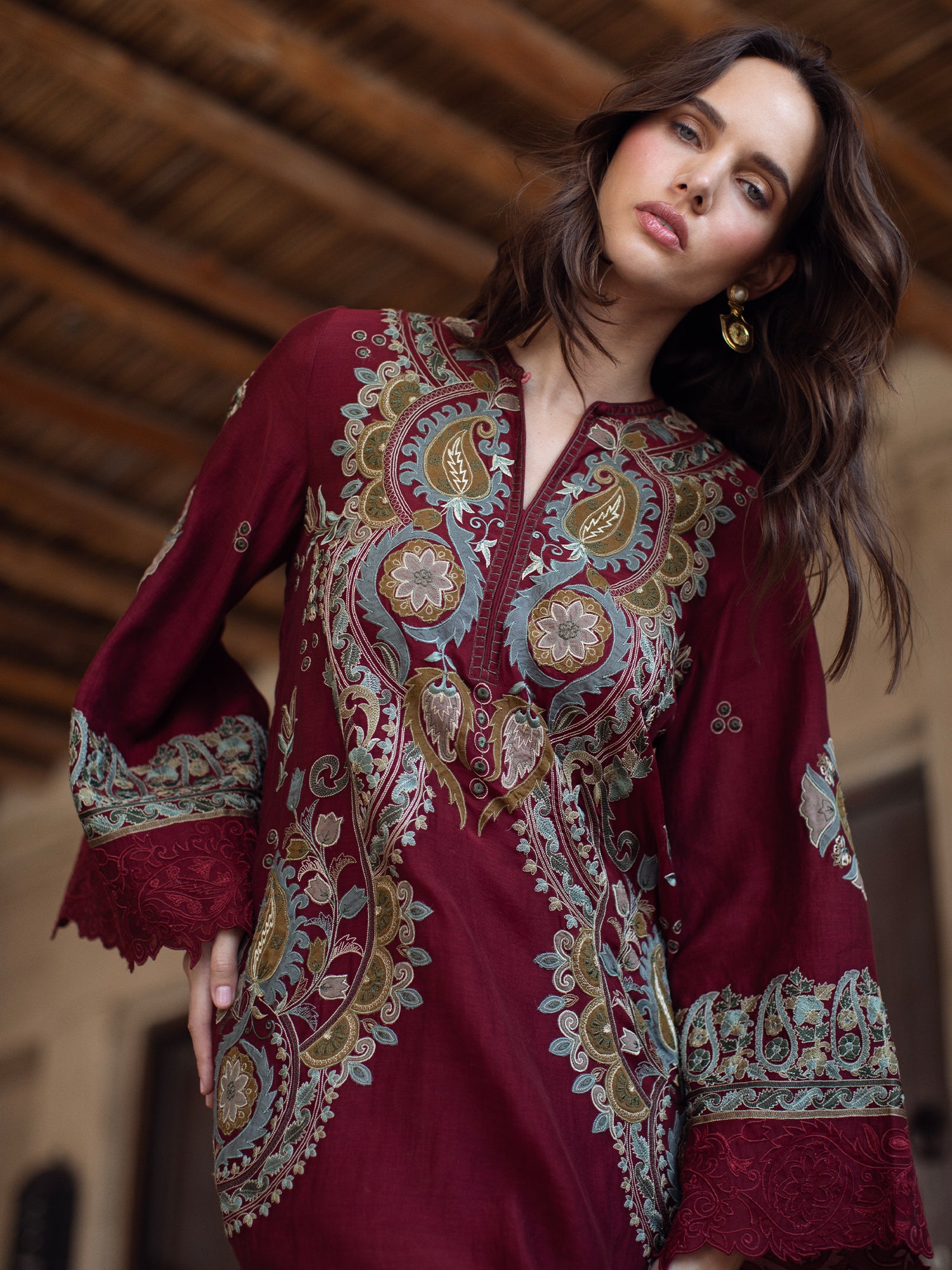 Elevate your festive wardrobe with our colgate maroon Savannah. It showcases multi aari embroidery with applique accents inspired by suzani motifs and is further elevated with reversed applique embroidered borders on the cuffs. Perfect for moonlit occasions, this is the perfect addition to your festive wardrobe.
