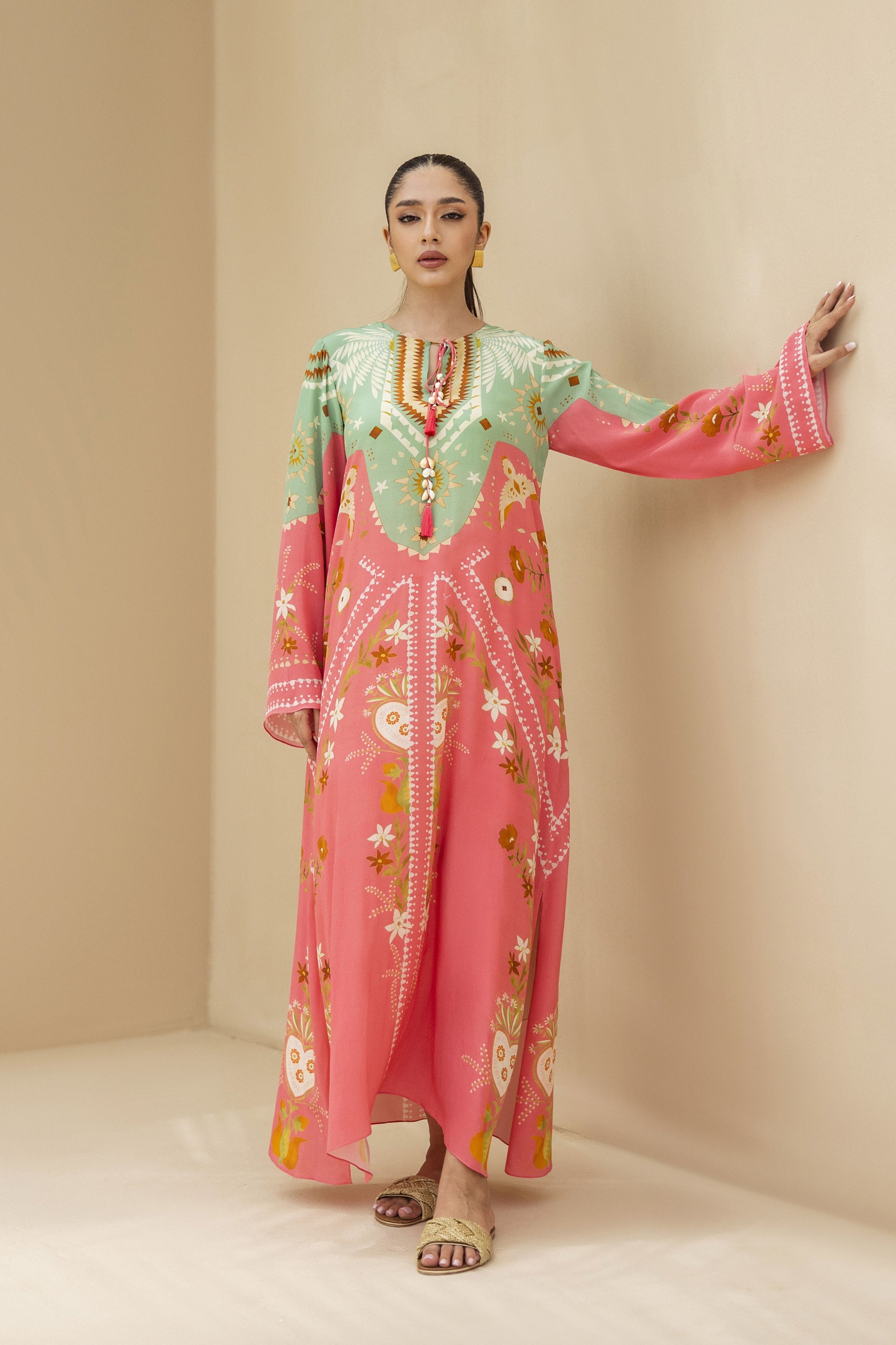 A flowing crepe kaftan, color blocked in a mint and flamingo pink hue, offers the perfect canvas for intricate folkloric inspired motifs. The print blends geometric and floral patterns in shades of ivory, burnt orange, ochre, and olive, arranged symmetrically to create a flattering elongating effect. A tasseled slit at the neckline is framed by a geometric border and a delicately mirrored palm motif, striking a balance between artistry and effortless sophistication.