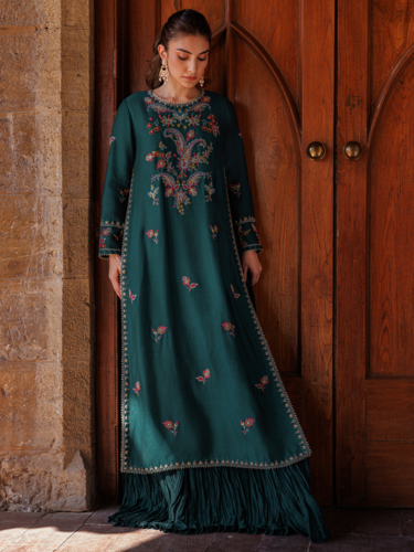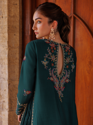 Ideal for all your evening soirees, our statement teal side slit showcases multi hued resham embroidery with zardozi work in complementing hues inspired by Mughal paisleys motifs. Paired with a matching crushed innerkali, It is truly an exquisite ensemble that moves gracefully with every step and is sure to make heads turn.