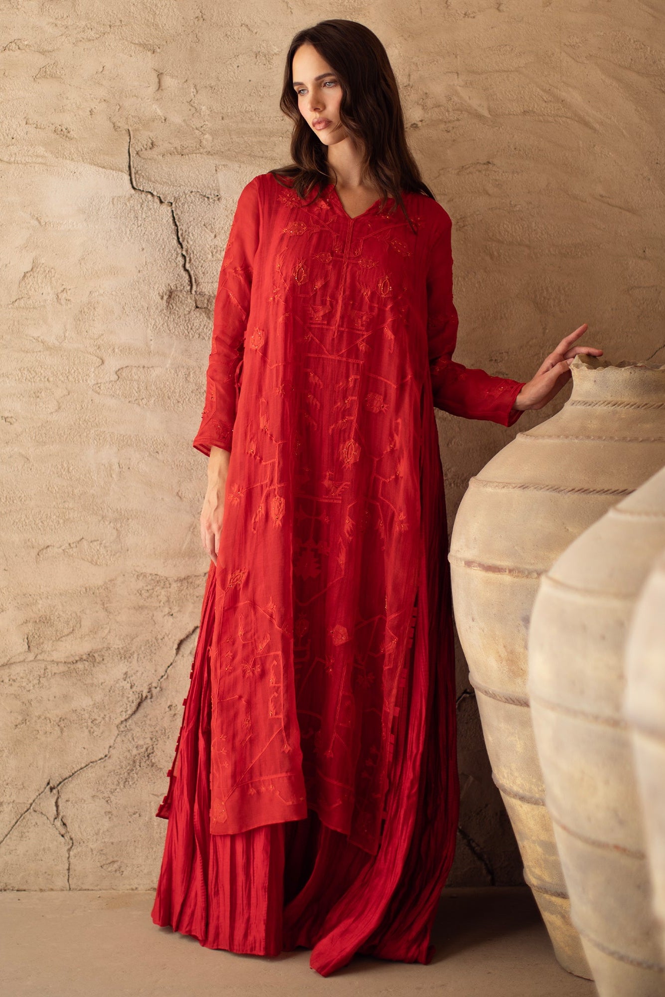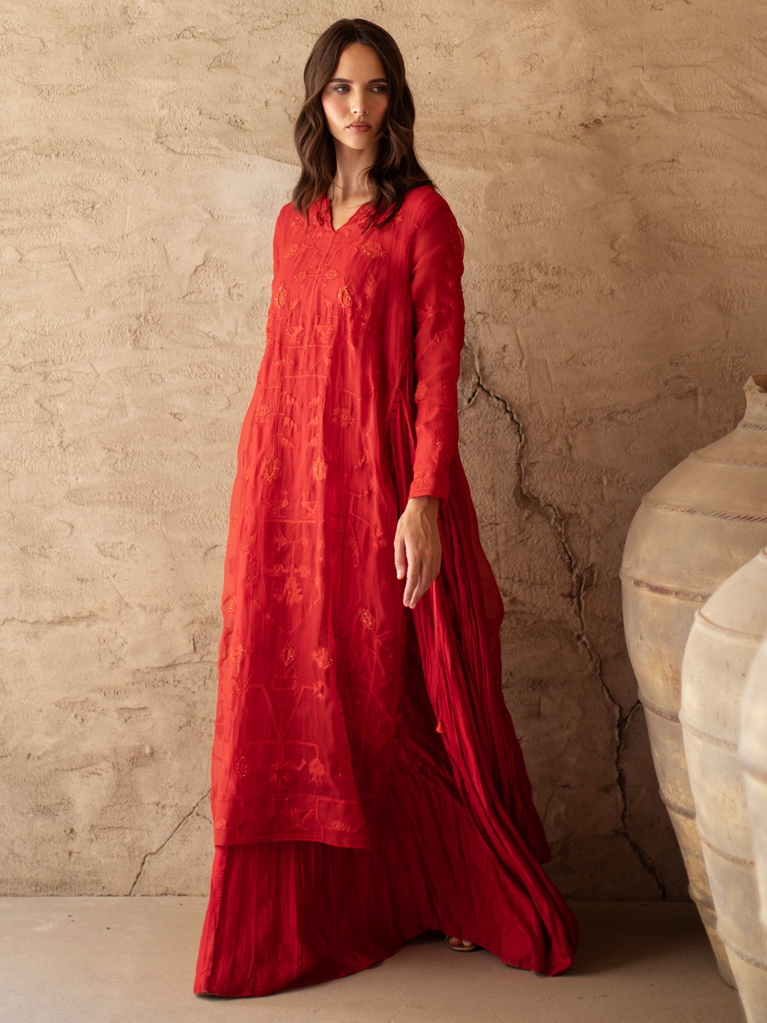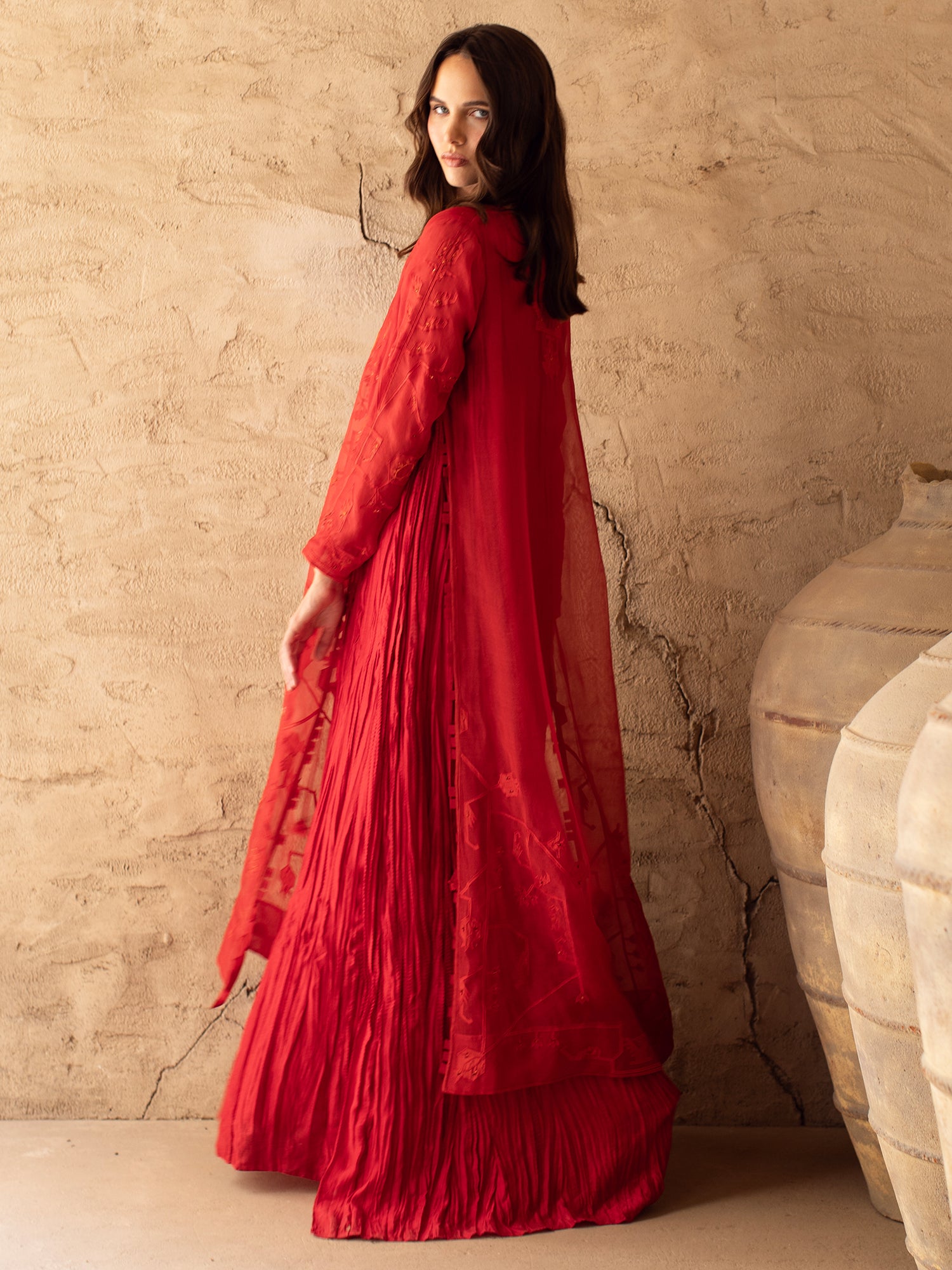 Side slit is a versatile piece that is perfect for many celebratory occasions. Cut from candy apple organza, it showcases geometric appliqued motifs and is styled with a matching khaddi silk crushed innerkali, a timeless ensemble for all your festive soirees.