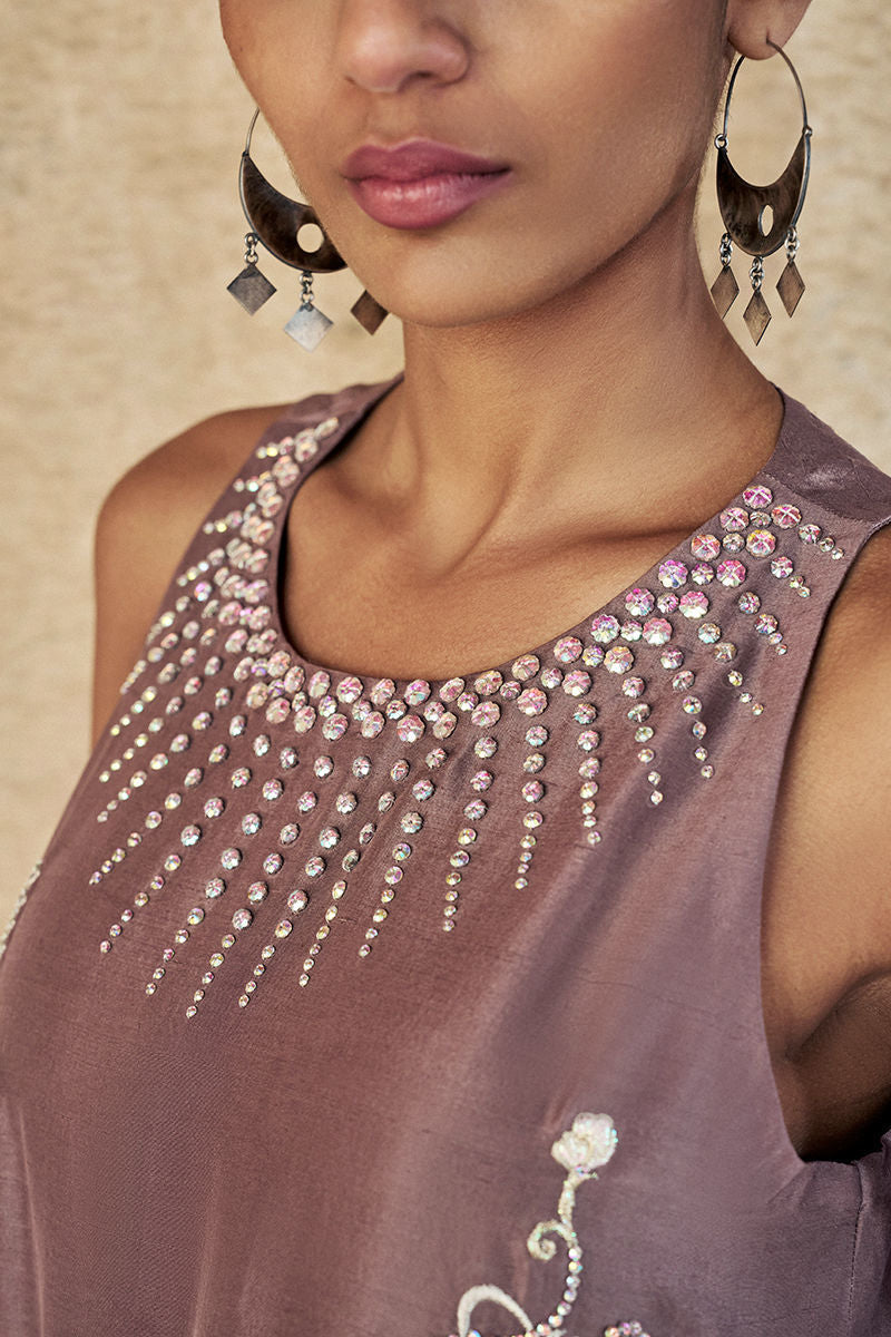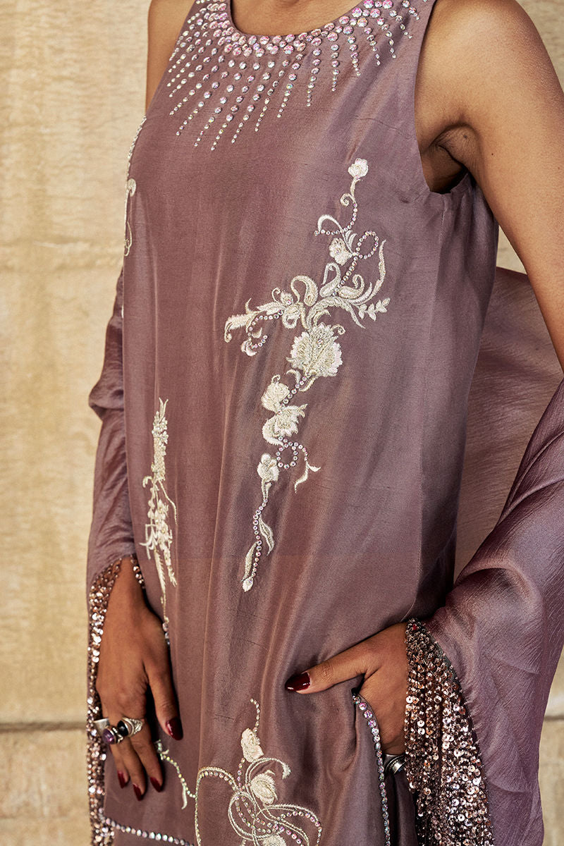 Color: Quail Fabric: Shirt: Pure Raw Silk, Flare Pants: Cotton Charmeuse, Shrug: Diamond Silk Details: Embroidered and Embellished