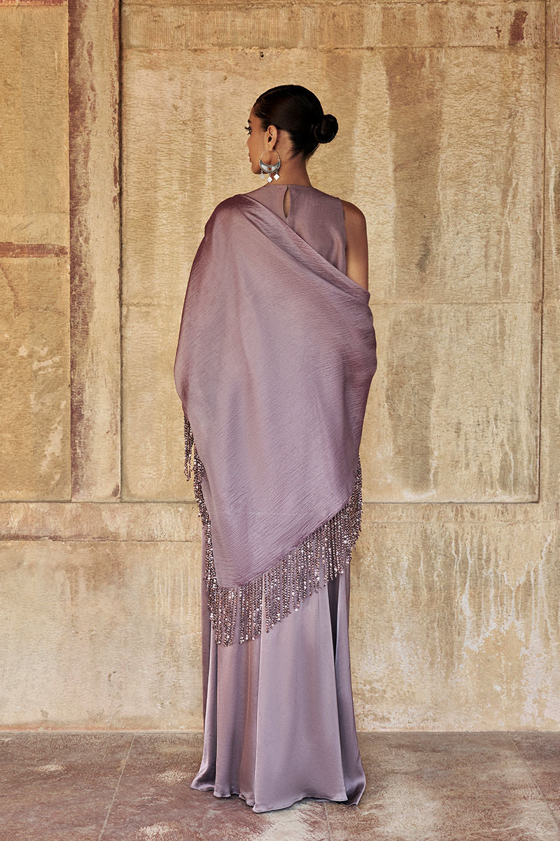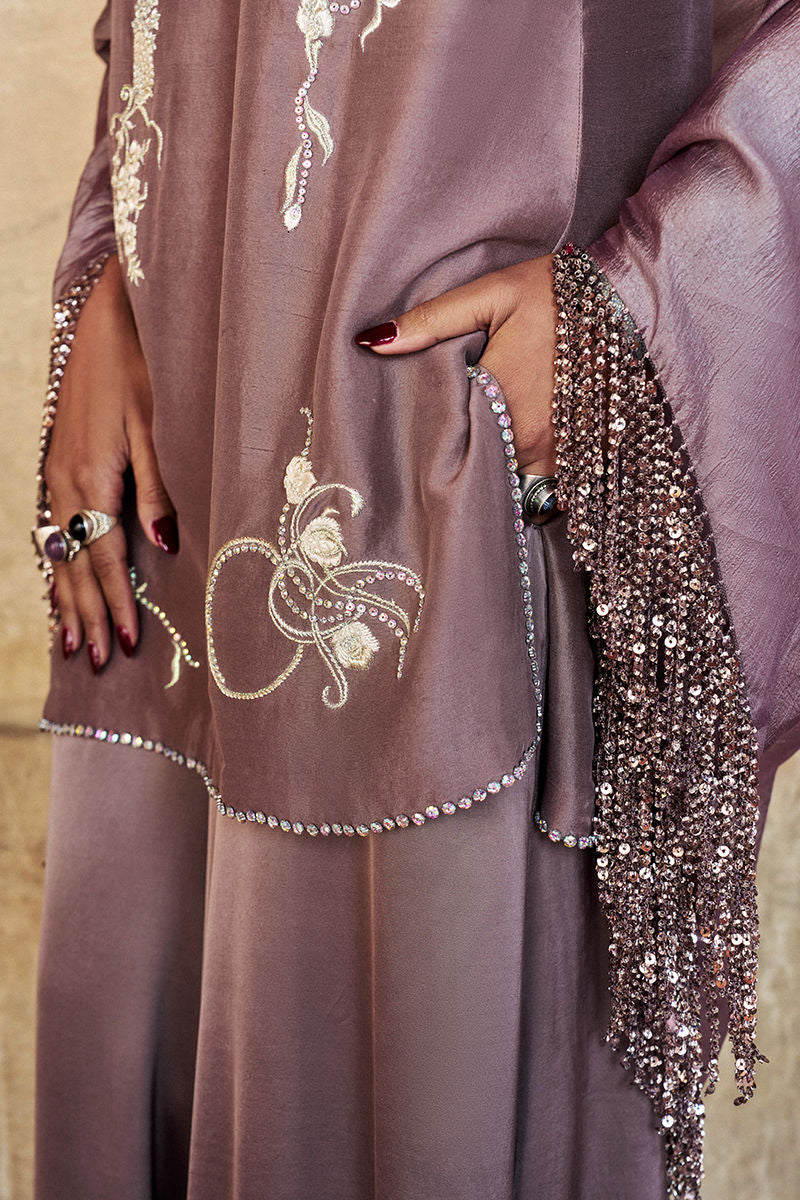 The halter short shirt is crafted from pure raw silk in an elegant quail hue, adorned with intricate stonework in varied sizes and shapes. Accented with silver and golden zari, lorix, and resham embroidery, the design reflects refined craftsmanship with a contemporary edge. It is paired with fluid cotton charmeuse flare pants for effortless movement and completed with a diamond silk shrug, adding a graceful, elevated finish to this statement ensemble.