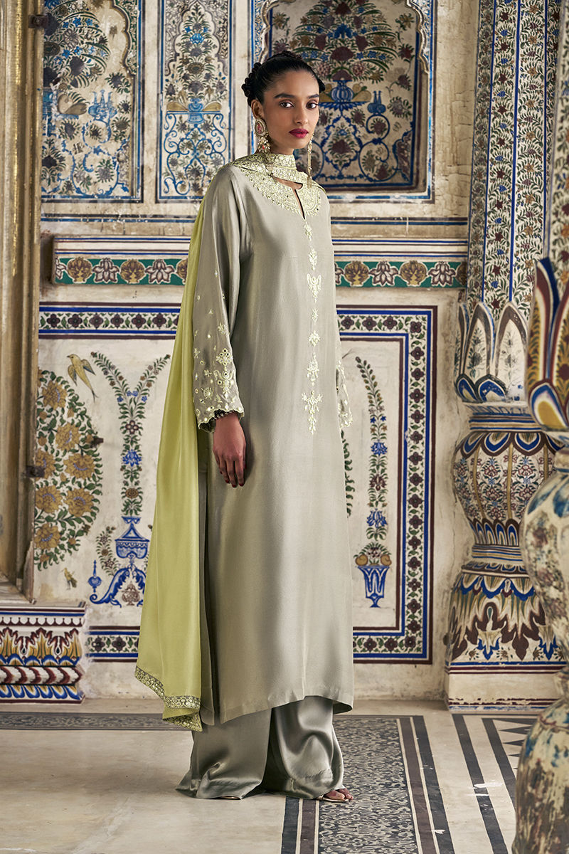 Color: Shirt and Pants: Smoke Green, Dupatta: Lime Fabric: Shirt: Pure Raw Silk, Culottes: Cotton Charmeuse, Dupatta: Medium Silk Details: Embroidered and Embellished