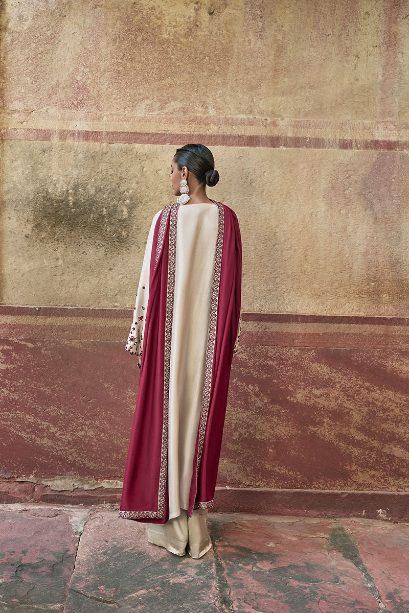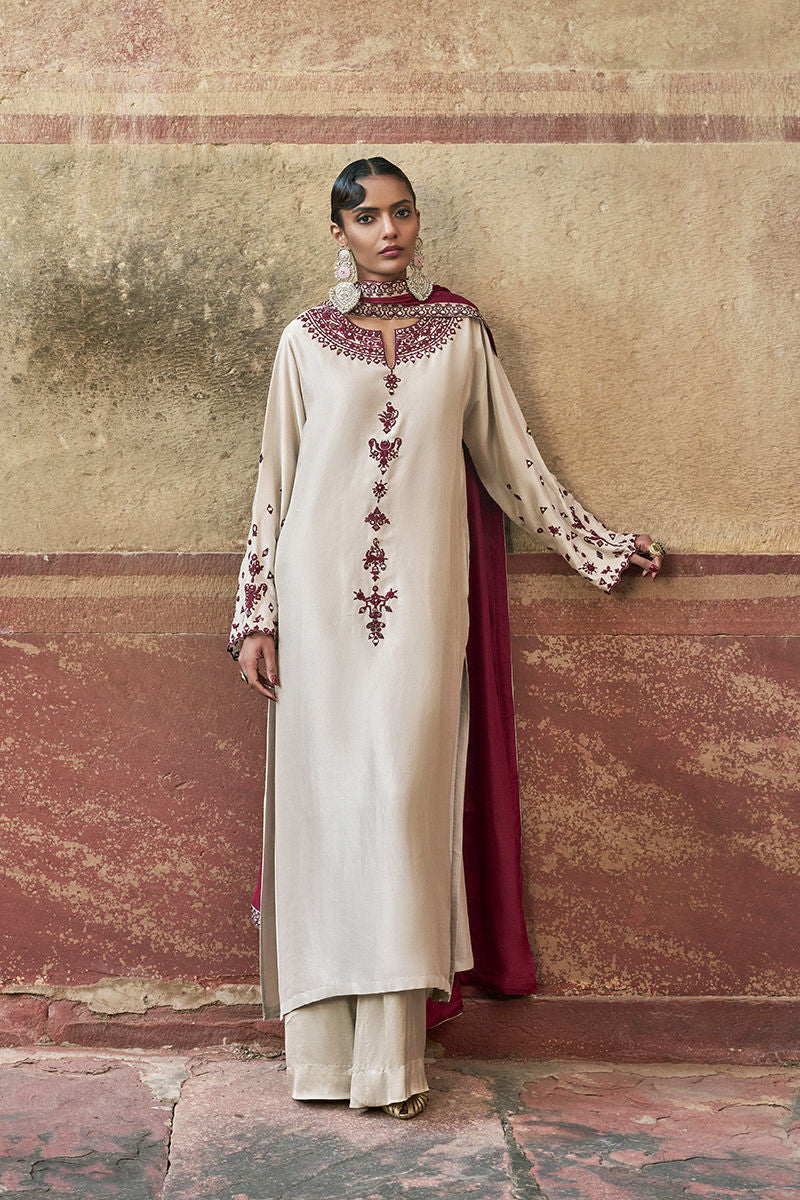 The loose-cut long shirt in birch is crafted from pure raw silk and features functional pockets, offering effortless elegance and comfort. It is paired with birch cotton charmeuse culottes for a fluid, graceful silhouette. The look is completed with a medium silk maroon dupatta, detailed with maroon resham, silver zari embroidery, and appliqué borders, adding a refined and elevated finish to this sophisticated ensemble.