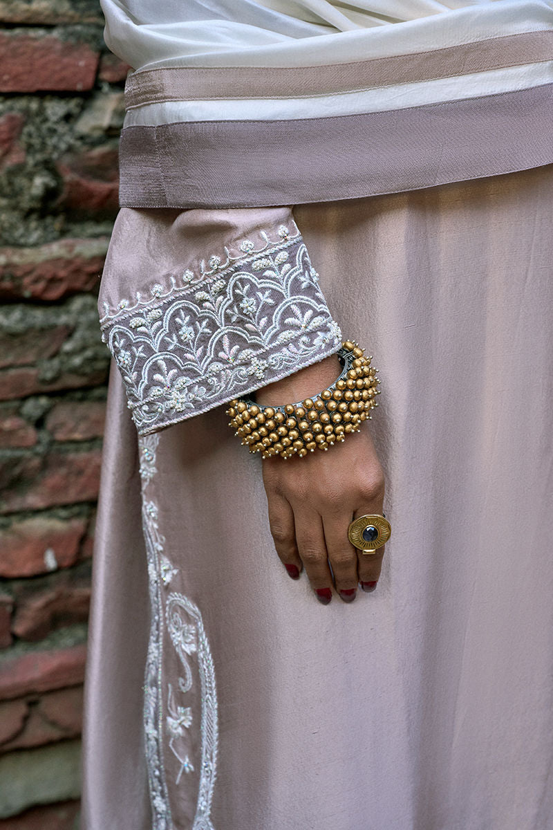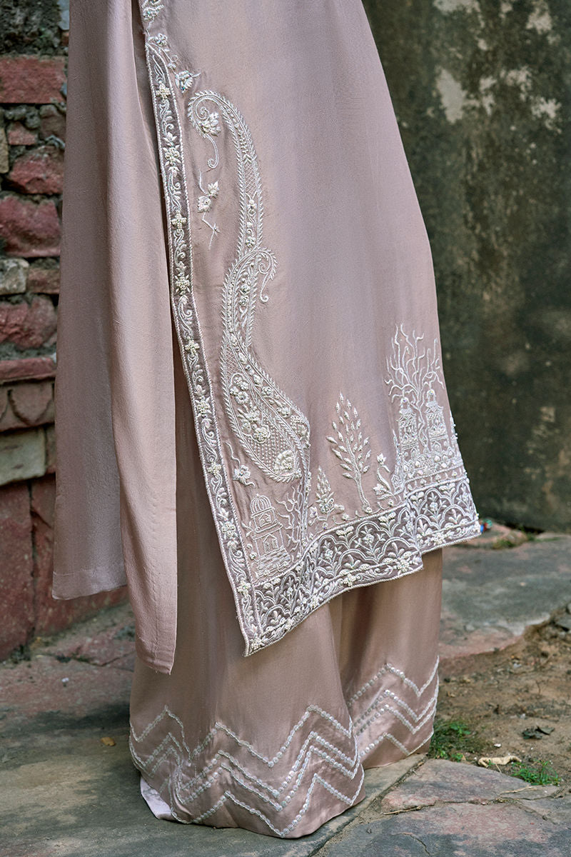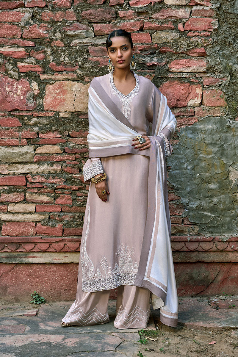 Color: Shirt and Culottes: Smoke Rose, Dupatta: Ivory Fabric: Shirt: Pure Raw Silk, Culottes: Cotton Charmeuse, Dupatta: Medium Silk Details: Embroidered and Embellished
