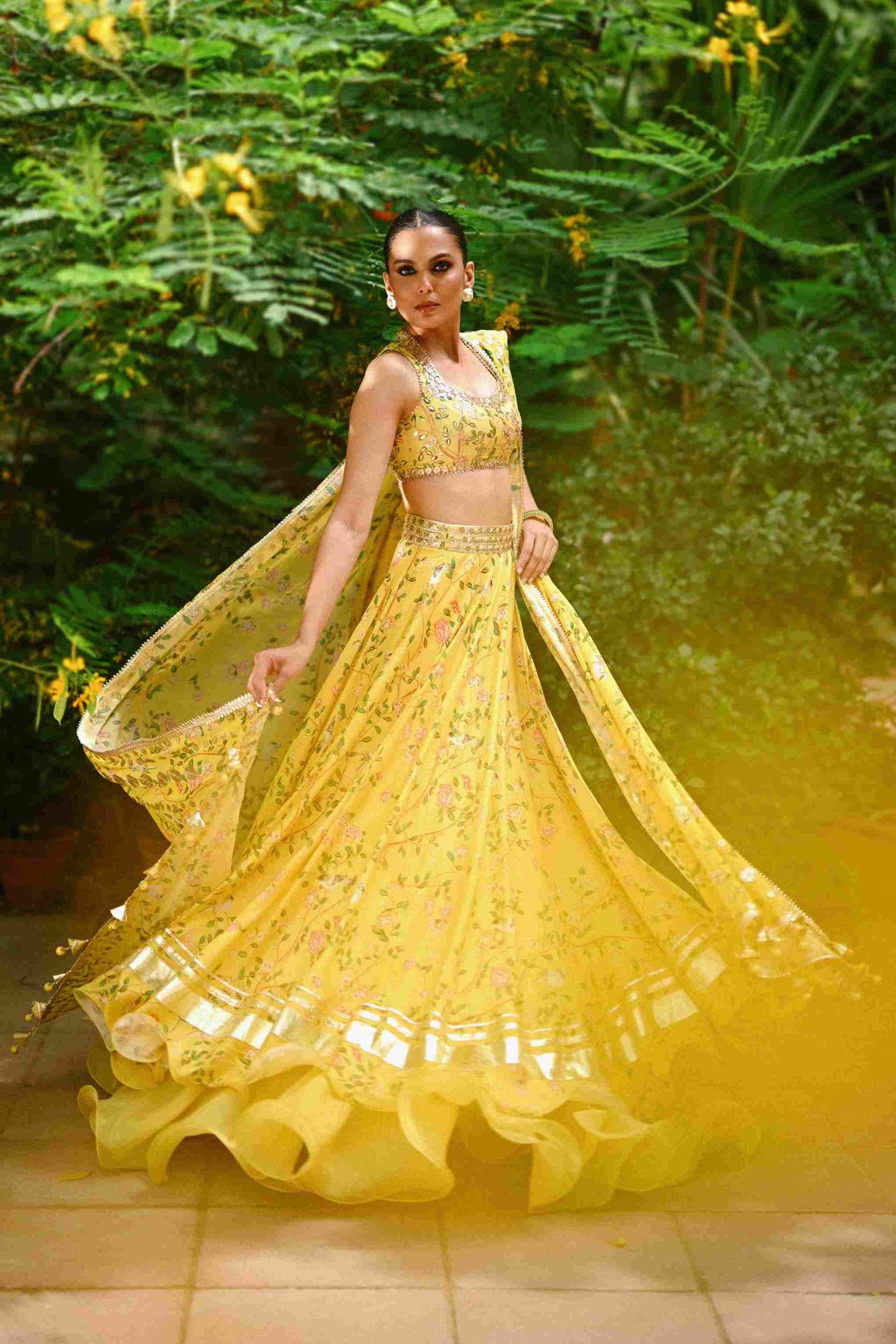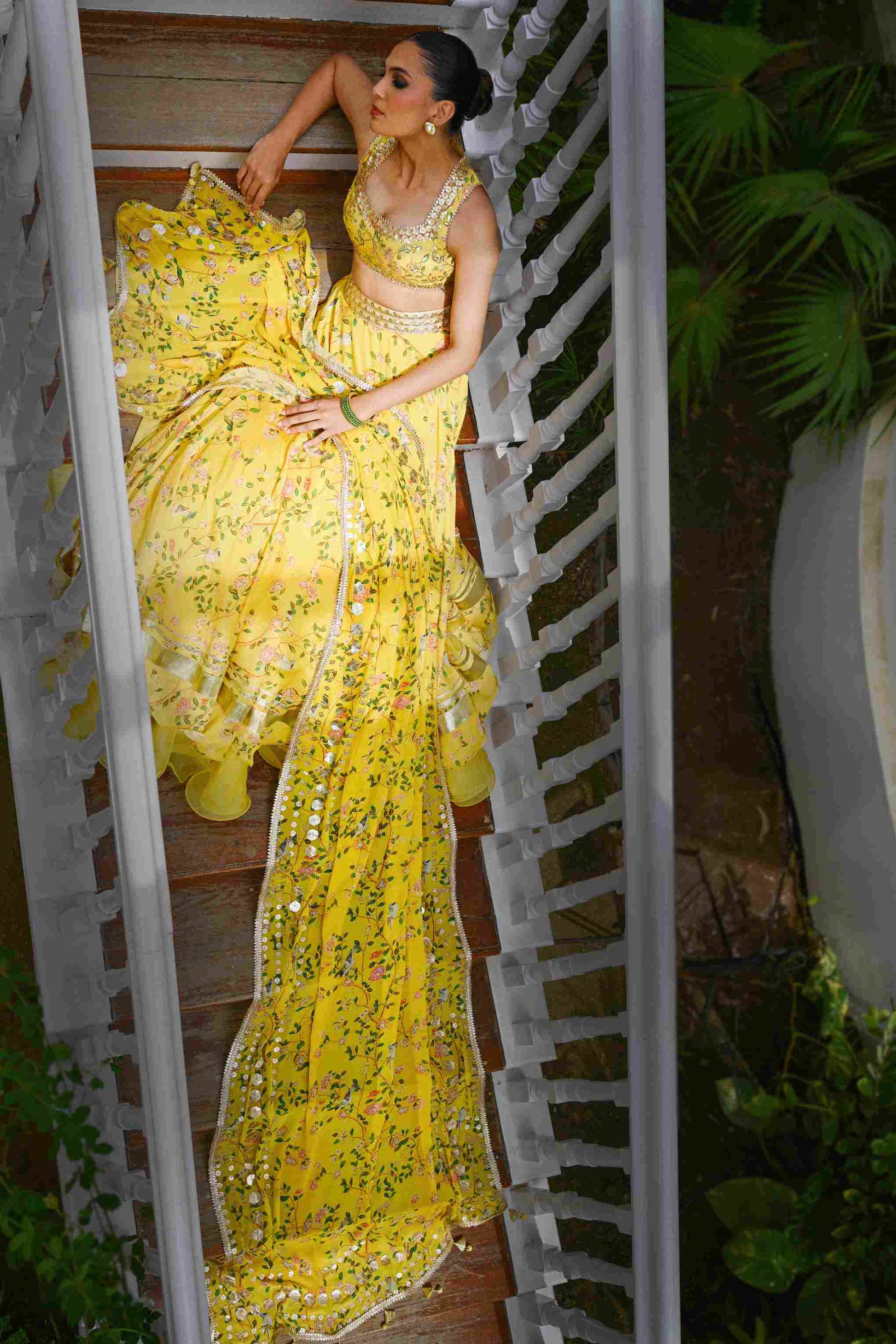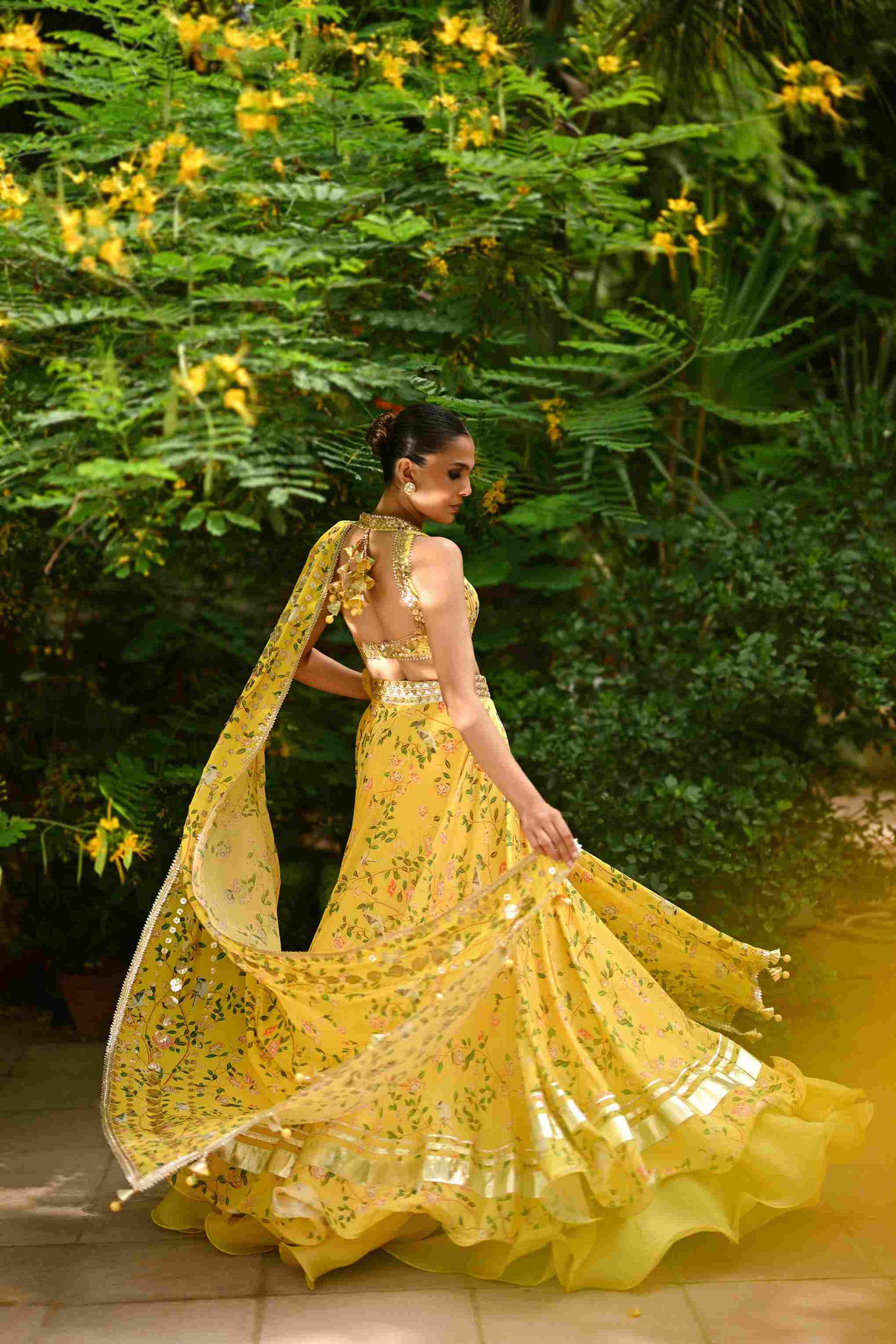 In luminous daffodil yellow, this lehenga set captures the lightness of summer with refined craft. The sleeveless khaddi silk blouse is delicately embroidered with gota, catching the sun with every movement. The flowing khaddi silk lehenga blooms with florals in soft rose and sage, its hem bordered with glistening gota and layered in cascading ruffles that ripple with ease. A matching georgette dupatta, edged in gota and finished with playful tassels, completes the ensemble in a spirit of effortless festivity.