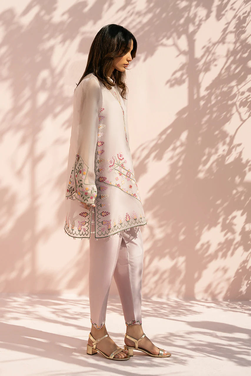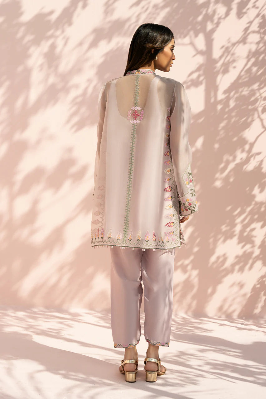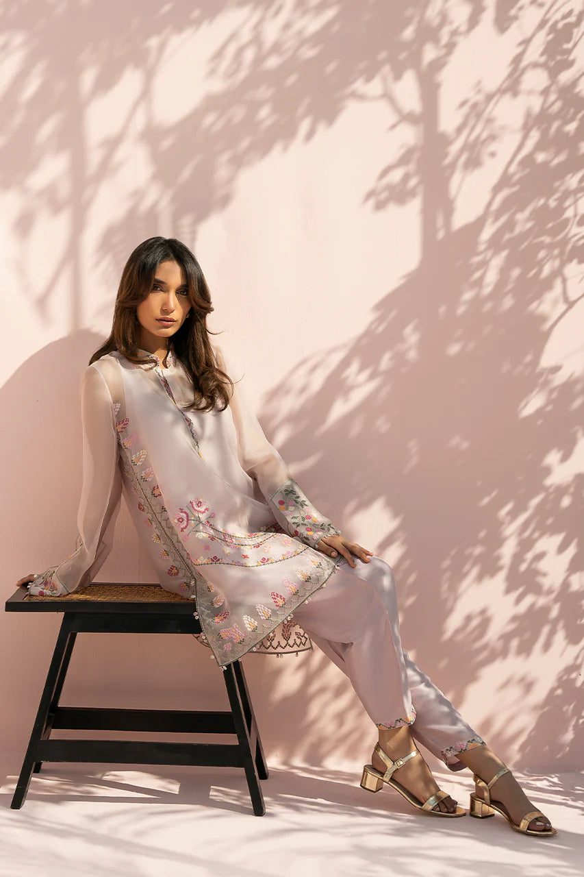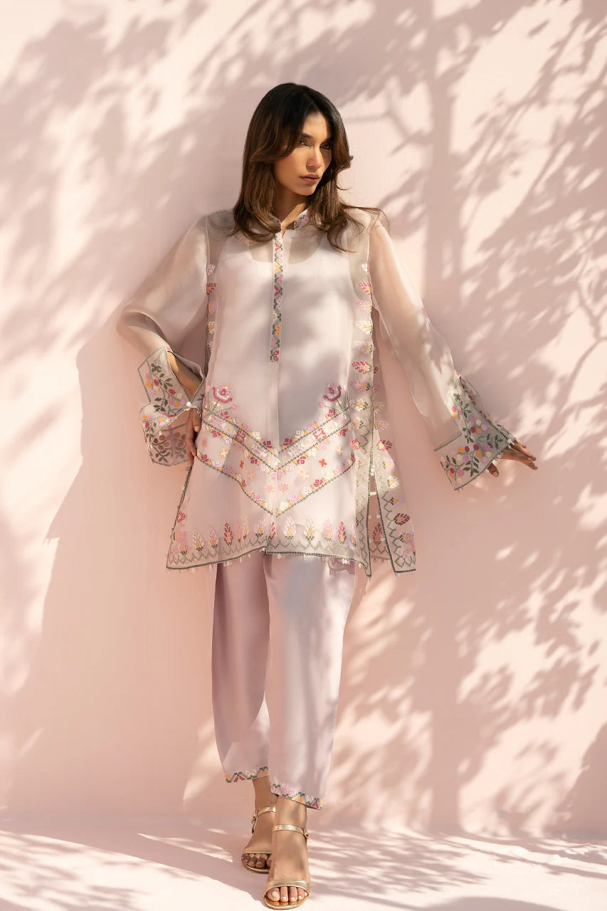 A soft lilac ensemble comes to life through sheer layering and fine embroidery. The organza shirt is cut in a relaxed silhouette with wide sleeves and a clean band neckline, finished with delicate embroidery along the placket and cuffs. Cross stitch inspired florals in tones of blush, crimson, sage, and yellow are thoughtfully placed across the front and hem, lending a gentle, handcrafted charm, while a subtle chevron embroidered border adds quiet structure. It is paired with a pure rawsilk shalwar in a matching blush tone, lightly embellished at the hem for a cohesive finish.