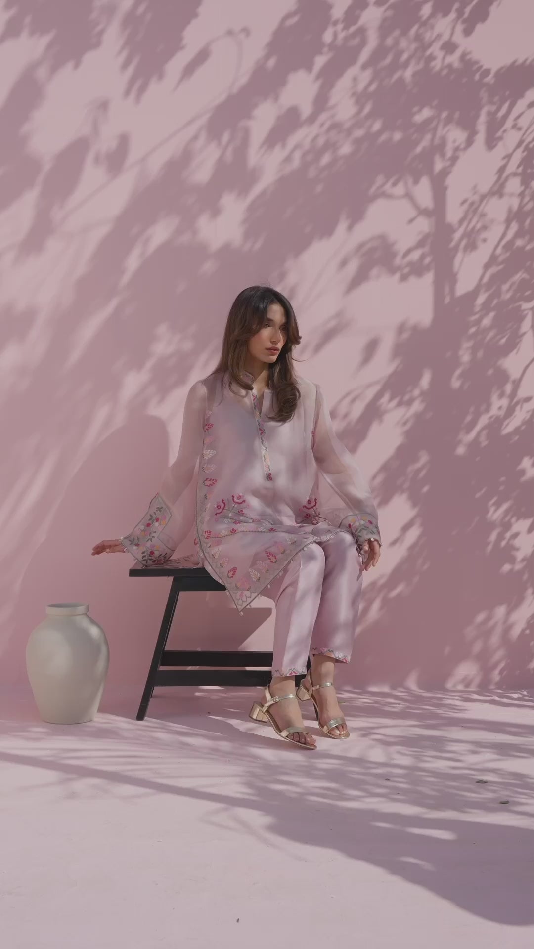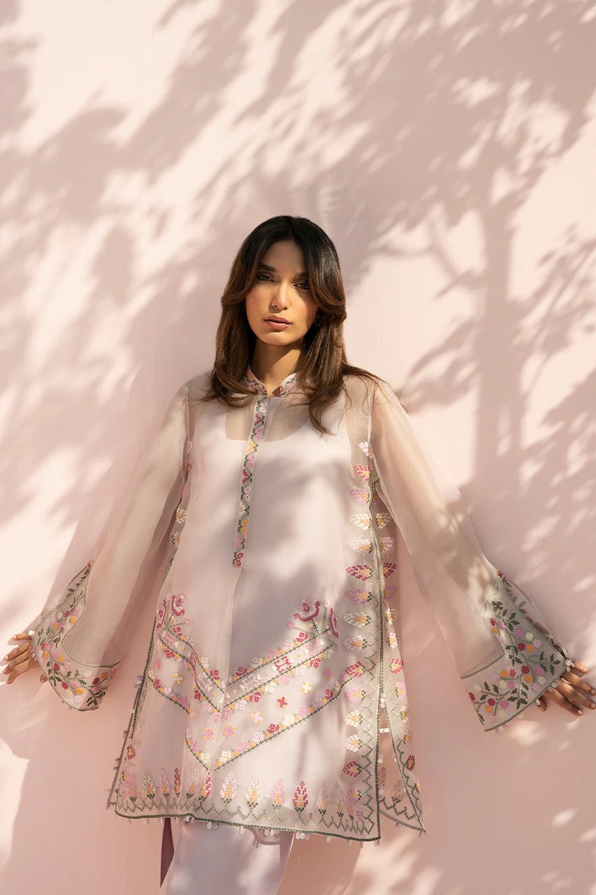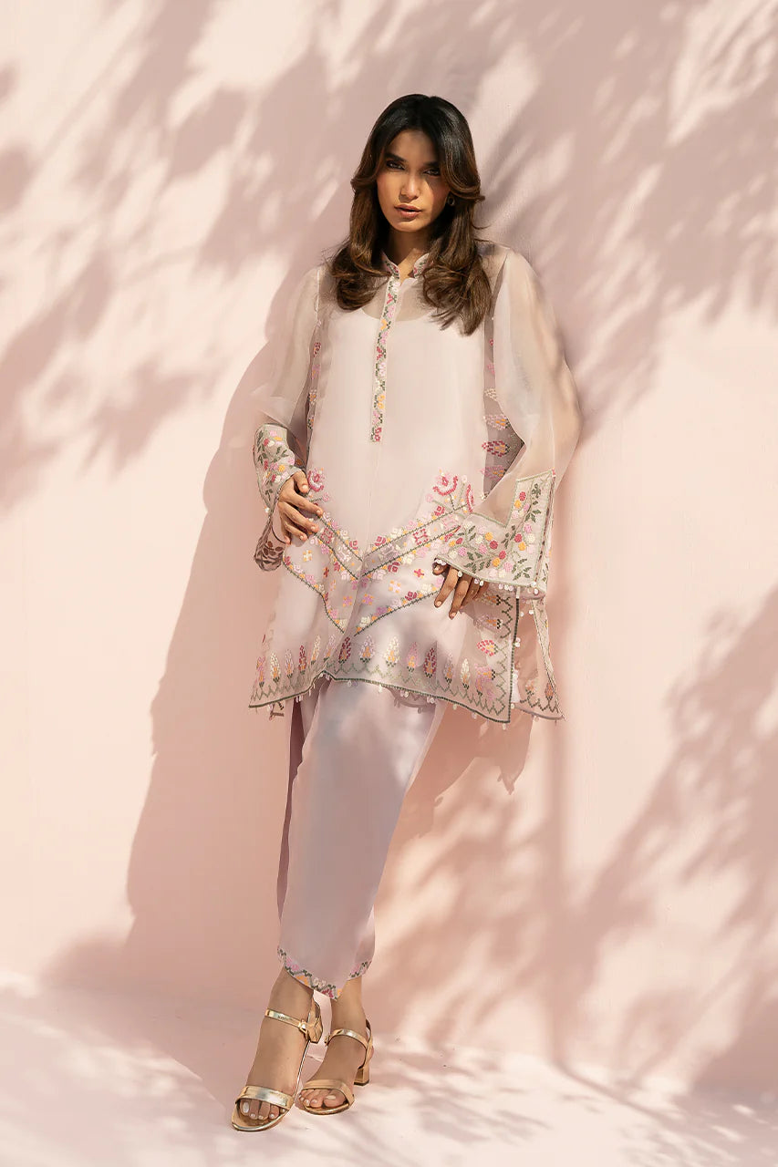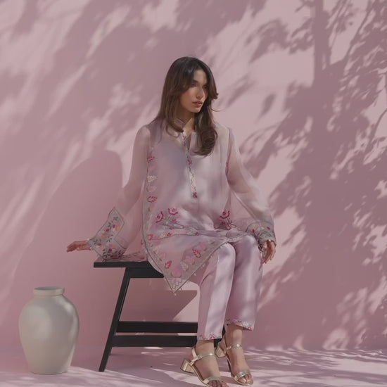 A soft lilac ensemble comes to life through sheer layering and fine embroidery. The organza shirt is cut in a relaxed silhouette with wide sleeves and a clean band neckline, finished with delicate embroidery along the placket and cuffs. Cross stitch inspired florals in tones of blush, crimson, sage, and yellow are thoughtfully placed across the front and hem, lending a gentle, handcrafted charm, while a subtle chevron embroidered border adds quiet structure. It is paired with a pure rawsilk shalwar in a matching blush tone, lightly embellished at the hem for a cohesive finish.