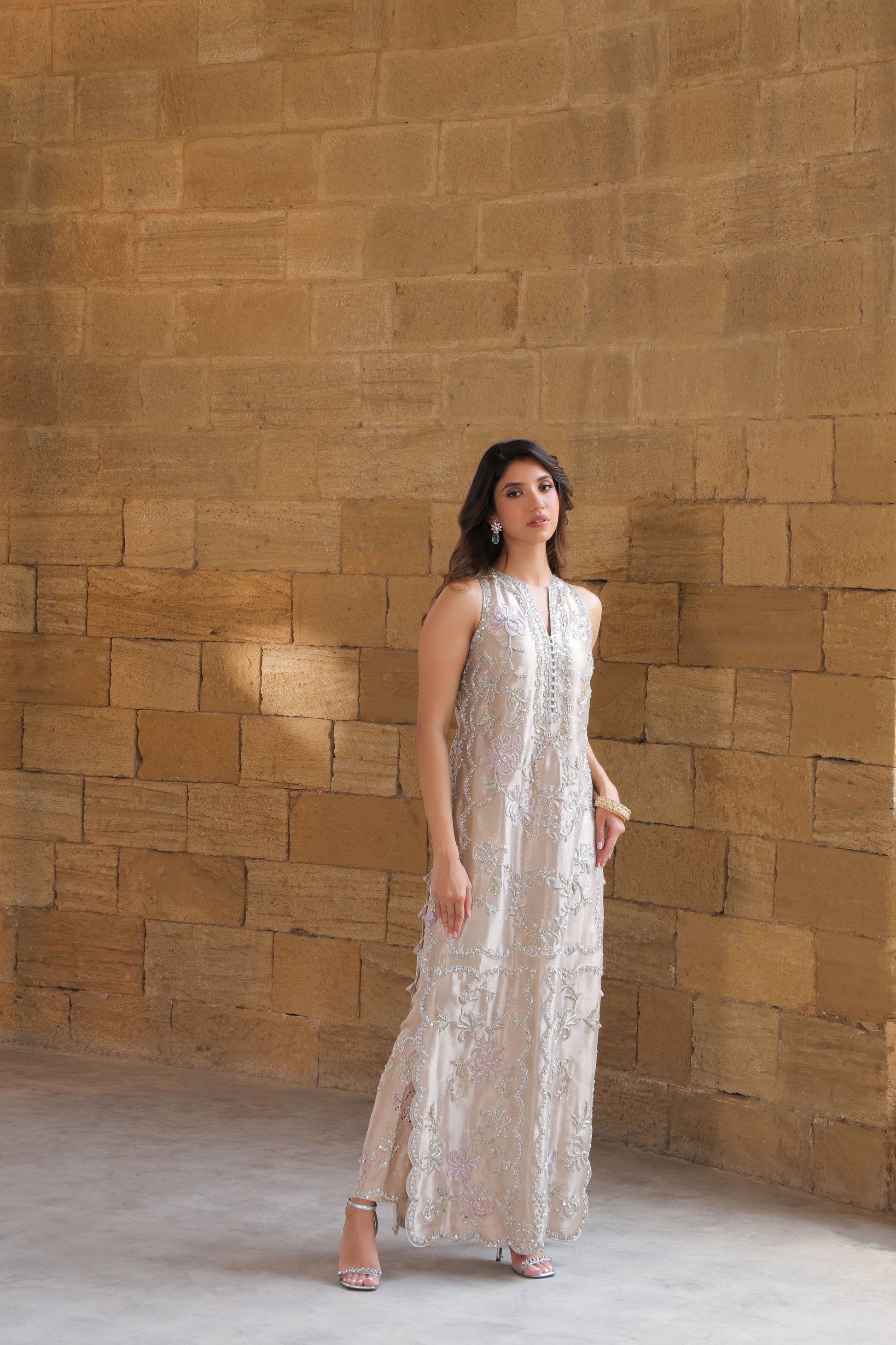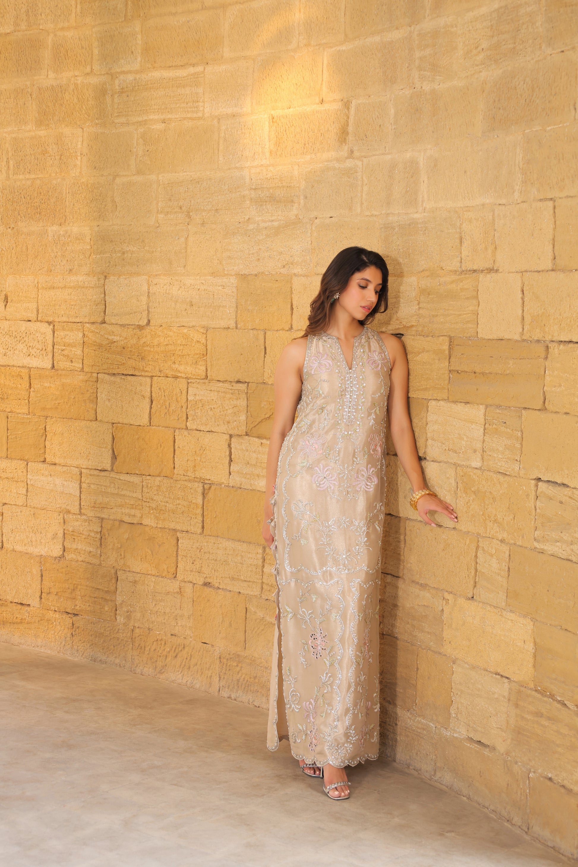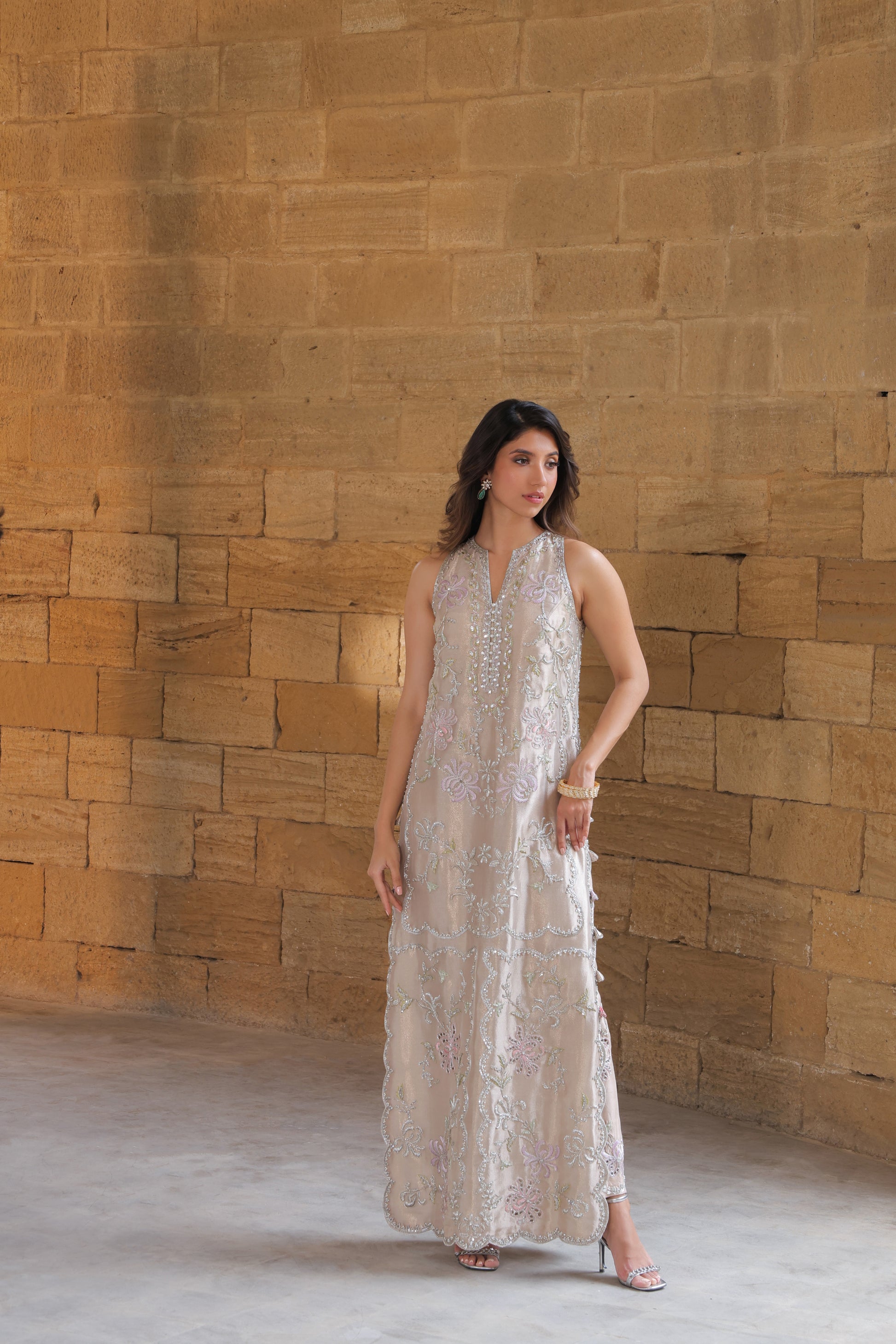 A sleeveless column shirt in metallic blush tissue shimmers with pastel resham florals, sequins, and pearls, arranged in soft scalloped bands that ripple with artisanal eyelet detail. The neckline glistens with fine zardoze accents, catching the light in quiet opulence. Paired with embellished pure rawsilk trousers, the sculptural silhouette channels the poise of couture evenings.