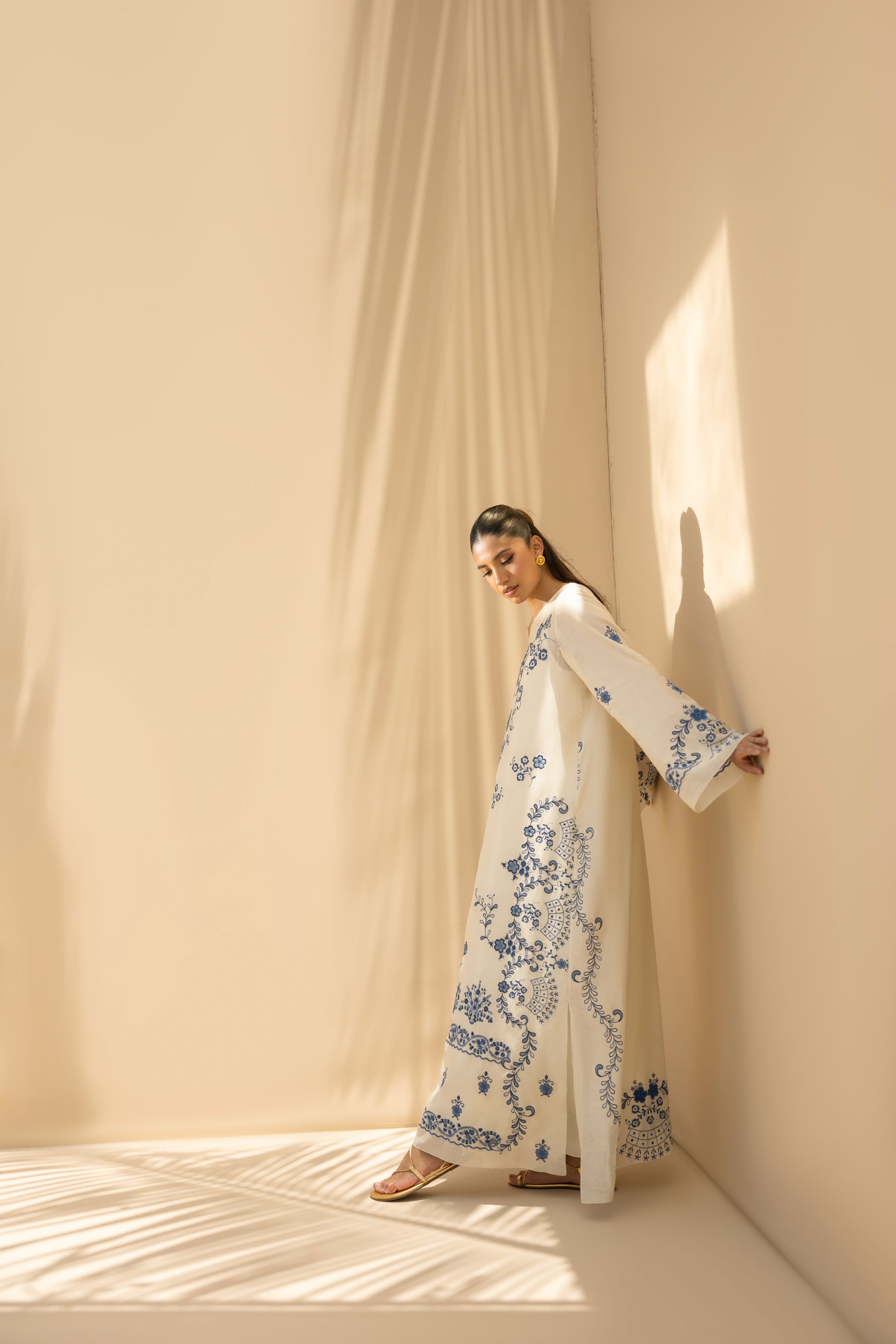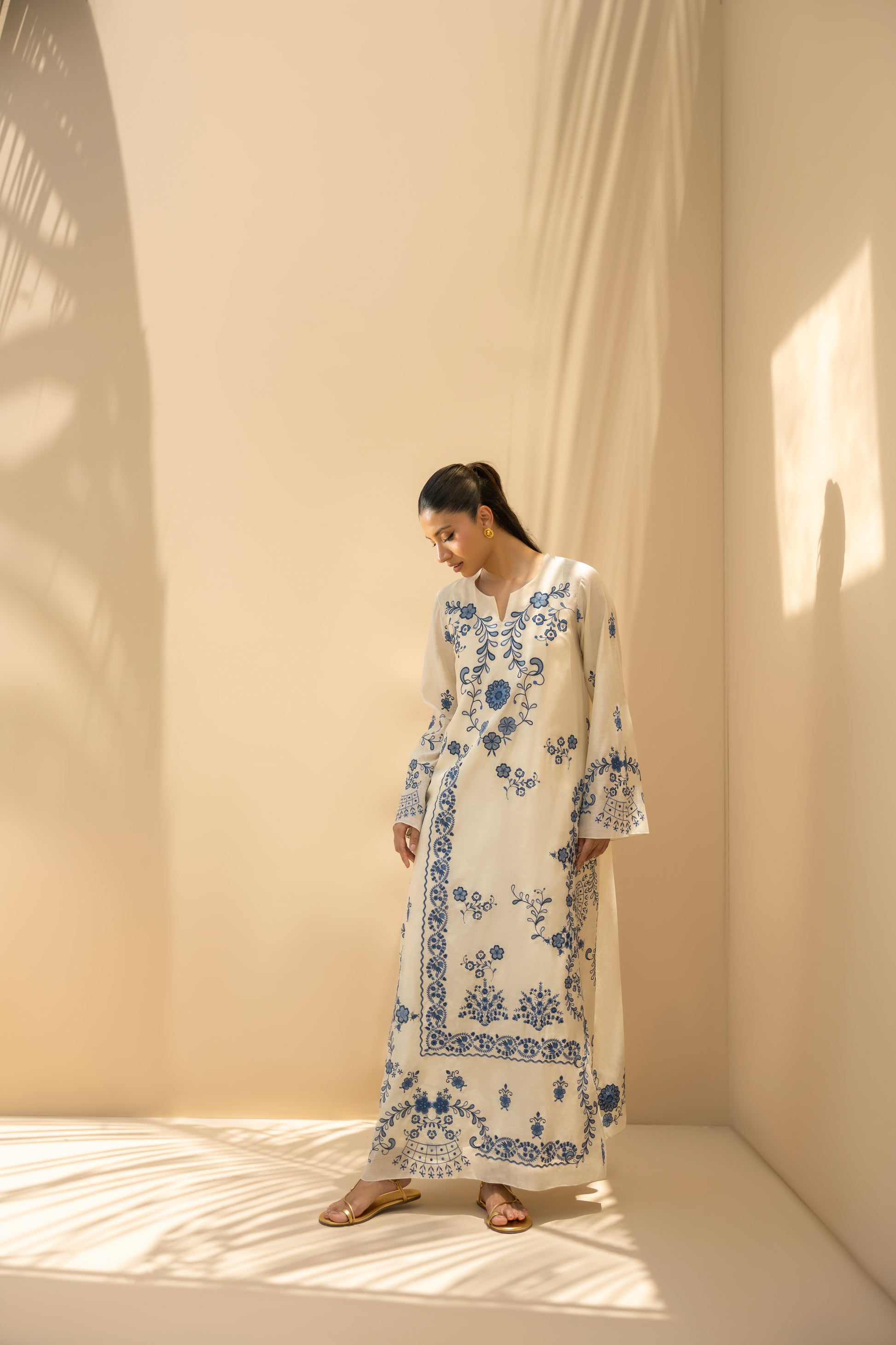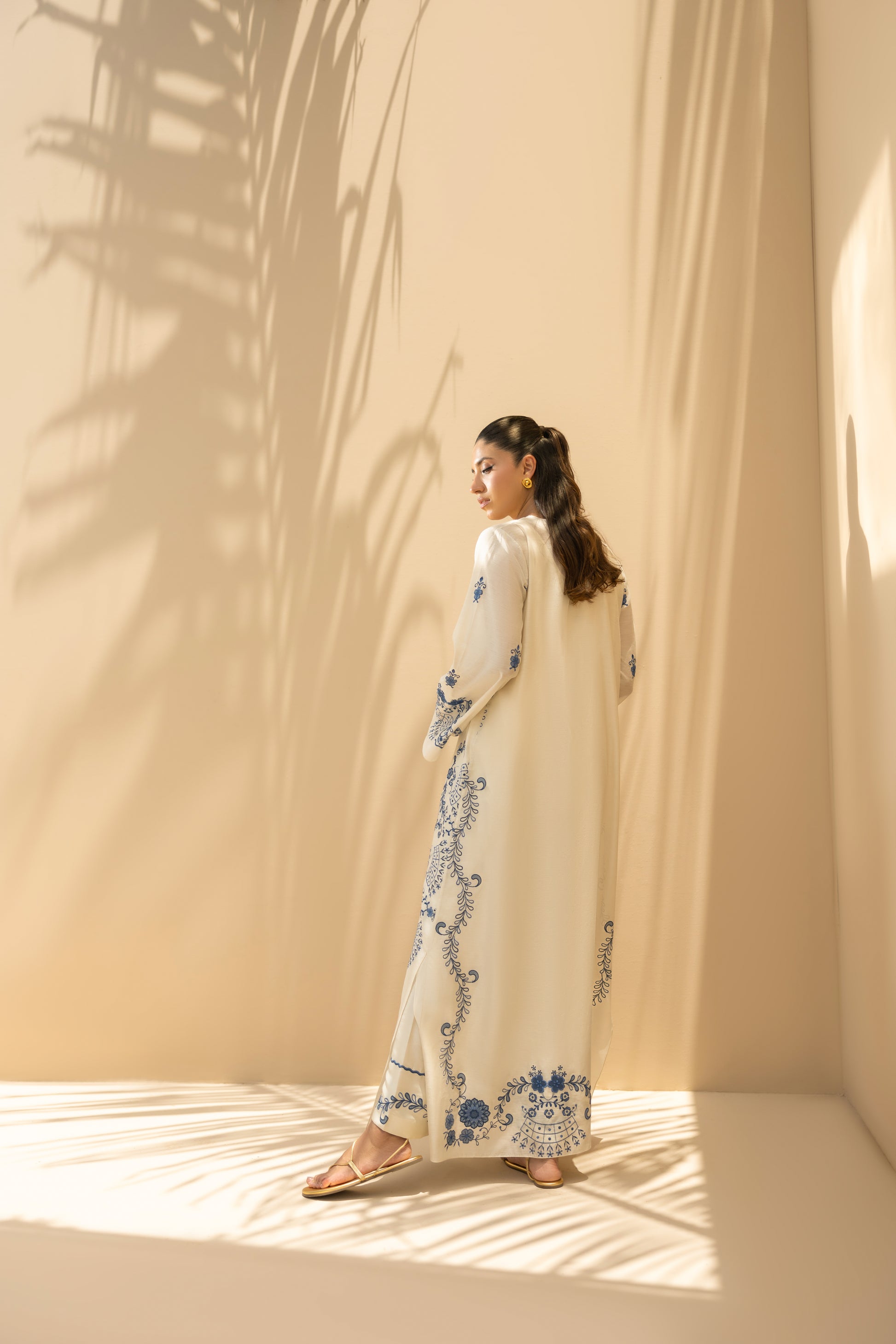 In muted ivory khaddi silk, a flowing kaftan unfolds with cobalt resham embroidery and azure appliqué details. Florals and arabesques entwine across the front, sleeves and hem, echoing quiet grandeur. It is paired with matching rawsilk culottes adorned with resham work.