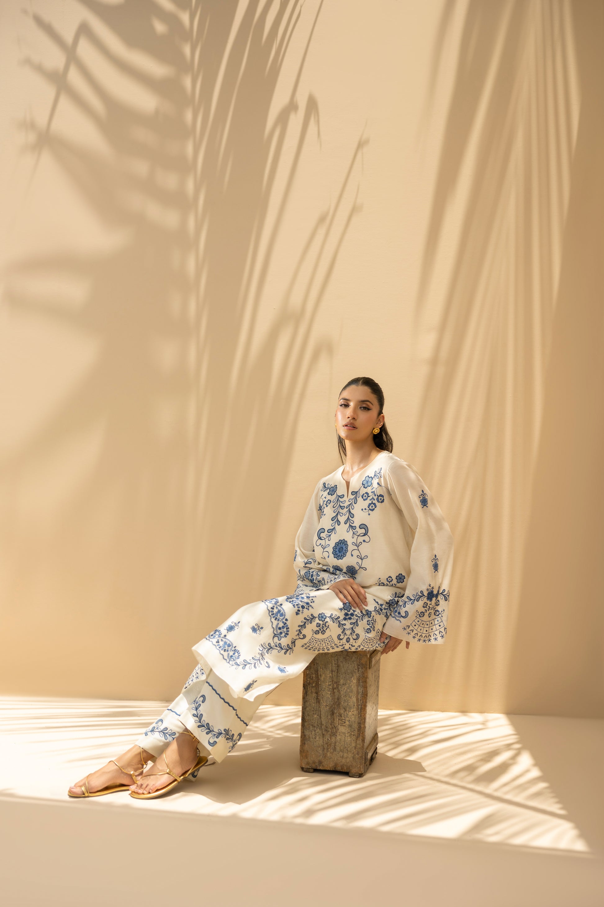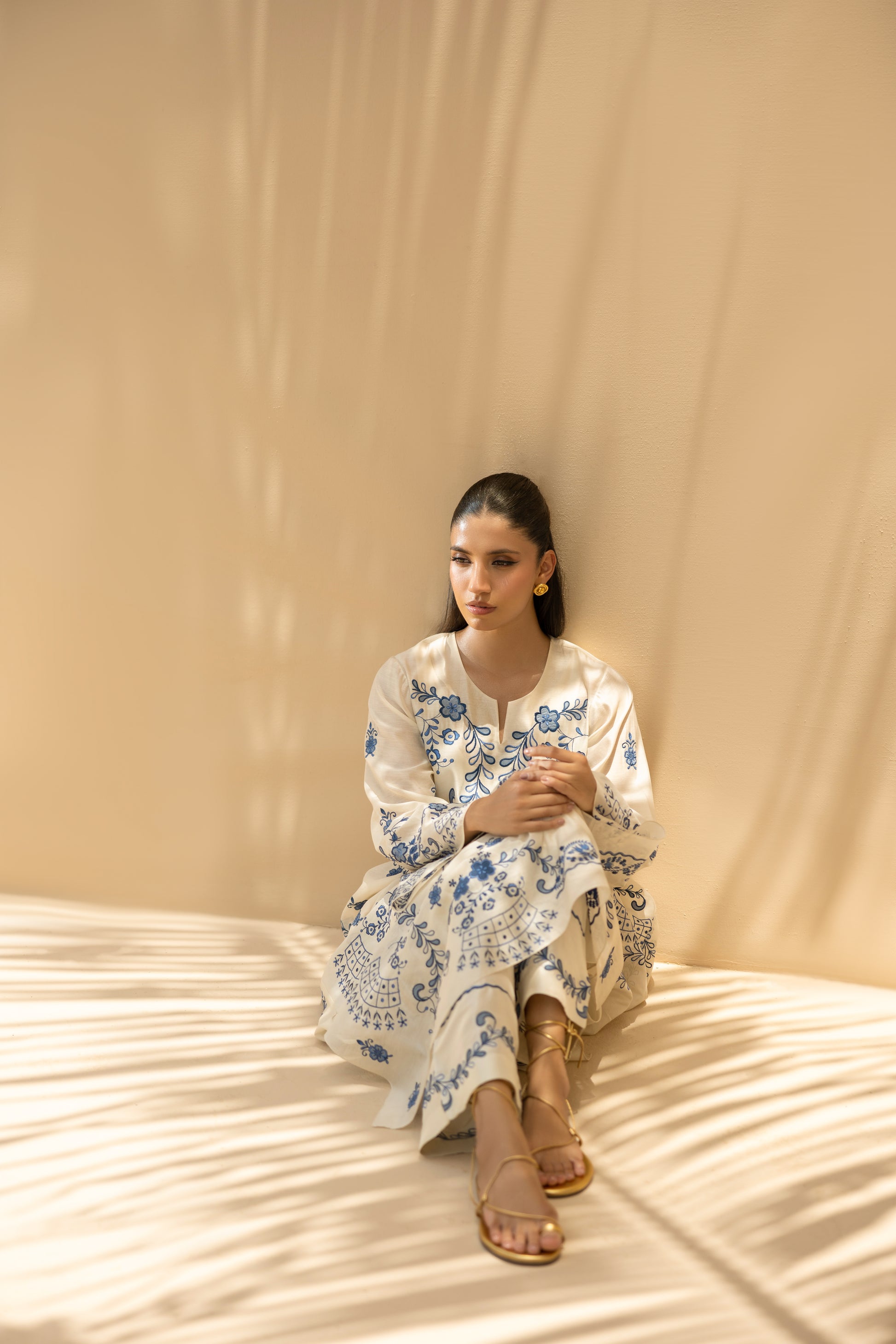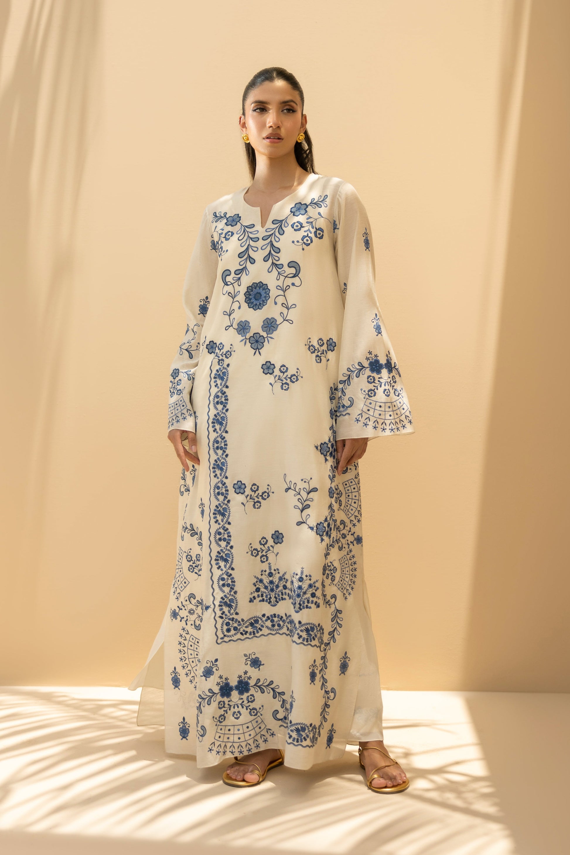 In muted ivory khaddi silk, a flowing kaftan unfolds with cobalt resham embroidery and azure appliqué details. Florals and arabesques entwine across the front, sleeves and hem, echoing quiet grandeur. It is paired with matching rawsilk culottes adorned with resham work.