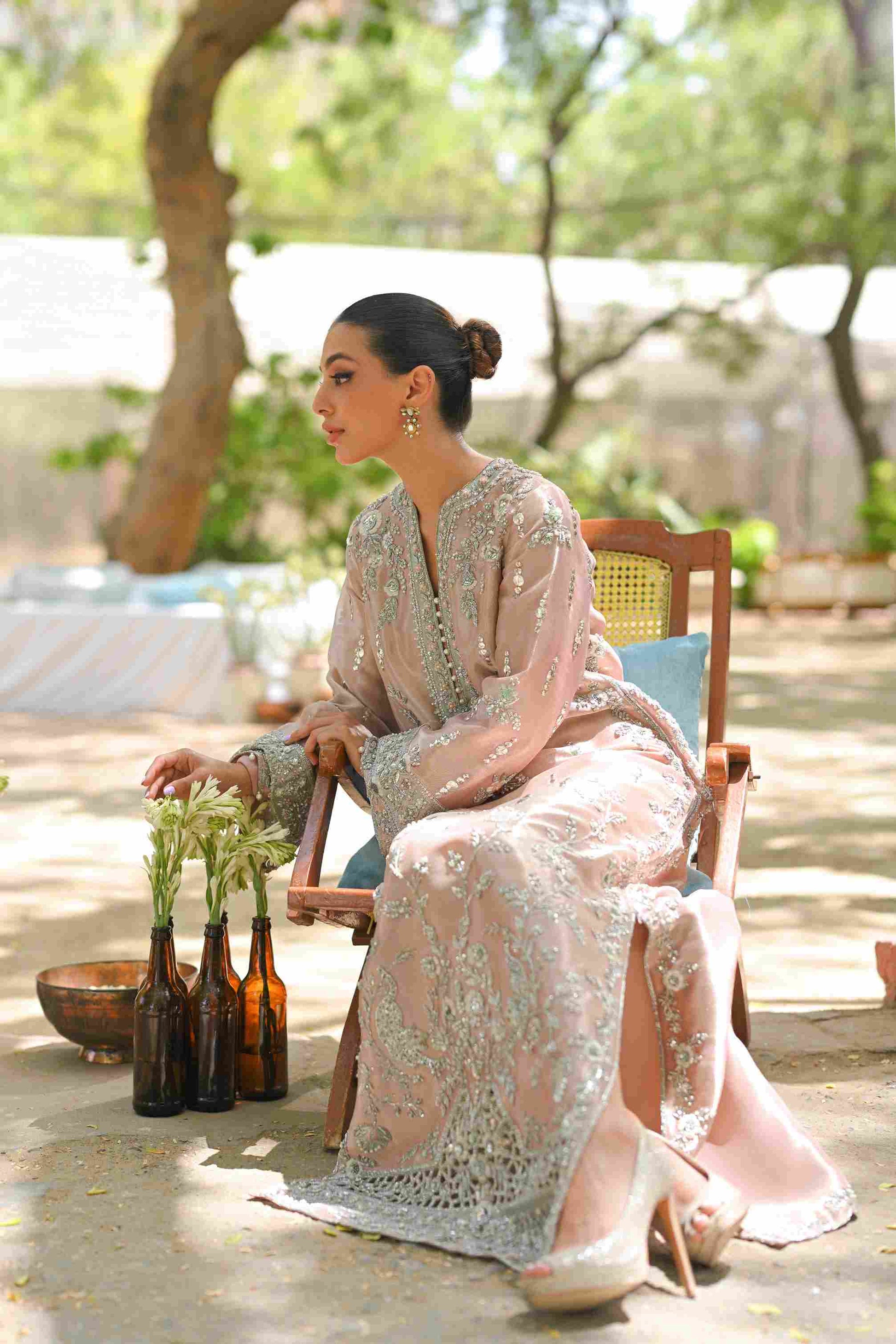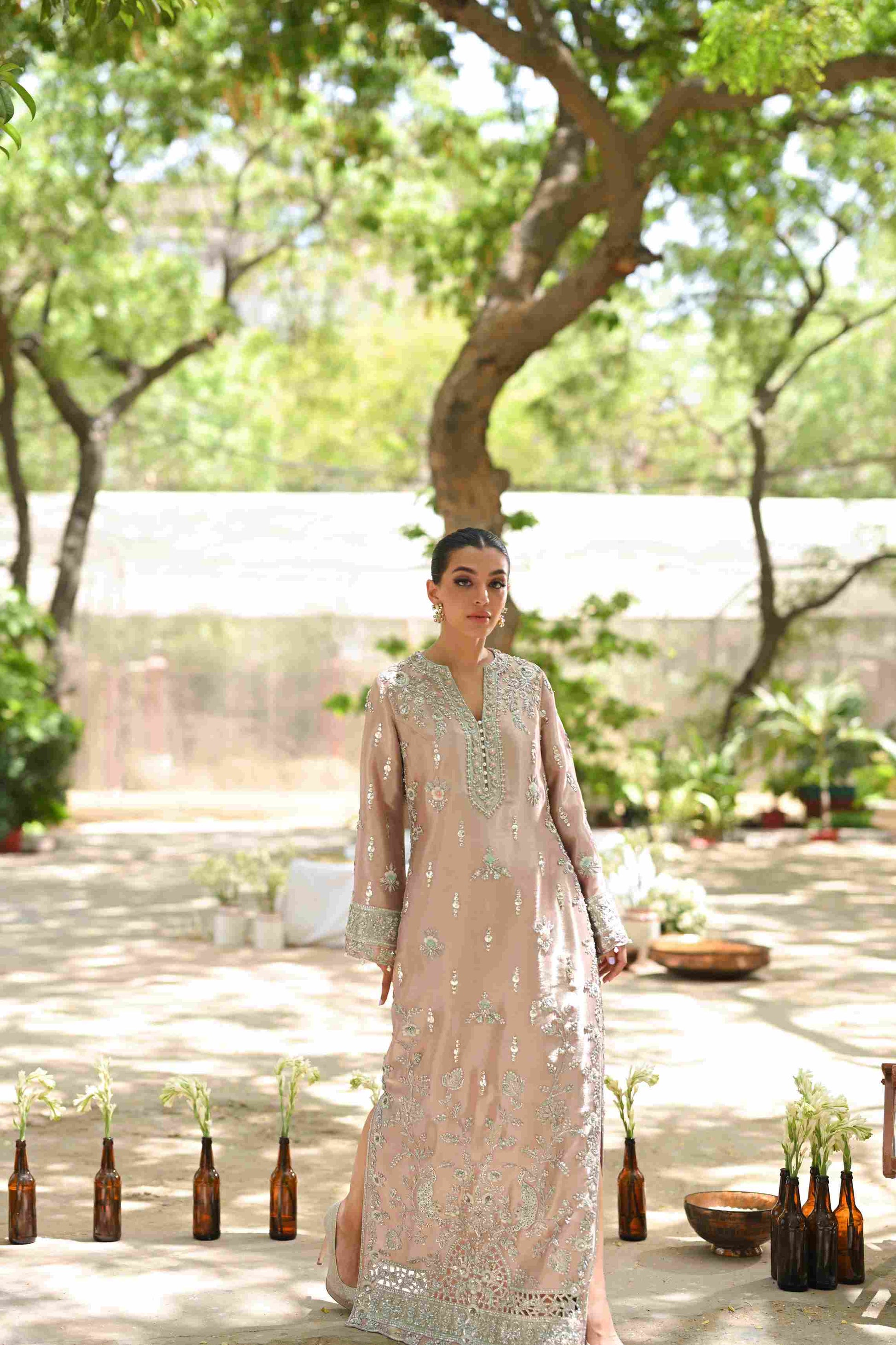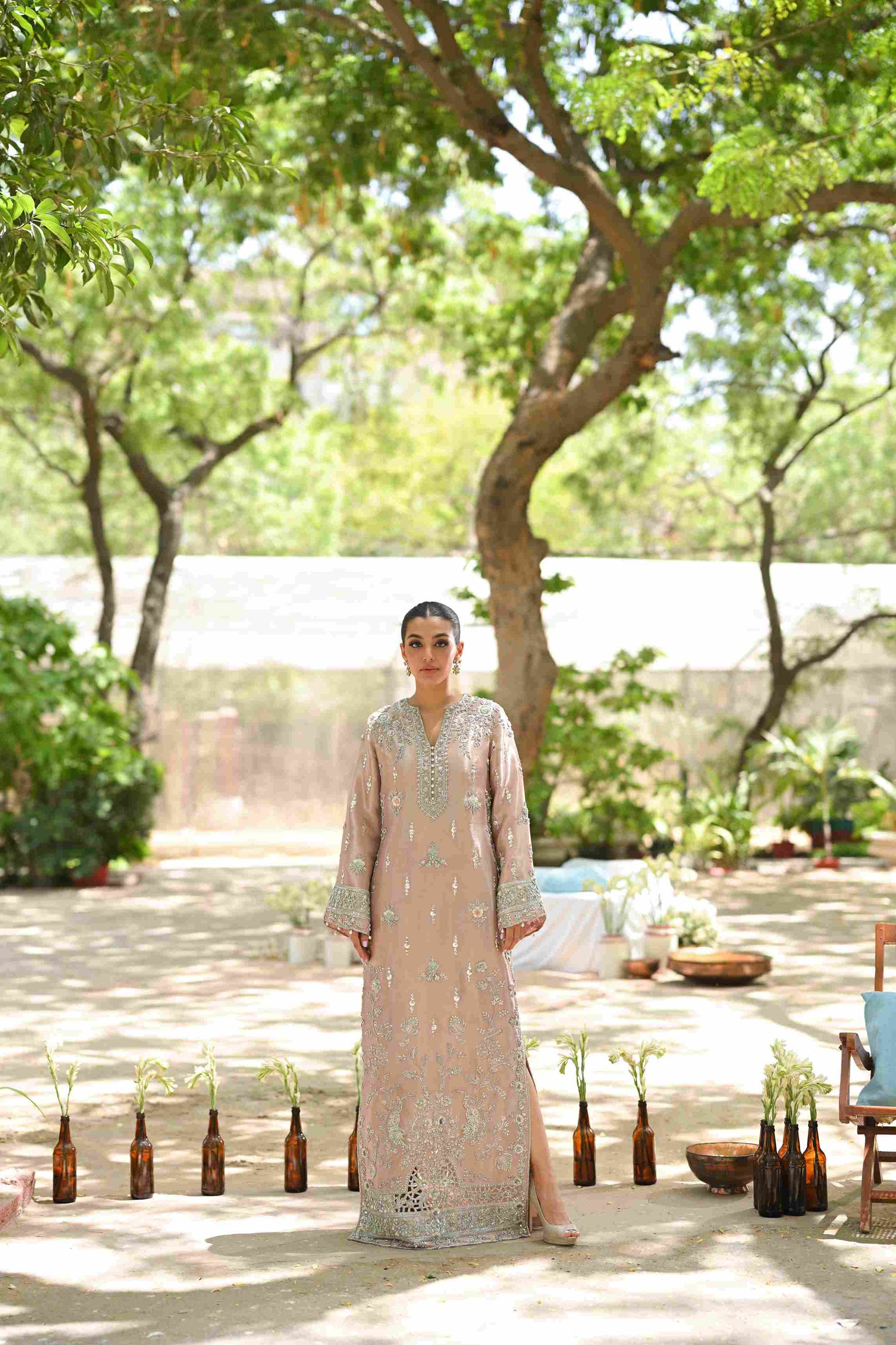 A contemporary take on a classic kaftan silhouette, cut from tissue, in an elegant shade of blush pink. Dispersed kamdani and zardoze details with a cutworked hem elevate the look.